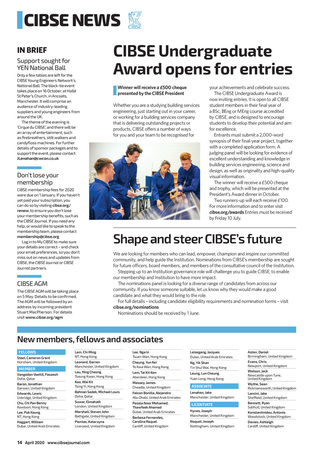 CIBSE NEWS IN BRIEF Support sought for YEN National Ball Only a few tables are left for the CIBSE Young Engineers Networks National Ball. The black-tie event takes place on 16 October, at Hall St Peters Church, in Ancoats, Manchester. It will comprise an audience of industry-leading suppliers and young engineers from around the UK. The theme of the evening is Cirque du CIBSE, and there will be an array of entertainment, such as firebreathers, stilt walkers and candyfloss machines. For further details of sponsor packages and to support the event, please contact JLenahan@cwcon.co.uk CIBSE Undergraduate Award opens for entries Winner will receive a 500 cheque presented by the CIBSE President Whether you are a studying building services engineering, just starting out in your career, or working for a building services company that is delivering outstanding projects or products, CIBSE offers a number of ways for you and your team to be recognised for Dont lose your membership CIBSE membership fees for 2020 were due on 1 January. If you havent yet paid your subscription, you can do so by visiting cibse.org/ renew, to ensure you dont lose your membership benefits, such as the CIBSE Journal. If you need any help, or would like to speak to the membership team, please contact membership@cibse.org Log in to My CIBSE to make sure your details are correct and check your email preferences, so you dont miss out on news and updates from CIBSE, the CIBSE Journal or CIBSE Journal partners. CIBSE AGM The CIBSE AGM will be taking place on 5 May. Details to be confirmed. The AGM will be followed by an address by incoming president Stuart MacPherson. For details visit www.cibse.org/agm your achievements and celebrate success. The CIBSE Undergraduate Award is now inviting entries. It is open to all CIBSE student members in their final year of a BSc, BEng or MEng course accredited by CIBSE, and is designed to encourage students to develop their potential and aim for excellence. Entrants must submit a 2,000-word synopsis of their final-year project, together with a completed application form. A judging panel will be looking for evidence of excellent understanding and knowledge in building services engineering, science and design, as well as originality and high-quality visual information. The winner will receive a 500 cheque and trophy, which will be presented at the Presidents Award dinner in October. Two runners-up will each receive 100. For more information and to enter visit cibse.org/awards Entries must be received by Friday 10 July. Shape and steer CIBSEs future We are looking for members who can lead, empower, champion and inspire our committed community, and help guide the Institution. Nominations from CIBSEs membership are sought for future officers, board members, and members of the consultative council of the Institution. Stepping up to an Institution governance role will challenge you to guide CIBSE, to enable our membership and Institution to have more impact. The nominations panel is looking for a diverse range of candidates from across our community. If you know someone suitable, let us know why they would make a good candidate and what they would bring to the role. For full details including candidate eligibility requirements and nomination forms visit cibse.org/nominations Nominations should be received by 1 June. New members, fellows and associates FELLOWS Lam, Chi Ming NT, Hong Kong Lee, Nga In Tsuen Wan, Hong Kong Leisegang, Jacques Dubai, United Arab Emirates Aston, Daniel Birmingham, United Kingdom Leonard, Darren Manchester, United Kingdom Cheung, Yun Kei To Kwa Wan, Hong Kong Ng, Yik Shan Tin Shui Wai, Hong Kong Evans, Chris Newport, United Kingdom Lau, Hing Cheong Tseung Kwan, Hong Kong Lam, Tai Kit Ken Aberdeen, Hong Kong Leung, Lun Cheung Koo, Wai Kit Tsing Yi, Hong Kong Massey, James Cheadle, United Kingdom Bahnan Sadek, Michael Louis Doha, Qatar Falcon Bonilla, Alejandro Abu Dhabi, United Arab Emirates Chu, Chi Pan Benny Kowloon, Hong Kong Suwar, Elmahadi London, United Kingdom Lee, Pok Keung NT, Hong Kong Marshall, Steven John Bathgate, United Kingdom Pasala Noor Mohamed, Thawfeek Ahamed Dubai, United Arab Emirates Haggart, William Dubai, United Arab Emirates Piontas, Katarzyna Liverpool, United Kingdom Steel, Cameron Grant Horsham, United Kingdom MEMBER Vangodan Veettil, Faseesh Doha, Qatar Baron, Jonathan Darwen, United Kingdom Edwards, Lewis Uxbridge, United Kingdom Barbosa Fernandes, Carolina Raquel Cardiff, United Kingdom Yuen Long, Hong Kong ASSOCIATE Lenahan, Jake Manchester, United Kingdom LICENTIATE Hynes, Joseph Manchester, United Kingdom Noquet, Joseph Nottingham, United Kingdom Watson, Jack Newcastle upon Tyne, United Kingdom Wythe, Sean Rickmansworth, United Kingdom Lancini, Jake Sheffield, United Kingdom Bennett, Ryan Solihull, United Kingdom Konstantinidou, Antonia Woodstock, United Kingdom Davies, Ashleigh Cardiff, United Kingdom 14 April 2020 www.cibsejournal.com CIBSE Apr20 pp14-15 CIBSE News.indd 14 20/03/2020 16:26