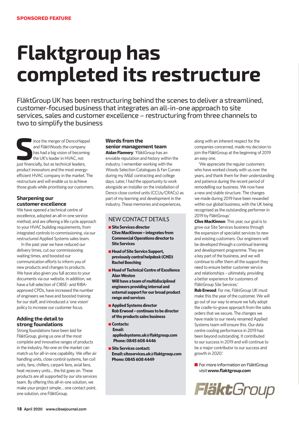 SPONSORED FEATURE Flaktgroup has completed its restructure FlktGroup UK has been restructuring behind the scenes to deliver a streamlined, customer-focused business that integrates an all-in-one approach to site services, sales and customer excellence restructuring from three channels to two to simplify the business S ince the merger of DencoHappel and FlktWoods the company has had a big vision of becoming the UKs leader in HVAC, not just nancially, but as technical leaders, product innovators and the most energyefcient HVAC company in the market. The restructure and will enable us to achieve those goals while prioritising our customers. Sharpening our customer excellence We have opened a technical centre of excellence, adopted an all-in-one service method, and are offering a life cycle approach to your HVAC building requirements, from integrated controls to commissioning, via our restructured Applied Systems sales team. In the past year we have reduced our delivery times, cut our commissioning waiting times, and boosted our communication efforts to inform you of new products and changes to products. We have also given you full access to your documents via our website. In addition, we have a full selection of CIBSE- and RIBAapproved CPDs, have increased the number of engineers we have and boosted training for our staff, and introduced a one vision policy to increase our customer focus. Adding the detail to strong foundations Strong foundations have been laid for FlktGroup, giving us one of the most complete and innovative ranges of products in the industry. No-one on the market can match us for all-in-one capability. We offer air handling units, close control systems, fan coil units, fans, chillers, carpark fans, axial fans, heat recovery units the list goes on. These products are all supported by our site services team. By offering this all-in-one solution, we make your project simple one contact point, one solution, one FlktGroup. Words from the senior management team Aidan Flannery: FlktGroup has an enviable reputation and history within the industry. I remember working with the Woods Selection Catalogues & Fan Curves during my M&E contracting and college days. Later, I had the opportunity to work alongside an installer on the installation of Denco close control units (CCUs/CRACs) as part of my learning and development in the industry. These memories and experiences, NEW CONTACT DETAILS Site Services director Clive MacKinnon integrates from Commercial Operations director to Site Services Head of Site Service Support, previously central helpdesk (CHD) Rachel Beeching Head of Technical Centre of Excellence Alan Weston Will have a team of multidisciplined engineers providing internal and external support for our broad product range and services Applied Systems director Rob Erwood continues to be director of the products sales business Contacts: Email: appliedsystems.uk@aktgroup.com Phone: 0845 608 4446 Site Services contact: Email: siteservices.uk@aktgroup.com Phone: 0845 608 4449 along with an inherent respect for the companies concerned, made my decision to join the FlktGroup at the beginning of 2019 an easy one. We appreciate the regular customers who have worked closely with us over the years, and thank them for their understanding and patience during the recent period of remodelling our business. We now have a new and stable structure. The changes we made during 2019 have been rewarded within our global business, with the UK being recognised as the outstanding performer in 2019 by FlktGroup. Clive MacKinnon: This year, our goal is to grow our Site Services business through the expansion of specialist services to new and existing customers. Our engineers will be developed through a continual learning and development programme. They are a key part of the business, and we will continue to offer them all the support they need to ensure better customer service and relationships ultimately, providing a better experience for customers of FlktGroup Site Services. Rob Erwood: For me, FlktGroup UK must make this the year of the customer. We will go out of our way to ensure we fully adopt the cradle-to-grave approach from the sales orders that we secure. The changes we have made to our newly renamed Applied Systems team will ensure this. Our data centre cooling performance in 2019 has been beyond outstanding. It contributed to our success in 2019 and will continue to be a major contributor to our success and growth in 2020. For more information on FlktGroup visit www.aktgroup.com 18 April 2020 www.cibsejournal.com Flakt DPS Adv CPL.indd 18 18/03/2020 14:26