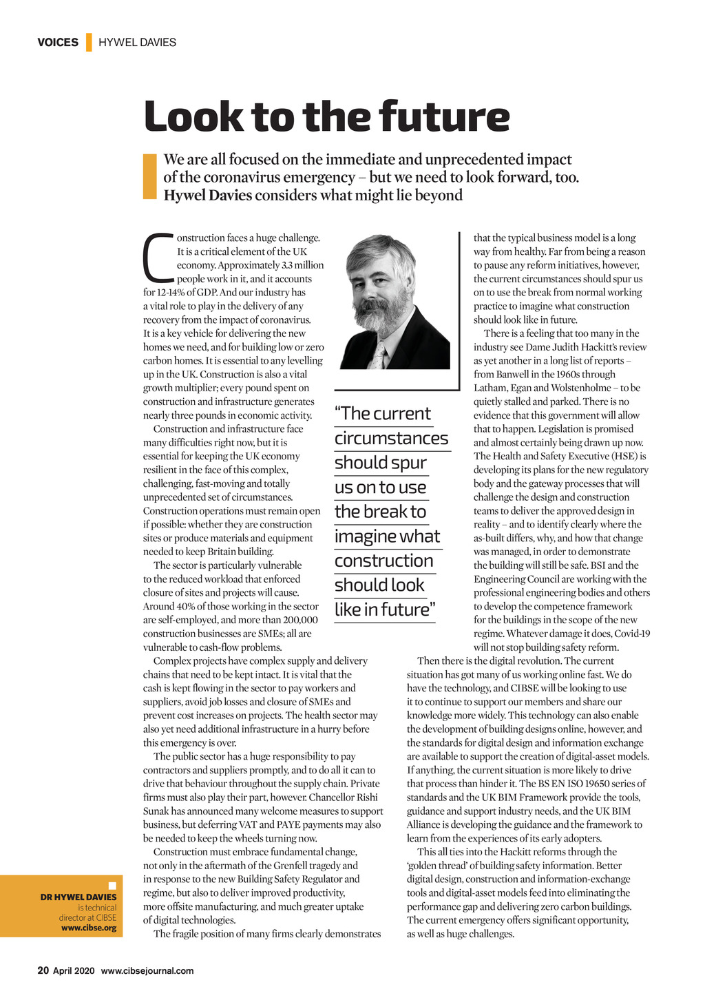 VOICES | HYWEL DAVIES Look to the future We are all focused on the immediate and unprecedented impact of the coronavirus emergency but we need to look forward, too. Hywel Davies considers what might lie beyond C onstruction faces a huge challenge. It is a critical element of the UK economy. Approximately 3.3 million people work in it, and it accounts for 12-14% of GDP. And our industry has a vital role to play in the delivery of any recovery from the impact of coronavirus. It is a key vehicle for delivering the new homes we need, and for building low or zero carbon homes. It is essential to any levelling up in the UK. Construction is also a vital growth multiplier; every pound spent on construction and infrastructure generates nearly three pounds in economic activity. Construction and infrastructure face many difficulties right now, but it is essential for keeping the UK economy resilient in the face of this complex, challenging, fast-moving and totally unprecedented set of circumstances. Construction operations must remain open if possible: whether they are construction sites or produce materials and equipment needed to keep Britain building. The sector is particularly vulnerable to the reduced workload that enforced closure of sites and projects will cause. Around 40% of those working in the sector are self-employed, and more than 200,000 construction businesses are SMEs; all are vulnerable to cash-flow problems. Complex projects have complex supply and delivery chains that need to be kept intact. It is vital that the cash is kept flowing in the sector to pay workers and suppliers, avoid job losses and closure of SMEs and prevent cost increases on projects. The health sector may also yet need additional infrastructure in a hurry before this emergency is over. The public sector has a huge responsibility to pay contractors and suppliers promptly, and to do all it can to drive that behaviour throughout the supply chain. Private firms must also play their part, however. Chancellor Rishi Sunak has announced many welcome measures to support business, but deferring VAT and PAYE payments may also be needed to keep the wheels turning now. Construction must embrace fundamental change, not only in the aftermath of the Grenfell tragedy and in response to the new Building Safety Regulator and regime, but also to deliver improved productivity, more offsite manufacturing, and much greater uptake of digital technologies. The fragile position of many firms clearly demonstrates that the typical business model is a long way from healthy. Far from being a reason to pause any reform initiatives, however, the current circumstances should spur us on to use the break from normal working practice to imagine what construction should look like in future. There is a feeling that too many in the industry see Dame Judith Hackitts review as yet another in a long list of reports from Banwell in the 1960s through Latham, Egan and Wolstenholme to be quietly stalled and parked. There is no evidence that this government will allow that to happen. Legislation is promised and almost certainly being drawn up now. The Health and Safety Executive (HSE) is developing its plans for the new regulatory body and the gateway processes that will challenge the design and construction teams to deliver the approved design in reality and to identify clearly where the as-built differs, why, and how that change was managed, in order to demonstrate the building will still be safe. BSI and the Engineering Council are working with the professional engineering bodies and others to develop the competence framework for the buildings in the scope of the new regime. Whatever damage it does, Covid-19 will not stop building safety reform. Then there is the digital revolution. The current situation has got many of us working online fast. We do have the technology, and CIBSE will be looking to use it to continue to support our members and share our knowledge more widely. This technology can also enable the development of building designs online, however, and the standards for digital design and information exchange are available to support the creation of digital-asset models. If anything, the current situation is more likely to drive that process than hinder it. The BS EN ISO 19650 series of standards and the UK BIM Framework provide the tools, guidance and support industry needs, and the UK BIM Alliance is developing the guidance and the framework to learn from the experiences of its early adopters. This all ties into the Hackitt reforms through the golden thread of building safety information. Better digital design, construction and information-exchange tools and digital-asset models feed into eliminating the performance gap and delivering zero carbon buildings. The current emergency offers significant opportunity, as well as huge challenges. The current circumstances should spur us on to use the break to imagine what construction should look like in future DR HYWEL DAVIES is technical director at CIBSE www.cibse.org 20 April 2020 www.cibsejournal.com CIBSE Apr20 pp20 Hywel Davies.indd 20 20/03/2020 16:27