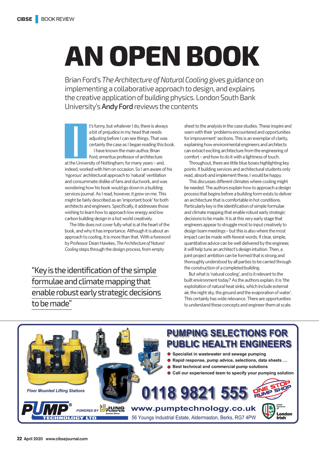 CIBSE | BOOK REVIEW AN OPEN BOOK Brian Fords The Architecture of Natural Cooling gives guidance on implementing a collaborative approach to design, and explains the creative application of building physics. London South Bank Universitys Andy Ford reviews the contents I ts funny, but whatever I do, there is always a bit of prejudice in my head that needs adjusting before I can see things. That was certainly the case as I began reading this book. I have known the main author, Brian Ford, emeritus professor of architecture at the University of Nottingham, for many years and, indeed, worked with him on occasion. So I am aware of his rigorous architectural approach to natural ventilation and consummate dislike of fans and ductwork, and was wondering how his book would go down in a building services journal. As I read, however, it grew on me. This might be fairly described as an important book for both architects and engineers. Specifically, it addresses those wishing to learn how to approach low energy and low carbon building design in a hot world creatively. The title does not cover fully what is at the heart of the book, and why it has importance. Although it is about an approach to cooling, it is more than that. With a foreword by Professor Dean Hawkes, The Architecture of Natural Cooling steps through the design process, from empty Key is the identification of the simple formulae and climate mapping that enable robust early strategic decisions to be made sheet to the analysis in the case studies. These inspire and warn with their problems encountered and opportunities for improvement sections. This is an exemplar of clarity, explaining how environmental engineers and architects can extract exciting architecture from the engineering of comfort and how to do it with a lightness of touch. Throughout, there are little blue boxes highlighting key points. If building services and architectural students only read, absorb and implement these, I would be happy. This discusses different climates where cooling might be needed. The authors explain how to approach a design process that begins before a building form exists to deliver an architecture that is comfortable in hot conditions. Particularly key is the identification of simple formulae and climate mapping that enable robust early strategic decisions to be made. It is at this very early stage that engineers appear to struggle most to input creatively to design team meetings but this is also where the most impact can be made with fewest words. If clear, simple, quantitative advice can be well delivered by the engineer, it will help tune an architects design intuition. Then, a joint project ambition can be formed that is strong and thoroughly understood by all parties to be carried through the construction of a completed building. But what is natural cooling, and is it relevant to the built environment today? As the authors explain, it is the exploitation of natural heat sinks, which include external air, the night sky, the ground and the evaporation of water. This certainly has wide relevance. There are opportunities to understand these concepts and engineer them at scale. 3803,1*6(/(&7,216)25 38%/,&+($/7+(1*,1((56 6SHFLDOLVWLQZDVWHZDWHUDQGVHZDJHSXPSLQJ 5DSLGUHVSRQVHSXPSDGYLFHVHOHFWLRQVGDWDVKHHWV %HVWWHFKQLFDODQGFRPPHUFLDOSXPSVROXWLRQV ROXWLR &DOORXUH[SHULHQFHGWHDPWRVSHFLI\\RXUSXPSLQJVROXWLRQ )ORRU0RXQWHG/LIWLQJ6WDWLRQV 32:(5( %< ZZZSXPSWHFKQRORJ\FRXN N