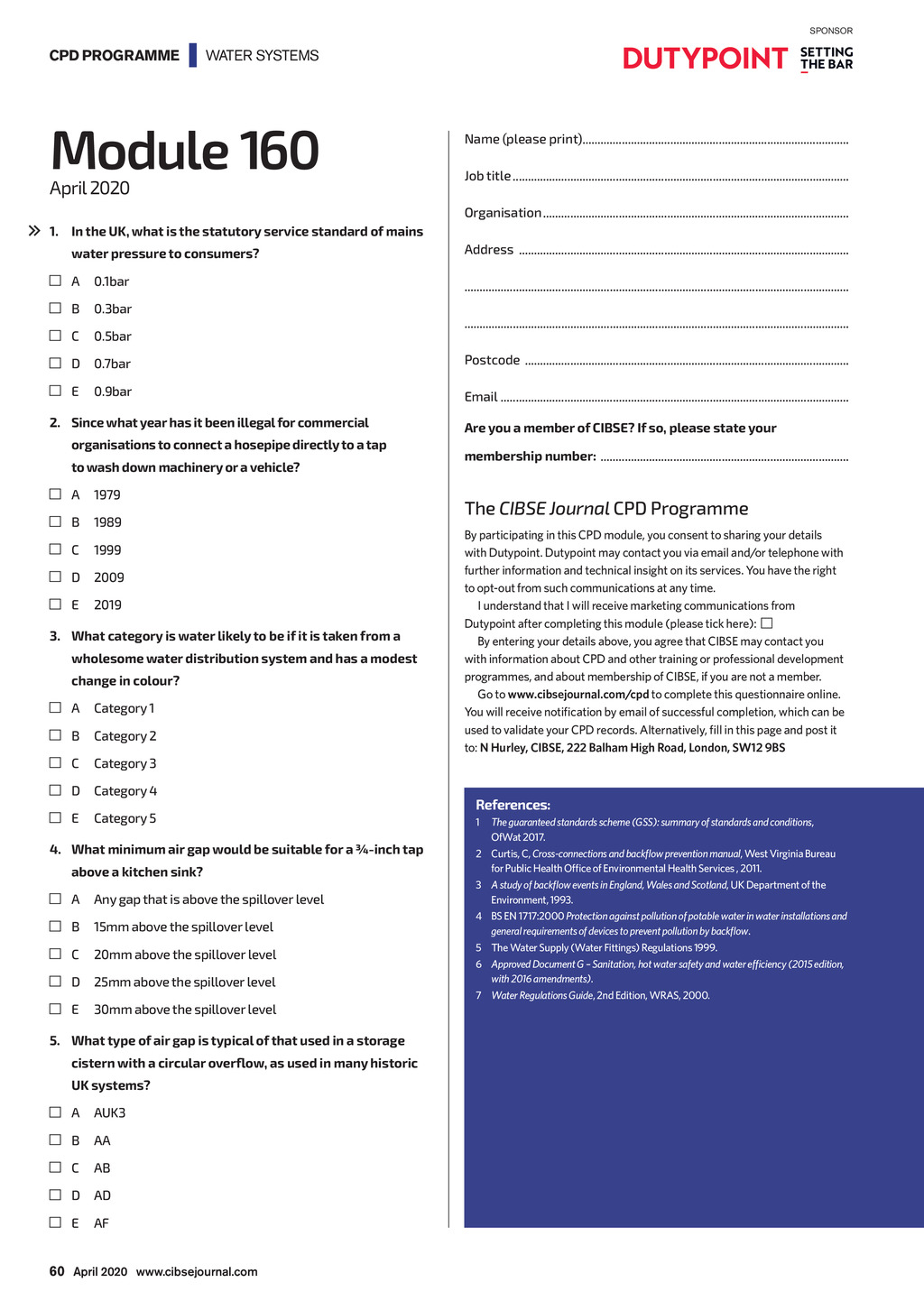 SPONSOR CPD PROGRAMME | WATER SYSTEMS Module 160 April 2020 Name (please print)......................................................................................... Job title................................................................................................................ Organisation...................................................................................................... 1.In the UK, what is the statutory service standard of mains water pressure to consumers? Address .............................................................................................................. A 0.1bar ............................................................................................................................... B 0.3bar C 0.5bar ............................................................................................................................... 0.7bar Postcode ............................................................................................................ E 0.9bar Email .................................................................................................................... D 2.Since what year has it been illegal for commercial organisations to connect a hosepipe directly to a tap to wash down machinery or a vehicle? A 1979 B 1989 C 1999 D 2009 E 2019 3.What category is water likely to be if it is taken from a wholesome water distribution system and has a modest change in colour? A Category 1 B Category 2 Are you a member of CIBSE? If so, please state your membership number: ................................................................................... The CIBSE Journal CPD Programme By participating in this CPD module, you consent to sharing your details with Dutypoint. Dutypoint may contact you via email and/or telephone with further information and technical insight on its services. You have the right to opt-out from such communications at any time. I understand that I will receive marketing communications from Dutypoint after completing this module (please tick here): By entering your details above, you agree that CIBSE may contact you with information about CPD and other training or professional development programmes, and about membership of CIBSE, if you are not a member. Go to www.cibsejournal.com/cpd to complete this questionnaire online. You will receive notification by email of successful completion, which can be used to validate your CPD records. Alternatively, fill in this page and post it to: N Hurley, CIBSE, 222 Balham High Road, London, SW12 9BS C Category 3 D Category 4 E Category 5 4.What minimum air gap would be suitable for a -inch tap above a kitchen sink? A Any gap that is above the spillover level B 15mm above the spillover level C 20mm above the spillover level D 25mm above the spillover level E 30mm above the spillover level References: 1 The guaranteed standards scheme (GSS): summary of standards and conditions, OfWat 2017. 2 Curtis, C, Cross-connections and backflow prevention manual, West Virginia Bureau for Public Health Office of Environmental Health Services , 2011. 3 A study of backflow events in England, Wales and Scotland, UK Department of the Environment, 1993. 4 BS EN 1717:2000 Protection against pollution of potable water in water installations and general requirements of devices to prevent pollution by backflow. 5 The Water Supply (Water Fittings) Regulations 1999. 6 Approved Document G Sanitation, hot water safety and water efficiency (2015 edition, with 2016 amendments). 7 Water Regulations Guide, 2nd Edition, WRAS, 2000. 5.What type of air gap is typical of that used in a storage cistern with a circular overflow, as used in many historic UK systems? A AUK3 B AA C AB D AD E AF 60 April 2020 www.cibsejournal.com CIBSE Apr20 pp57-60 CPD v3.indd 60 20/03/2020 16:30