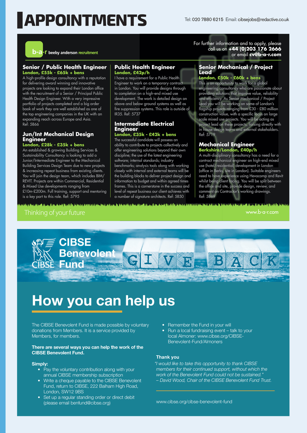 APPOINTMENTS Tel: 020 7880 6215 Email: cibsejobs@redactive.co.uk CIBSE Benevolent Fund How you can help us The CIBSE Benevolent Fund is made possible by voluntary donations from Members. It is a service provided by Members, for members. There are several ways you can help the work of the CIBSE Benevolent Fund. Simply: Pay the voluntary contribution along with your annual CIBSE membership subscription Write a cheque payable to the CIBSE Benevolent Fund, return to CIBSE, 222 Balham High Road, London, SW12 9BS Set up a regular standing order or direct debit (please email benfund@cibse.org) Remember the Fund in your will Run a local fundraising event talk to your local Almoner: www.cibse.org/CIBSEBenevolent-Fund/Almoners Thank you I would like to take this opportunity to thank CIBSE members for their continued support, without which the work of the Benevolent Fund could not be sustained. David Wood, Chair of the CIBSE Benevolent Fund Trust. www.cibse.org/cibse-benevolent-fund 64 April 2020 www.cibsejournal.com p64.CIBSEMagAPR20.indd 64 18/03/2020 14:55