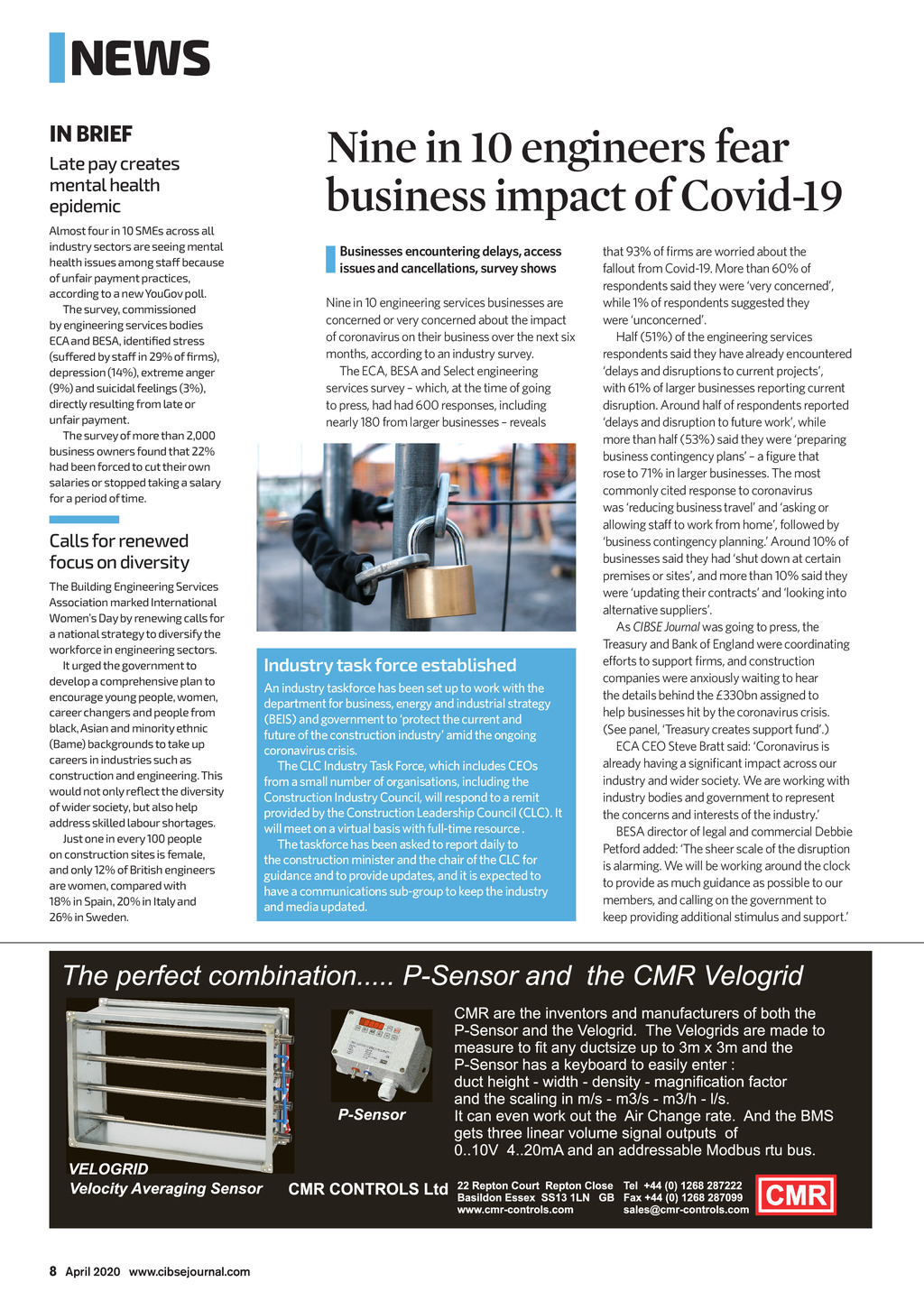 EWS IN BRIEF Late pay creates mental health epidemic Almost four in 10 SMEs across all industry sectors are seeing mental health issues among staff because of unfair payment practices, according to a new YouGov poll. The survey, commissioned by engineering services bodies ECA and BESA, identified stress (suffered by staff in 29% of firms), depression (14%), extreme anger (9%) and suicidal feelings (3%), directly resulting from late or unfair payment. The survey of more than 2,000 business owners found that 22% had been forced to cut their own salaries or stopped taking a salary for a period of time. Nine in 10 engineers fear business impact of Covid-19 Businesses encountering delays, access issues and cancellations, survey shows Nine in 10 engineering services businesses are concerned or very concerned about the impact of coronavirus on their business over the next six months, according to an industry survey. The ECA, BESA and Select engineering services survey which, at the time of going to press, had had 600 responses, including nearly 180 from larger businesses reveals Calls for renewed focus on diversity The Building Engineering Services Association marked International Womens Day by renewing calls for a national strategy to diversify the workforce in engineering sectors. It urged the government to develop a comprehensive plan to encourage young people, women, career changers and people from black, Asian and minority ethnic (Bame) backgrounds to take up careers in industries such as construction and engineering. This would not only reflect the diversity of wider society, but also help address skilled labour shortages. Just one in every 100 people on construction sites is female, and only 12% of British engineers are women, compared with 18% in Spain, 20% in Italy and 26% in Sweden. Industry task force established An industry taskforce has been set up to work with the department for business, energy and industrial strategy (BEIS) and government to protect the current and future of the construction industry amid the ongoing coronavirus crisis. The CLC Industry Task Force, which includes CEOs from a small number of organisations, including the Construction Industry Council, will respond to a remit provided by the Construction Leadership Council (CLC). It will meet on a virtual basis with full-time resource . The taskforce has been asked to report daily to the construction minister and the chair of the CLC for guidance and to provide updates, and it is expected to have a communications sub-group to keep the industry and media updated. that 93% of firms are worried about the fallout from Covid-19. More than 60% of respondents said they were very concerned, while 1% of respondents suggested they were unconcerned. Half (51%) of the engineering services respondents said they have already encountered delays and disruptions to current projects, with 61% of larger businesses reporting current disruption. Around half of respondents reported delays and disruption to future work, while more than half (53%) said they were preparing business contingency plans a figure that rose to 71% in larger businesses. The most commonly cited response to coronavirus was reducing business travel and asking or allowing staff to work from home, followed by business contingency planning. Around 10% of businesses said they had shut down at certain premises or sites, and more than 10% said they were updating their contracts and looking into alternative suppliers. As CIBSE Journal was going to press, the Treasury and Bank of England were coordinating efforts to support firms, and construction companies were anxiously waiting to hear the details behind the 330bn assigned to help businesses hit by the coronavirus crisis. (See panel, Treasury creates support fund.) ECA CEO Steve Bratt said: Coronavirus is already having a significant impact across our industry and wider society. We are working with industry bodies and government to represent the concerns and interests of the industry. BESA director of legal and commercial Debbie Petford added: The sheer scale of the disruption is alarming. We will be working around the clock to provide as much guidance as possible to our members, and calling on the government to keep providing additional stimulus and support. 8 April 2020 www.cibsejournal.com CIBSE Apr20 pp08-09 News.indd 8 20/03/2020 18:51