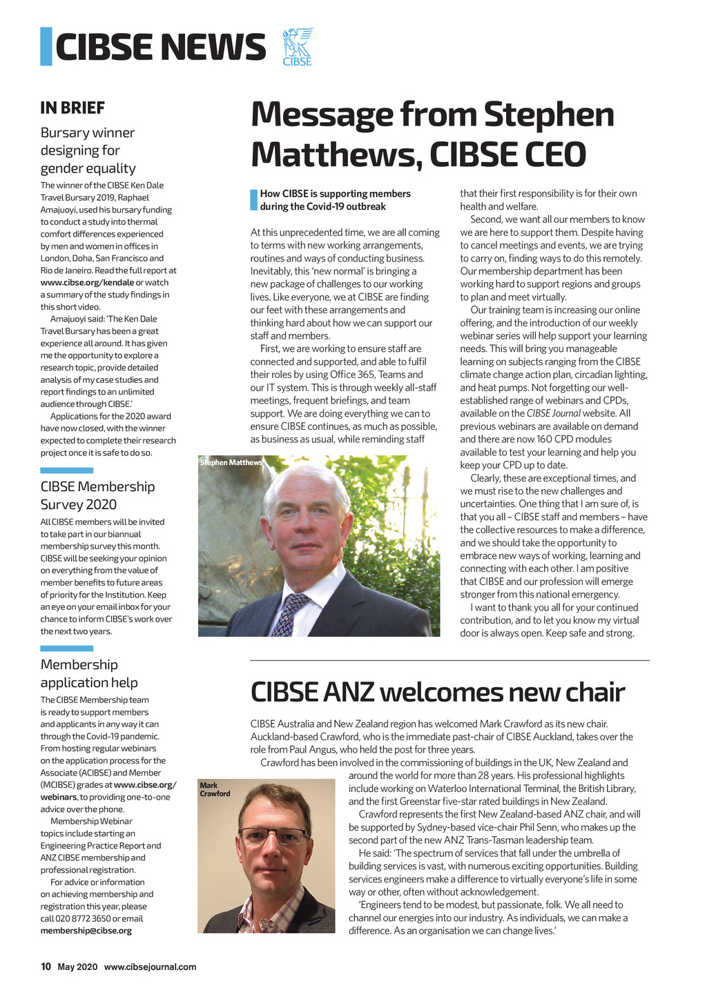CIBSE NEWS Message from Stephen Matthews, CIBSE CEO IN BRIEF Bursary winner designing for gender equality The winner of the CIBSE Ken Dale Travel Bursary 2019, Raphael Amajuoyi, used his bursary funding to conduct a study into thermal comfort differences experienced by men and women in offices in London, Doha, San Francisco and Rio de Janeiro. Read the full report at www.cibse.org/kendale or watch a summary of the study findings in this short video. Amajuoyi said: The Ken Dale Travel Bursary has been a great experience all around. It has given me the opportunity to explore a research topic, provide detailed analysis of my case studies and report findings to an unlimited audience through CIBSE. Applications for the 2020 award have now closed, with the winner expected to complete their research project once it is safe to do so. How CIBSE is supporting members during the Covid-19 outbreak At this unprecedented time, we are all coming to terms with new working arrangements, routines and ways of conducting business. Inevitably, this new normal is bringing a new package of challenges to our working lives. Like everyone, we at CIBSE are finding our feet with these arrangements and thinking hard about how we can support our staff and members. First, we are working to ensure staff are connected and supported, and able to fulfil their roles by using Office 365, Teams and our IT system. This is through weekly all-staff meetings, frequent briefings, and team support. We are doing everything we can to ensure CIBSE continues, as much as possible, as business as usual, while reminding staff Stephen Matthews CIBSE Membership Survey 2020 All CIBSE members will be invited to take part in our biannual membership survey this month. CIBSE will be seeking your opinion on everything from the value of member benefits to future areas of priority for the Institution. Keep an eye on your email inbox for your chance to inform CIBSEs work over the next two years. Membership application help The CIBSE Membership team is ready to support members and applicants in any way it can through the Covid-19 pandemic. From hosting regular webinars on the application process for the Associate (ACIBSE) and Member (MCIBSE) grades at www.cibse.org/ webinars, to providing one-to-one advice over the phone. Membership Webinar topics include starting an Engineering Practice Report and ANZ CIBSE membership and professional registration. For advice or information on achieving membership and registration this year, please call 020 8772 3650 or email membership@cibse.org that their first responsibility is for their own health and welfare. Second, we want all our members to know we are here to support them. Despite having to cancel meetings and events, we are trying to carry on, finding ways to do this remotely. Our membership department has been working hard to support regions and groups to plan and meet virtually. Our training team is increasing our online offering, and the introduction of our weekly webinar series will help support your learning needs. This will bring you manageable learning on subjects ranging from the CIBSE climate change action plan, circadian lighting, and heat pumps. Not forgetting our wellestablished range of webinars and CPDs, available on the CIBSE Journal website. All previous webinars are available on demand and there are now 160 CPD modules available to test your learning and help you keep your CPD up to date. Clearly, these are exceptional times, and we must rise to the new challenges and uncertainties. One thing that I am sure of, is that you all CIBSE staff and members have the collective resources to make a difference, and we should take the opportunity to embrace new ways of working, learning and connecting with each other. I am positive that CIBSE and our profession will emerge stronger from this national emergency. I want to thank you all for your continued contribution, and to let you know my virtual door is always open. Keep safe and strong. CIBSE ANZ welcomes new chair Mark Crawford CIBSE Australia and New Zealand region has welcomed Mark Crawford as its new chair. Auckland-based Crawford, who is the immediate past-chair of CIBSE Auckland, takes over the role from Paul Angus, who held the post for three years. Crawford has been involved in the commissioning of buildings in the UK, New Zealand and around the world for more than 28 years. His professional highlights include working on Waterloo International Terminal, the British Library, and the first Greenstar five-star rated buildings in New Zealand. Crawford represents the first New Zealand-based ANZ chair, and will be supported by Sydney-based vice-chair Phil Senn, who makes up the second part of the new ANZ Trans-Tasman leadership team. He said: The spectrum of services that fall under the umbrella of building services is vast, with numerous exciting opportunities. Building services engineers make a difference to virtually everyones life in some way or other, often without acknowledgement. Engineers tend to be modest, but passionate, folk. We all need to channel our energies into our industry. As individuals, we can make a difference. As an organisation we can change lives. 10 May 2020 www.cibsejournal.com CIBSE May20 pp10-11 CIBSE News.indd 10 24/04/2020 18:02