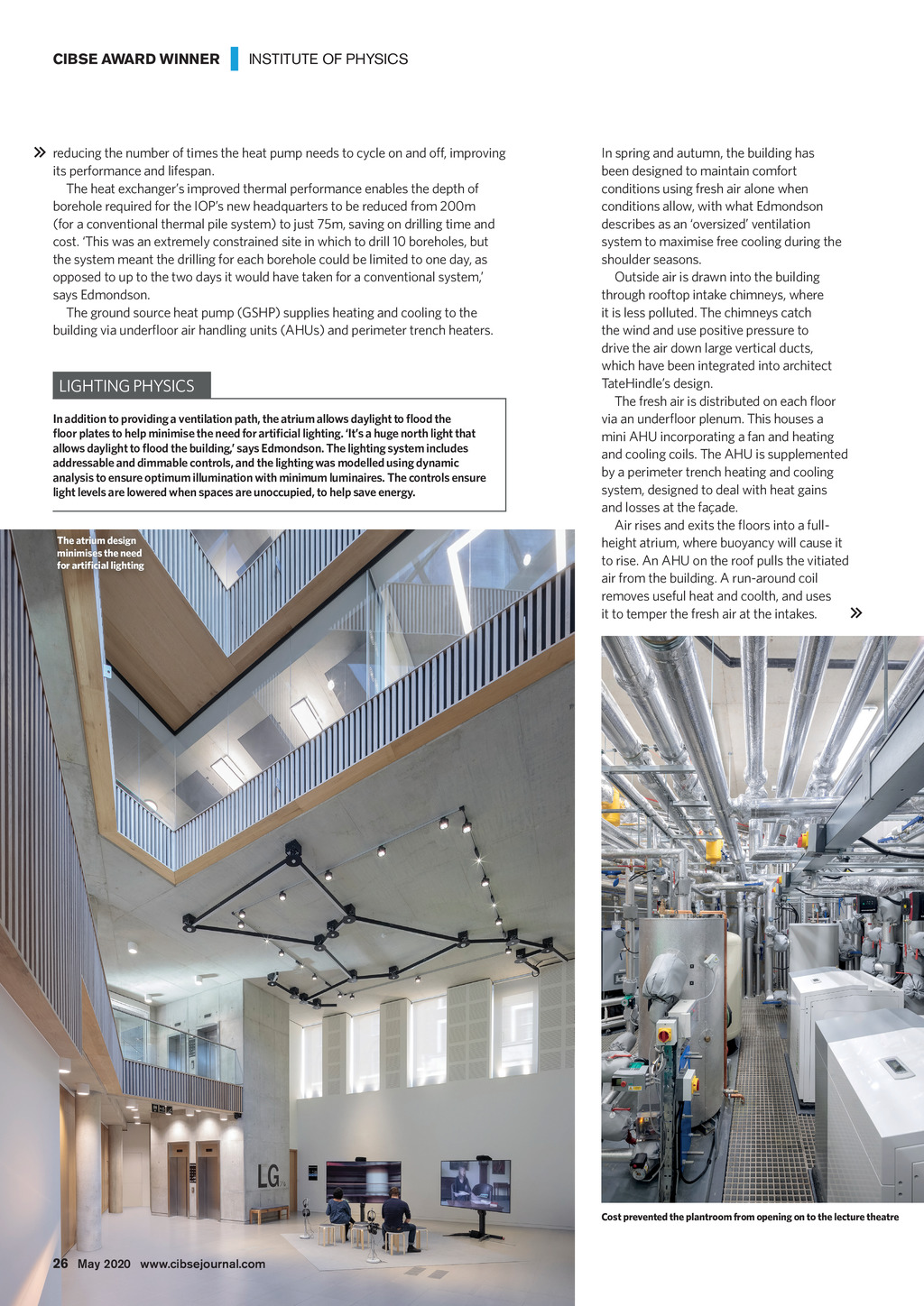 CIBSE AWARD WINNER | INSTITUTE OF PHYSICS reducing the number of times the heat pump needs to cycle on and off, improving its performance and lifespan. The heat exchangers improved thermal performance enables the depth of borehole required for the IOPs new headquarters to be reduced from 200m (for a conventional thermal pile system) to just 75m, saving on drilling time and cost. This was an extremely constrained site in which to drill 10 boreholes, but the system meant the drilling for each borehole could be limited to one day, as opposed to up to the two days it would have taken for a conventional system, says Edmondson. The ground source heat pump (GSHP) supplies heating and cooling to the building via underoor air handling units (AHUs) and perimeter trench heaters. LIGHTING PHYSICS In addition to providing a ventilation path, the atrium allows daylight to ood the oor plates to help minimise the need for articial lighting. Its a huge north light that allows daylight to ood the building, says Edmondson. The lighting system includes addressable and dimmable controls, and the lighting was modelled using dynamic analysis to ensure optimum illumination with minimum luminaires. The controls ensure light levels are lowered when spaces are unoccupied, to help save energy. The atrium design minimises the need for articial lighting In spring and autumn, the building has been designed to maintain comfort conditions using fresh air alone when conditions allow, with what Edmondson describes as an oversized ventilation system to maximise free cooling during the shoulder seasons. Outside air is drawn into the building through rooftop intake chimneys, where it is less polluted. The chimneys catch the wind and use positive pressure to drive the air down large vertical ducts, which have been integrated into architect TateHindles design. The fresh air is distributed on each oor via an underoor plenum. This houses a mini AHU incorporating a fan and heating and cooling coils. The AHU is supplemented by a perimeter trench heating and cooling system, designed to deal with heat gains and losses at the faade. Air rises and exits the oors into a fullheight atrium, where buoyancy will cause it to rise. An AHU on the roof pulls the vitiated air from the building. A run-around coil removes useful heat and coolth, and uses it to temper the fresh air at the intakes. Cost prevented the plantroom from opening on to the lecture theatre 26 May 2020 www.cibsejournal.com CIBSE May20 pp24-26, 28 Supp Institute of Physics.indd 26 24/04/2020 15:54