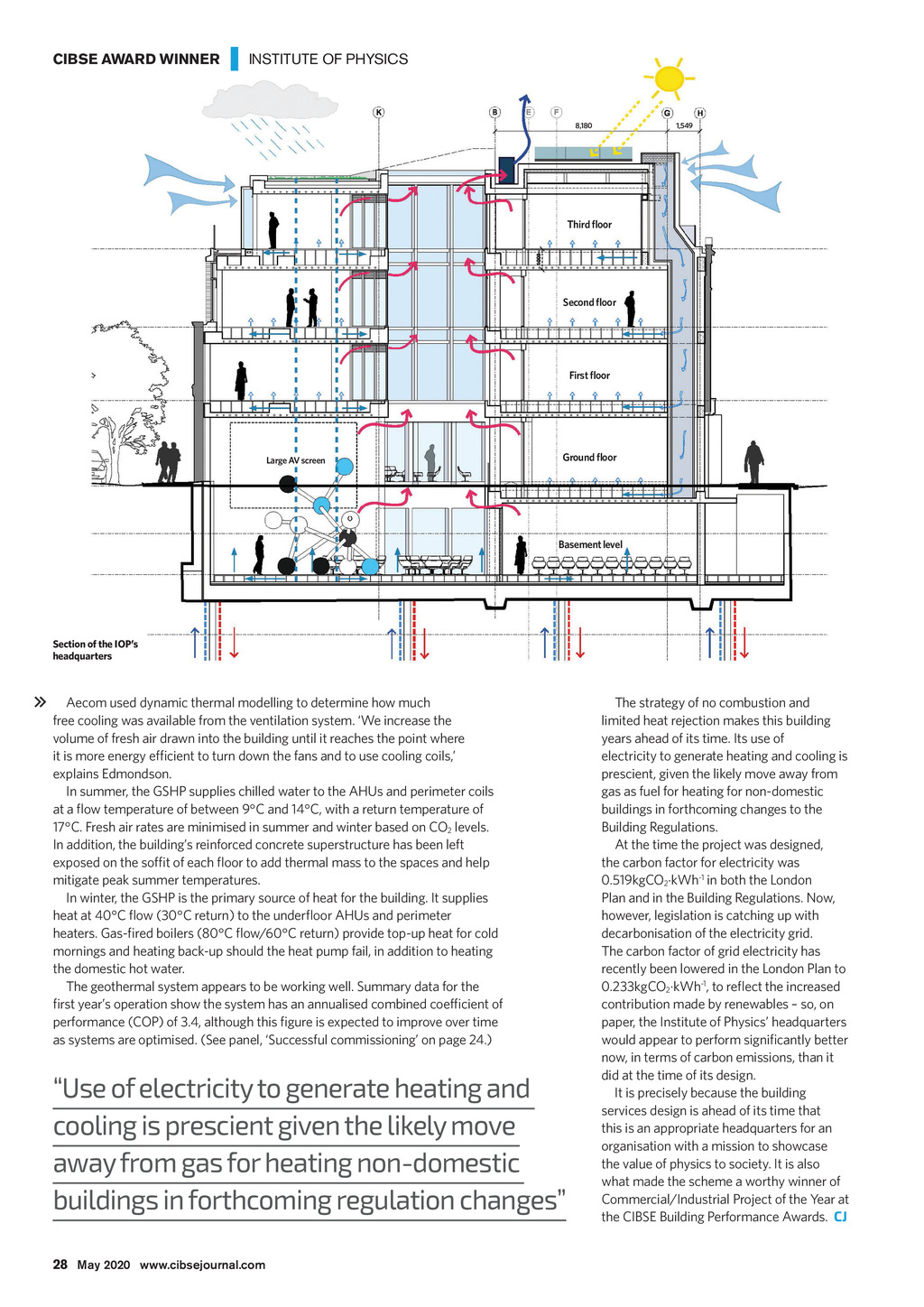 CIBSE AWARD WINNER | INSTITUTE OF PHYSICS 8,180 1,549 Third floor Second floor First floor Large AV screen Ground floor Basement level Section of the IOPs headquarters Aecom used dynamic thermal modelling to determine how much free cooling was available from the ventilation system. We increase the volume of fresh air drawn into the building until it reaches the point where it is more energy efficient to turn down the fans and to use cooling coils, explains Edmondson. In summer, the GSHP supplies chilled water to the AHUs and perimeter coils at a flow temperature of between 9C and 14C, with a return temperature of 17C. Fresh air rates are minimised in summer and winter based on CO2 levels. In addition, the buildings reinforced concrete superstructure has been left exposed on the soffit of each floor to add thermal mass to the spaces and help mitigate peak summer temperatures. In winter, the GSHP is the primary source of heat for the building. It supplies heat at 40C flow (30C return) to the underfloor AHUs and perimeter heaters. Gas-fired boilers (80C flow/60C return) provide top-up heat for cold mornings and heating back-up should the heat pump fail, in addition to heating the domestic hot water. The geothermal system appears to be working well. Summary data for the first years operation show the system has an annualised combined coefficient of performance (COP) of 3.4, although this figure is expected to improve over time as systems are optimised. (See panel, Successful commissioning on page 24.) Use of electricity to generate heating and cooling is prescient given the likely move away from gas for heating non-domestic buildings in forthcoming regulation changes The strategy of no combustion and limited heat rejection makes this building years ahead of its time. Its use of electricity to generate heating and cooling is prescient, given the likely move away from gas as fuel for heating for non-domestic buildings in forthcoming changes to the Building Regulations. At the time the project was designed, the carbon factor for electricity was 0.519kgCO2.kWh-1 in both the London Plan and in the Building Regulations. Now, however, legislation is catching up with decarbonisation of the electricity grid. The carbon factor of grid electricity has recently been lowered in the London Plan to 0.233kgCO2.kWh-1, to reflect the increased contribution made by renewables so, on paper, the Institute of Physics headquarters would appear to perform significantly better now, in terms of carbon emissions, than it did at the time of its design. It is precisely because the building services design is ahead of its time that this is an appropriate headquarters for an organisation with a mission to showcase the value of physics to society. It is also what made the scheme a worthy winner of Commercial/Industrial Project of the Year at the CIBSE Building Performance Awards. CJ 28 May 2020 www.cibsejournal.com CIBSE May20 pp24-26, 28 Supp Institute of Physics.indd 28 24/04/2020 15:54
