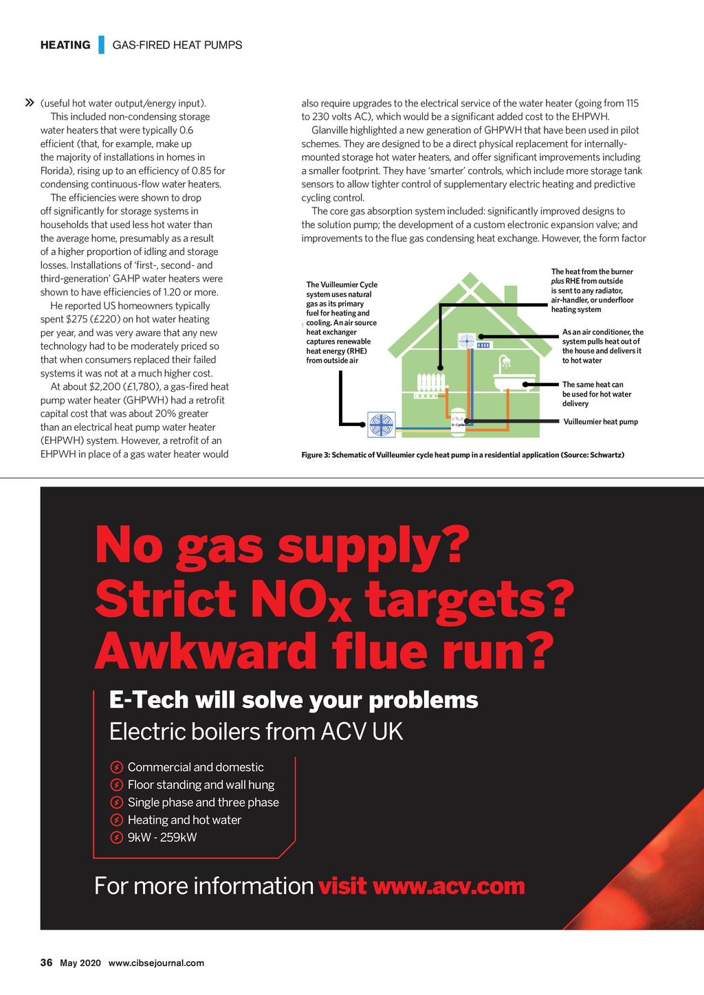 HEATING | GAS-FIRED HEAT PUMPS (useful hot water output/energy input). This included non-condensing storage water heaters that were typically 0.6 efficient (that, for example, make up the majority of installations in homes in Florida), rising up to an efficiency of 0.85 for condensing continuous-flow water heaters. The efficiencies were shown to drop off significantly for storage systems in households that used less hot water than the average home, presumably as a result of a higher proportion of idling and storage losses. Installations of first-, second- and third-generation GAHP water heaters were shown to have efficiencies of 1.20 or more. He reported US homeowners typically spent $275 (220) on hot water heating per year, and was very aware that any new technology had to be moderately priced so that when consumers replaced their failed systems it was not at a much higher cost. At about $2,200 (1,780), a gas-fired heat pump water heater (GHPWH) had a retrofit capital cost that was about 20% greater than an electrical heat pump water heater (EHPWH) system. However, a retrofit of an EHPWH in place of a gas water heater would also require upgrades to the electrical service of the water heater (going from 115 to 230 volts AC), which would be a significant added cost to the EHPWH. Glanville highlighted a new generation of GHPWH that have been used in pilot schemes. They are designed to be a direct physical replacement for internallymounted storage hot water heaters, and offer significant improvements including a smaller footprint. They have smarter controls, which include more storage tank sensors to allow tighter control of supplementary electric heating and predictive cycling control. The core gas absorption system included: significantly improved designs to the solution pump; the development of a custom electronic expansion valve; and improvements to the flue gas condensing heat exchange. However, the form factor The Vuilleumier Cycle system uses natural gas as its primary fuel for heating and cooling. An air source heat exchanger captures renewable heat energy (RHE) from outside air The heat from the burner plus RHE from outside is sent to any radiator, air-handler, or underfloor heating system As an air conditioner, the system pulls heat out of the house and delivers it to hot water The same heat can be used for hot water delivery Vuilleumier heat pump Figure 3: Schematic of Vuilleumier cycle heat pump in a residential application (Source: Schwartz) No gas supply? Strict NOx targets? Awkward flue run? E-Tech will solve your problems Electric boilers from ACV UK Commercial and domestic Floor standing and wall hung Single phase and three phase Heating and hot water 9kW - 259kW For more information visit www.acv.com 36 May 2020 www.cibsejournal.com CIBSE May20 pp34-37 Supp GAHP.indd 36 24/04/2020 16:31