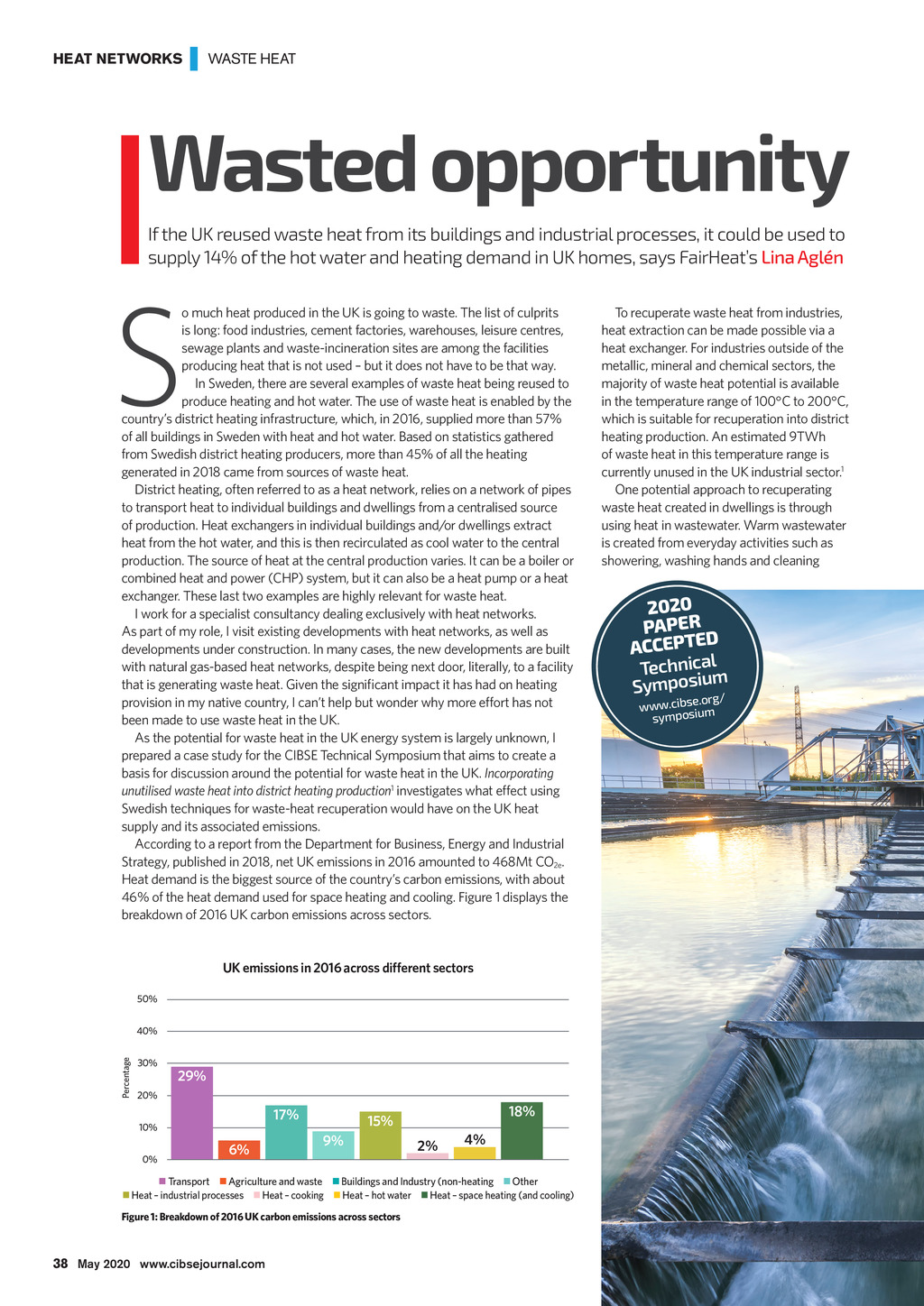 HEAT NETWORKS | WASTE HEAT Wasted opportunity If the UK reused waste heat from its buildings and industrial processes, it could be used to supply 14% of the hot water and heating demand in UK homes, says FairHeats Lina Agln S o much heat produced in the UK is going to waste. The list of culprits is long: food industries, cement factories, warehouses, leisure centres, sewage plants and waste-incineration sites are among the facilities producing heat that is not used but it does not have to be that way. In Sweden, there are several examples of waste heat being reused to produce heating and hot water. The use of waste heat is enabled by the countrys district heating infrastructure, which, in 2016, supplied more than 57% of all buildings in Sweden with heat and hot water. Based on statistics gathered from Swedish district heating producers, more than 45% of all the heating generated in 2018 came from sources of waste heat. District heating, often referred to as a heat network, relies on a network of pipes to transport heat to individual buildings and dwellings from a centralised source of production. Heat exchangers in individual buildings and/or dwellings extract heat from the hot water, and this is then recirculated as cool water to the central production. The source of heat at the central production varies. It can be a boiler or combined heat and power (CHP) system, but it can also be a heat pump or a heat exchanger. These last two examples are highly relevant for waste heat. I work for a specialist consultancy dealing exclusively with heat networks. As part of my role, I visit existing developments with heat networks, as well as developments under construction. In many cases, the new developments are built with natural gas-based heat networks, despite being next door, literally, to a facility that is generating waste heat. Given the significant impact it has had on heating provision in my native country, I cant help but wonder why more effort has not been made to use waste heat in the UK. As the potential for waste heat in the UK energy system is largely unknown, I prepared a case study for the CIBSE Technical Symposium that aims to create a basis for discussion around the potential for waste heat in the UK. Incorporating unutilised waste heat into district heating production1 investigates what effect using Swedish techniques for waste-heat recuperation would have on the UK heat supply and its associated emissions. According to a report from the Department for Business, Energy and Industrial Strategy, published in 2018, net UK emissions in 2016 amounted to 468Mt CO2e. Heat demand is the biggest source of the countrys carbon emissions, with about 46% of the heat demand used for space heating and cooling. Figure 1 displays the breakdown of 2016 UK carbon emissions across sectors. To recuperate waste heat from industries, heat extraction can be made possible via a heat exchanger. For industries outside of the metallic, mineral and chemical sectors, the majority of waste heat potential is available in the temperature range of 100C to 200C, which is suitable for recuperation into district heating production. An estimated 9TWh of waste heat in this temperature range is currently unused in the UK industrial sector.1 One potential approach to recuperating waste heat created in dwellings is through using heat in wastewater. Warm wastewater is created from everyday activities such as showering, washing hands and cleaning 2020 PAPER D ACCEPTE Technicalm Symposiu .org/ www.cibseum symposi UK emissions in 2016 across different sectors 50% Percentage 40% 30% 29% 20% 17% 10% 0% 6% 18% 15% 9% 2% 4% n Transport n Agriculture and waste n Buildings and Industry (non-heating n Other n Heat industrial processes n Heat cooking n Heat hot water n Heat space heating (and cooling) Figure 1: Breakdown of 2016 UK carbon emissions across sectors 38 May 2020 www.cibsejournal.com CIBSE May20 pp38-39 Supp Waste heat.indd 38 24/04/2020 16:32