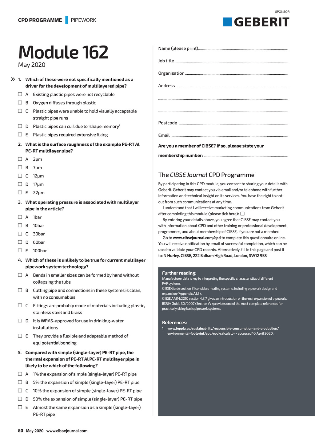 SPONSOR CPD PROGRAMME | PIPEWORK Module 162 May 2020 Name (please print)......................................................................................... Job title................................................................................................................ Organisation...................................................................................................... 1.Which of these were not specifically mentioned as a driver for the development of multilayered pipe? A Existing plastic pipes were not recyclable B Oxygen diffuses through plastic C Plastic pipes were unable to hold visually acceptable straight pipe runs D Plastic pipes can curl due to shape memory E Plastic pipes required extensive fixing 2.What is the surface roughness of the example PE-RT Al PE-RT multilayer pipe? A 2m B 7m C 12m D 17m E 22m 3.What operating pressure is associated with multilayer pipe in the article? A 1bar B 10bar C 30bar D 60bar E 100bar 4.Which of these is unlikely to be true for current multilayer pipework system technology? A Bends in smaller sizes can be formed by hand without collapsing the tube B Cutting pipe and connections in these systems is clean, with no consumables C Fittings are probably made of materials including plastic, stainless steel and brass D It is WRAS-approved for use in drinking-water installations E They provide a flexible and adaptable method of Address .............................................................................................................. ............................................................................................................................... ............................................................................................................................... Postcode ............................................................................................................ Email .................................................................................................................... Are you a member of CIBSE? If so, please state your membership number: ................................................................................... The CIBSE Journal CPD Programme By participating in this CPD module, you consent to sharing your details with Geberit. Geberit may contact you via email and/or telephone with further information and technical insight on its services. You have the right to optout from such communications at any time. I understand that I will receive marketing communications from Geberit after completing this module (please tick here): By entering your details above, you agree that CIBSE may contact you with information about CPD and other training or professional development programmes, and about membership of CIBSE, if you are not a member. Go to www.cibsejournal.com/cpd to complete this questionnaire online. You will receive notification by email of successful completion, which can be used to validate your CPD records. Alternatively, fill in this page and post it to: N Hurley, CIBSE, 222 Balham High Road, London, SW12 9BS Further reading: Manufacturer data is key to interpreting the specific characteristics of different PAP systems. CIBSE Guide section B1 considers heating systems, including pipework design and expansion (Appendix A1.5). CIBSE AM14:2010 section 4.3.7 gives an introduction on thermal expansion of pipework. BSRIA Guide 30/2007 (Section W) provides one of the most complete references for practically sizing basic pipework systems. References: 1 www.teppfa.eu/sustainability/responsible-consumption-and-production/ environmental-footprint/epd/epd-calculator accessed 10 April 2020. equipotential bonding 5.Compared with simple (single-layer) PE-RT pipe, the thermal expansion of PE-RT Al PE-RT multilayer pipe is likely to be which of the following? A 1% the expansion of simple (single-layer) PE-RT pipe B 5% the expansion of simple (single-layer) PE-RT pipe C 10% the expansion of simple (single-layer) PE-RT pipe D 50% the expansion of simple (single-layer) PE-RT pipe E Almost the same expansion as a simple (single-layer) PE-RT pipe 50 May 2020 www.cibsejournal.com CIBSE May 20 pp47-50 CPD Geberit v2.indd 50 24/04/2020 16:35