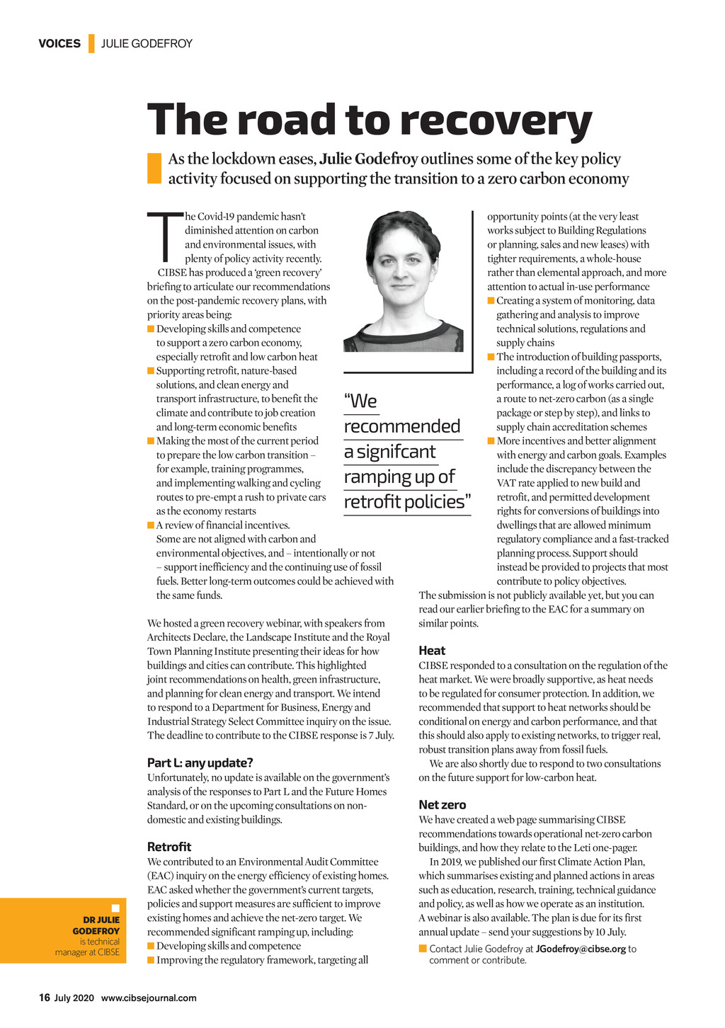 VOICES | JULIE GODEFROY The road to recovery As the lockdown eases, Julie Godefroy outlines some of the key policy activity focused on supporting the transition to a zero carbon economy T he Covid-19 pandemic hasnt diminished attention on carbon and environmental issues, with plenty of policy activity recently. CIBSE has produced a green recovery briefing to articulate our recommendations on the post-pandemic recovery plans, with priority areas being: Developing skills and competence to support a zero carbon economy, especially retrofit and low carbon heat Supporting retrofit, nature-based solutions, and clean energy and transport infrastructure, to benefit the climate and contribute to job creation and long-term economic benefits Making the most of the current period to prepare the low carbon transition for example, training programmes, and implementing walking and cycling routes to pre-empt a rush to private cars as the economy restarts A review of financial incentives. Some are not aligned with carbon and environmental objectives, and intentionally or not support inefficiency and the continuing use of fossil fuels. Better long-term outcomes could be achieved with the same funds. opportunity points (at the very least works subject to Building Regulations or planning, sales and new leases) with tighter requirements, a whole-house rather than elemental approach, and more attention to actual in-use performance Creating a system of monitoring, data gathering and analysis to improve technical solutions, regulations and supply chains The introduction of building passports, including a record of the building and its performance, a log of works carried out, a route to net-zero carbon (as a single package or step by step), and links to supply chain accreditation schemes More incentives and better alignment with energy and carbon goals. Examples include the discrepancy between the VAT rate applied to new build and retrofit, and permitted development rights for conversions of buildings into dwellings that are allowed minimum regulatory compliance and a fast-tracked planning process. Support should instead be provided to projects that most contribute to policy objectives. The submission is not publicly available yet, but you can read our earlier briefing to the EAC for a summary on similar points. We recommended a signifcant ramping up of retrofit policies We hosted a green recovery webinar, with speakers from Architects Declare, the Landscape Institute and the Royal Town Planning Institute presenting their ideas for how buildings and cities can contribute. This highlighted joint recommendations on health, green infrastructure, and planning for clean energy and transport. We intend to respond to a Department for Business, Energy and Industrial Strategy Select Committee inquiry on the issue. The deadline to contribute to the CIBSE response is 7 July. Part L: any update? Unfortunately, no update is available on the governments analysis of the responses to Part L and the Future Homes Standard, or on the upcoming consultations on nondomestic and existing buildings. Retrofit DR JULIE GODEFROY is technical manager at CIBSE We contributed to an Environmental Audit Committee (EAC) inquiry on the energy efficiency of existing homes. EAC asked whether the governments current targets, policies and support measures are sufficient to improve existing homes and achieve the net-zero target. We recommended significant ramping up, including: Developing skills and competence Improving the regulatory framework, targeting all Heat CIBSE responded to a consultation on the regulation of the heat market. We were broadly supportive, as heat needs to be regulated for consumer protection. In addition, we recommended that support to heat networks should be conditional on energy and carbon performance, and that this should also apply to existing networks, to trigger real, robust transition plans away from fossil fuels. We are also shortly due to respond to two consultations on the future support for low-carbon heat. Net zero We have created a web page summarising CIBSE recommendations towards operational net-zero carbon buildings, and how they relate to the Leti one-pager. In 2019, we published our first Climate Action Plan, which summarises existing and planned actions in areas such as education, research, training, technical guidance and policy, as well as how we operate as an institution. A webinar is also available. The plan is due for its first annual update send your suggestions by 10 July. Contact Julie Godefroy at JGodefroy@cibse.org to comment or contribute. 16 July 2020 www.cibsejournal.com CIBSE July 2020 pp16 Julie Godefroy.indd 16 19/06/2020 16:46