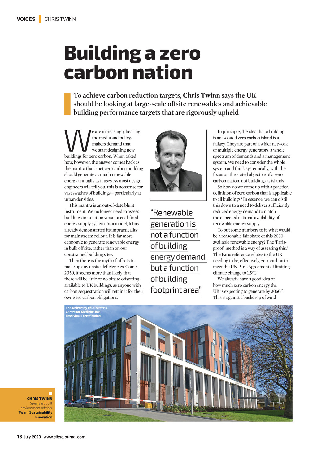 VOICES | CHRIS TWINN Building a zero carbon nation To achieve carbon reduction targets, Chris Twinn says the UK should be looking at large-scale offsite renewables and achievable building performance targets that are rigorously upheld W e are increasingly hearing the media and policymakers demand that we start designing new buildings for zero carbon. When asked how, however, the answer comes back as the mantra that a net zero carbon building should generate as much renewable energy annually as it uses. As most design engineers will tell you, this is nonsense for vast swathes of buildings particularly at urban densities. This mantra is an out-of-date blunt instrument. We no longer need to assess buildings in isolation versus a coal-fired energy supply system. As a model, it has already demonstrated its impracticality for mainstream rollout. It is far more economic to generate renewable energy in bulk off site, rather than on our constrained building sites. Then there is the myth of offsets to make up any onsite deficiencies. Come 2050, it seems more than likely that there will be little or no offsite offsetting available to UK buildings, as anyone with carbon sequestration will retain it for their own zero carbon obligations. Renewable generation is not a function of building energy demand, but a function of building footprint area In principle, the idea that a building is an isolated zero carbon island is a fallacy. They are part of a wider network of multiple energy generators, a whole spectrum of demands and a management system. We need to consider the whole system and think systemically, with the focus on the stated objective of a zero carbon nation, not buildings as islands. So how do we come up with a practical definition of zero carbon that is applicable to all buildings? In essence, we can distil this down to a need to deliver sufficiently reduced energy demand to match the expected national availability of renewable energy supply. To put some numbers to it, what would be a reasonable fair share of this 2050 available renewable energy? The Parisproof method is a way of assessing this.1 The Paris reference relates to the UK needing to be, effectively, zero carbon to meet the UN Paris Agreement of limiting climate change to 1.5C. We already have a good idea of how much zero carbon energy the UK is expecting to generate by 2050.2 This is against a backdrop of wind- The University of Leicesters Centre for Medicine has Passivhaus certification CHRIS TWINN Specialist built environment adviser Twinn Sustainability Innovation 18 July 2020 www.cibsejournal.com CIBSE July 2020 p18-19 Chris Twinn.indd 18 19/06/2020 15:47