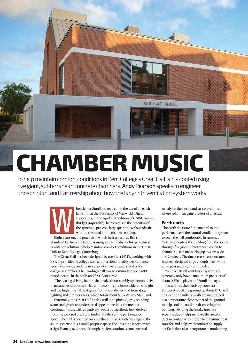 KENT COLLEGE | EARTH LABYRINTH VENTILATION CHAMBER MUSIC To help maintain comfort conditions in Kent Colleges Great Hall, air is cooled using five giant, subterranean concrete chambers. Andy Pearson speaks to engineer Brinson Staniland Partnership about how the labyrinth ventilation system works W hen James Staniland read about the use of an earth labyrinth at the University of Warwicks Digital Laboratory, in the April 2012 edition of CIBSE Journal (bit.ly/CJApr12lab), he recognised the potential of the system to pre-cool large quantities of outside air without the need for mechanical cooling. Eight years on, the practice of which he is a partner, Brinson Staniland Partnership (BSP), is using an earth labyrinth-type natural ventilation solution to help maintain comfort conditions in the Great Hall, at Kent College, Canterbury. The Great Hall has been designed by architect HMY, working with BSP, to provide the college with a professional-quality performance space for musical and theatrical performances, and a facility for college assemblies. The 11m-high hall can accommodate up to 600 people seated in the stalls and first-floor circle. The two big driving factors that make this assembly space conducive to natural ventilation with labyrinth cooling are its considerable height and the high internal heat gains from the audience and from stage lighting and dimmer racks, which totals about 63.5kW, says Staniland. Externally, the Great Halls brick walls and pitched, grey, standingseam roof give it an understated appearance. Its a theme that continues inside, with a relatively robust but aesthetic look derived from the exposed brick and timber finishes of the performance space. The hall is oriented on a north-south axis, with the stage to the south. Because it is a multi-purpose space, the envelope incorporates a significant glazed area, although the fenestration is concentrated mostly on the north and east elevations, where solar heat gains are less of an issue. Earth ducts The earth ducts are fundamental to the performance of the natural ventilation system to keep the hall comfortable in summer. Outside air enters the building from the south, through five giant, subterranean concrete chambers, each measuring up to 3.5m wide and 2m deep. The ducts cross-sectional area has been designed large enough to allow the air to pass practically unimpeded. With a natural ventilation system, you generally only have a maximum pressure of about 0.5Pa to play with, Staniland says. In summer, the relatively constant temperature of the ground, at about 12C, will ensure the chambers walls are maintained at a temperature close to that of the ground, to help cool the outdoor air entering the building. Dividing the intake into five separate ducts helps increase the area of duct in contact with the air, to maximise heat transfer, and helps with zoning the supply air. Each duct also incorporates a modulating 24 July 2020 www.cibsejournal.com CIBSE July 2020 p24-27 Kent college.indd 24 19/06/2020 15:53