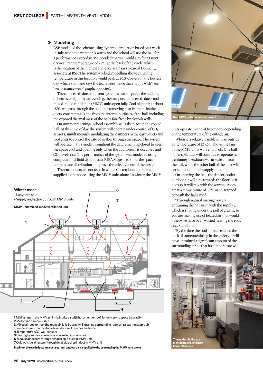 KENT COLLEGE | EARTH LABYRINTH VENTILATION Modelling BSP modelled the scheme using dynamic simulation based on a week in July, when the weather is warm and the school will use the hall for a performance every day. We decided that we would aim for a target dry-resultant temperature of 28C at the back of the circle, which is the location of the highest audience seat, says Gearoid Donnelly, associate at BSP. The system worked; modelling showed that the temperature in this location would peak at 26.5C, even on the hottest day, which Staniland says the team were more than happy with (see Performance week graph, opposite). The same earth duct/roof vent system is used to purge the building of heat overnight. In late evening, the dampers in the earth ducts and mixed-mode ventilation (MMV) units open fully. Cool night air, at about 18C, will pass through the building, removing heat from the intake ducts concrete walls and from the internal surfaces of the hall, including the exposed thermal mass of the halls fair-faced brickwork walls. On summer mornings, school assembly will take place in the cooled hall. At this time of day, the system will operate under control of CO2 sensors, simultaneously modulating the dampers in the earth ducts and roof units to control the rate of airflow through the space. The system will operate in this mode throughout the day, remaining closed to keep the space cool and opening only when the auditorium is occupied and CO2 levels rise. The performance of the system was modelled using computational fluid dynamics at RIBA Stage 4, to show the spacetemperature distribution and prove the effectiveness of the design. The earth ducts are not used in winter; instead, outdoor air is supplied to the space using the MMV units alone. In winter, the MMV Winter mode 6 Labyrinth shut Supply and extract through MMV units 7 MMV unit: mixed-mode ventilation unit 1 2 3 Four MMV units penetrate the roof units operate in one of two modes depending on the temperature of the outside air. When it is relatively mild, with an outside air temperature of 12C or above, the fans in the MMV units will remain off. One half of the split duct will continue to operate as a chimney to exhaust warm stale air from the hall, while the other half of the duct will act as an outdoor air supply duct. On entering the hall, the denser, cooler outdoor air will sink towards the floor. As it does so, it will mix with the warmed room air at a temperature of 35C or so, trapped beneath the halls roof. Through natural mixing, you are entraining the hot air in with the supply air, which is sinking under the pull of gravity, so you are making use of heated air that would otherwise have been wasted heating the roof, says Staniland. By the time the cool air has reached the neck of someone sitting in the gallery, it will have entrained a significant amount of the surrounding air, so that its temperature will 5 4 1 Mixing fans in the MMV unit mix intake air with hot air under roof, for delivery to space by gravity 2 Motorised damper shut 3M ixed air, cooler than the room air, falls by gravity. Entrained surrounding room air raises the supply air temperature to comfortable levels before it reaches audience 4 Temperature/CO2 wall sensors 5 Heating by natural convectors concealed inside labyrinth 6 Exhaust air occurs through exhaust split duct in MMV unit 7 Cold outside air enters through inlet side of split duct in MMV unit In winter, the earth ducts are not used, and outdoor air is supplied to the space using the MMV units alone The modest boiler plant is evidence of significant fabric efficiency 26 July 2020 www.cibsejournal.com CIBSE July 2020 p24-27 Kent college.indd 26 19/06/2020 15:53