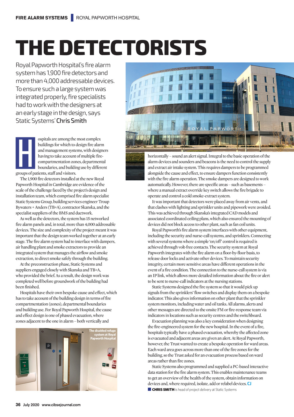 FIRE ALARM SYSTEMS | ROYAL PAPWORTH HOSPITAL THE DETECTORISTS Royal Papworth Hospitals fire alarm system has 1,900 fire detectors and more than 4,000 addressable devices. To ensure such a large system was integrated properly, fire specialists had to work with the designers at an early stage in the design, says Static Systems Chris Smith H ospitals are among the most complex buildings for which to design fire alarm and management systems, with designers having to take account of multiple firecompartmentation zones, departmental boundaries, and building use by different groups of patients, staff and visitors. The 1,900 fire detectors installed at the new Royal Papworth Hospital in Cambridge are evidence of the scale of the challenge faced by the projects design and installation team, which comprised fire alarm specialist Static Systems Group, building services engineer Troup Bywaters + Anders (TB+A), contractor Skanska, and the specialist suppliers of the BMS and ductwork. As well as the detectors, the system has 15 networked fire alarm panels and, in total, more than 4,000 addressable devices. The size and complexity of the project meant it was important that the design team worked together at an early stage. The fire alarm system had to interface with dampers, air handling plant and smoke extractors to provide an integrated system that manages the airflow and smoke extraction, to direct smoke safely through the building. At the preconstruction phase, Static Systems and suppliers engaged closely with Skanska and TB+A, who provided the brief. As a result, the design work was completed well before groundwork of the building had been finished. Hospitals have their own bespoke cause and effect, which has to take account of the building design in terms of fire compartmentation (zones), departmental boundaries and building use. For Royal Papworth Hospital, the cause and effect design is one of phased evacuation, where zones adjacent to the one in alarm both vertically and The disabled refuge system at Royal Papworth Hospital horizontally sound an alert signal. Integral to the basic operation of the alarm devices and sounders and beacons is the need to control the supply and extract air intake system. This requires dampers to be programmed alongside the cause and effect, to ensure dampers function consistently with the fire alarm operation. The smoke dampers are designed to work automatically. However, there are specific areas such as basements where a manual extract override key switch allows the fire brigade to operate and control a cold smoke-extract system. It was important that detectors were placed away from air vents, and that clashes with lighting and sprinkler units and pipework were avoided. This was achieved through Skanskas integrated CAD models and associated coordinated ceiling plans, which also ensured the mounting of devices did not block access to other plant, such as fan coil units. Royal Papworths fire alarm system interfaces with other equipment, including the security and nurse-call systems, and sprinklers. Connecting with several systems where a simple on/off control is required is achieved through volt-free contacts. The security system at Royal Papworth integrates with the fire alarm on a floor-by-floor basis, to release door locks and activate other devices. To maintain security integrity, certain more sensitive areas have different operations in the event of a fire condition. The connection to the nurse-call system is via an IP link, which allows more detailed information about the fire or alert to be sent to nurse-call indicators at the nursing stations. Static Systems designed the fire system so that it would pick up signals from the sprinklers flow switches and display them on a bespoke indicator. This also gives information on other plant that the sprinkler system monitors, including water and oil tanks. All alarms, alerts and other messages are directed to the onsite FM or fire-response team via indicators in locations such as security centres and the switchboard. Evacuation planning was also a key consideration when designing the fire-engineered system for the new hospital. In the event of a fire, hospitals typically have a phased evacuation, whereby the affected zone is evacuated and adjacent areas are given an alert. At Royal Papworth, however, the Trust wanted to create a bespoke operation for ward areas. Each ward area goes across more than one of the fire zones for the building, so the Trust asked for an evacuation process based on ward areas rather than fire zones. Static Systems also programmed and supplied a PC-based interactive data station for the fire alarm system. This enables maintenance teams to get an overview of the health of the system, obtain information on devices and, where required, isolate, add or relabel devices. CJ CHRIS SMITH is head of project delivery at Static Systems 36 July 2020 www.cibsejournal.com CIBSE July 2020 p36 Papworth fire alarm.indd 36 19/06/2020 19:22