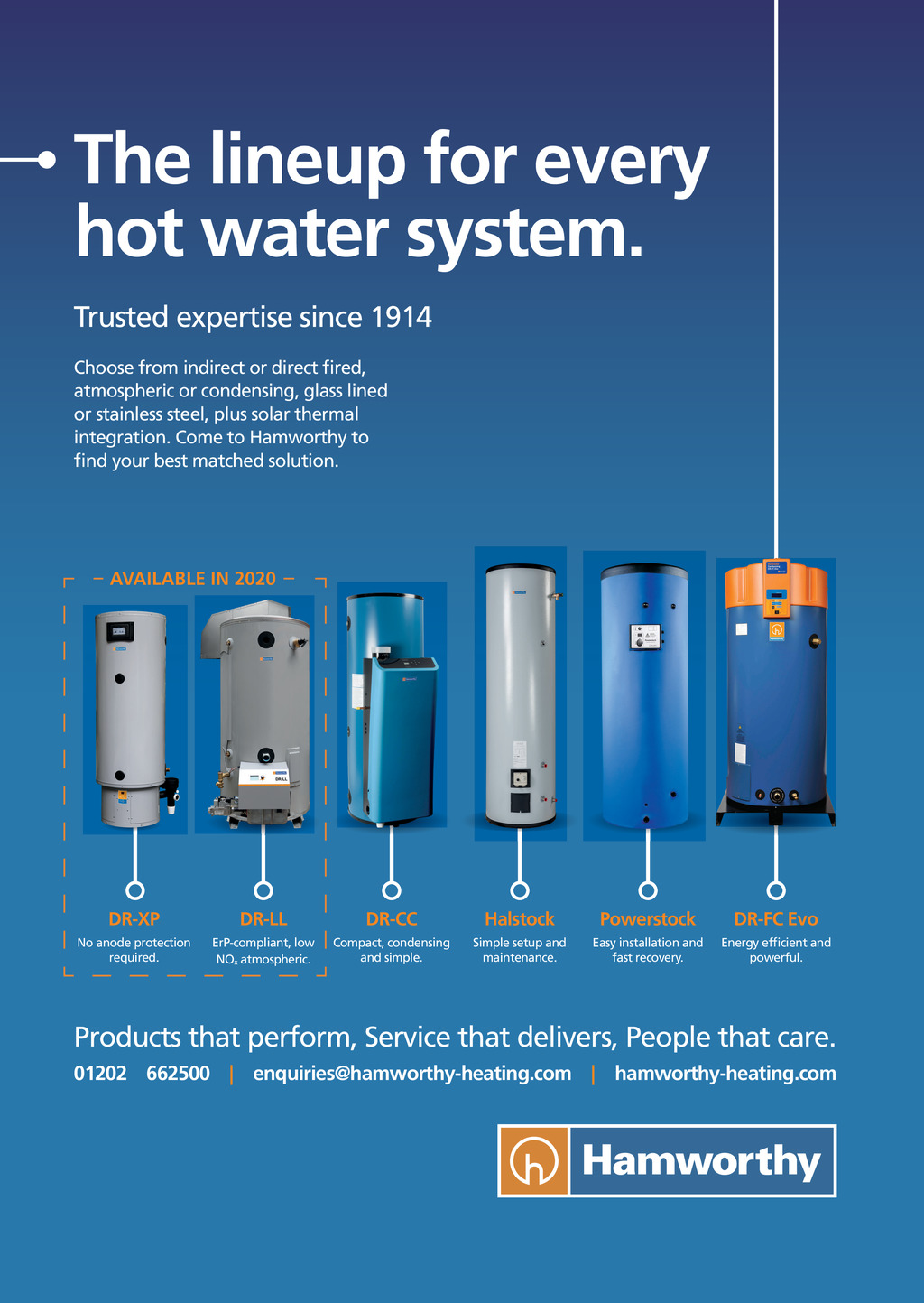 The lineup for every hot water system. Trusted expertise since 1914 Choose from indirect or direct red, atmospheric or condensing, glass lined or stainless steel, plus solar thermal integration. Come to Hamworthy to nd your best matched solution. AVAILABLE IN 2020 DR-XP DR-LL DR-CC Halstock Powerstock DR-FC Evo No anode protection required. ErP-compliant, low NOx atmospheric. Compact, condensing and simple. Simple setup and maintenance. Easy installation and fast recovery. Energy efcient and powerful. Products that perform, Service that delivers, People that care. 01202 662500 | enquiries@hamworthy-heating.com | hamworthy-heating.com 42 June 2020 www.cibsejournal.com Hamworthy CMYK proof.indd422 p42.CIBSEMagJuly20.indd 12/06/2020 12:22 10:52 15/06/2020