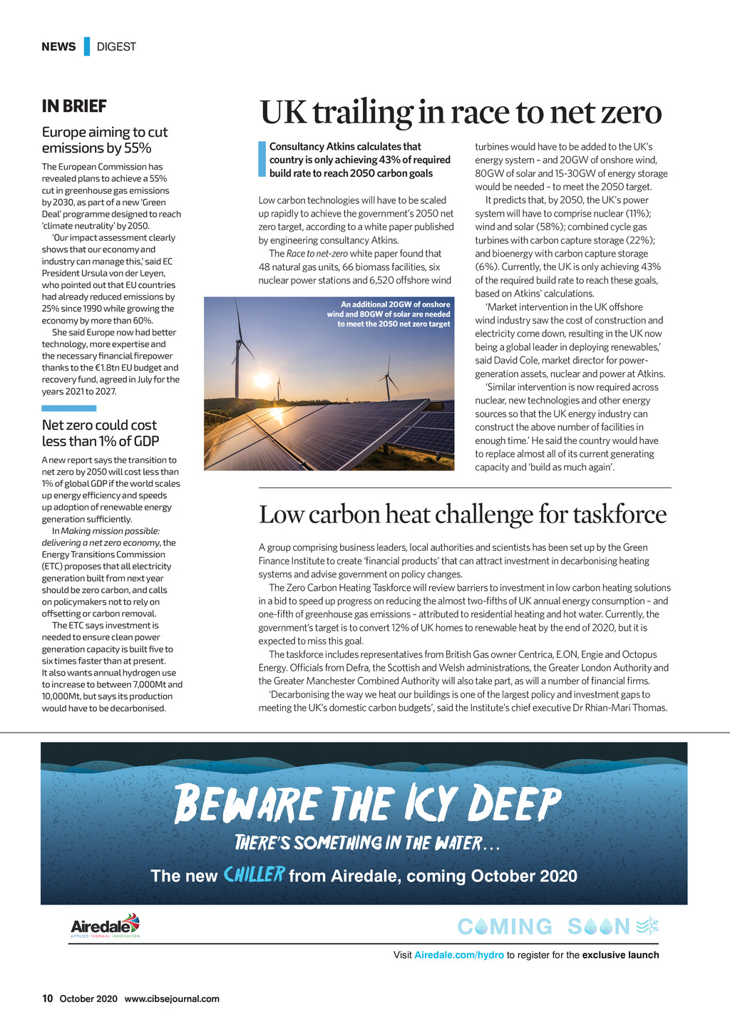 NEWS | DIGEST UK trailing in race to net zero IN BRIEF Europe aiming to cut emissions by 55% The European Commission has revealed plans to achieve a 55% cut in greenhouse gas emissions by 2030, as part of a new Green Deal programme designed to reach climate neutrality by 2050. Our impact assessment clearly shows that our economy and industry can manage this, said EC President Ursula von der Leyen, who pointed out that EU countries had already reduced emissions by 25% since 1990 while growing the economy by more than 60%. She said Europe now had better technology, more expertise and the necessary financial firepower thanks to the 1.8tn EU budget and recovery fund, agreed in July for the years 2021 to 2027. Net zero could cost less than 1% of GDP A new report says the transition to net zero by 2050 will cost less than 1% of global GDP if the world scales up energy efficiency and speeds up adoption of renewable energy generation sufficiently. In Making mission possible: delivering a net zero economy, the Energy Transitions Commission (ETC) proposes that all electricity generation built from next year should be zero carbon, and calls on policymakers not to rely on offsetting or carbon removal. The ETC says investment is needed to ensure clean power generation capacity is built five to six times faster than at present. It also wants annual hydrogen use to increase to between 7,000Mt and 10,000Mt, but says its production would have to be decarbonised. Consultancy Atkins calculates that country is only achieving 43% of required build rate to reach 2050 carbon goals Low carbon technologies will have to be scaled up rapidly to achieve the governments 2050 net zero target, according to a white paper published by engineering consultancy Atkins. The Race to net-zero white paper found that 48 natural gas units, 66 biomass facilities, six nuclear power stations and 6,520 offshore wind An additional 20GW of onshore wind and 80GW of solar are needed to meet the 2050 net zero target turbines would have to be added to the UKs energy system and 20GW of onshore wind, 80GW of solar and 15-30GW of energy storage would be needed to meet the 2050 target. It predicts that, by 2050, the UK s power system will have to comprise nuclear (11%); wind and solar (58%); combined cycle gas turbines with carbon capture storage (22%); and bioenergy with carbon capture storage (6%). Currently, the UK is only achieving 43% of the required build rate to reach these goals, based on Atkins calculations. Market intervention in the UK offshore wind industry saw the cost of construction and electricity come down, resulting in the UK now being a global leader in deploying renewables, said David Cole, market director for powergeneration assets, nuclear and power at Atkins. Similar intervention is now required across nuclear, new technologies and other energy sources so that the UK energy industry can construct the above number of facilities in enough time. He said the country would have to replace almost all of its current generating capacity and build as much again. Low carbon heat challenge for taskforce A group comprising business leaders, local authorities and scientists has been set up by the Green Finance Institute to create nancial products that can attract investment in decarbonising heating systems and advise government on policy changes. The Zero Carbon Heating Taskforce will review barriers to investment in low carbon heating solutions in a bid to speed up progress on reducing the almost two-fths of UK annual energy consumption and one-fth of greenhouse gas emissions attributed to residential heating and hot water. Currently, the governments target is to convert 12% of UK homes to renewable heat by the end of 2020, but it is expected to miss this goal. The taskforce includes representatives from British Gas owner Centrica, E.ON, Engie and Octopus Energy. Ofcials from Defra, the Scottish and Welsh administrations, the Greater London Authority and the Greater Manchester Combined Authority will also take part, as will a number of nancial rms. Decarbonising the way we heat our buildings is one of the largest policy and investment gaps to meeting the UKs domestic carbon budgets, said the Institutes chief executive Dr Rhian-Mari Thomas. Beware the Icy Deep Theres something in the water The new CHILLER from Airedale, coming October 2020 C MING S N Visit Airedale.com/hydro to register for the exclusive launch 10 October 2020 www.cibsejournal.com CIBSE Oct20 pp10 News.indd 10 25/09/2020 14:22