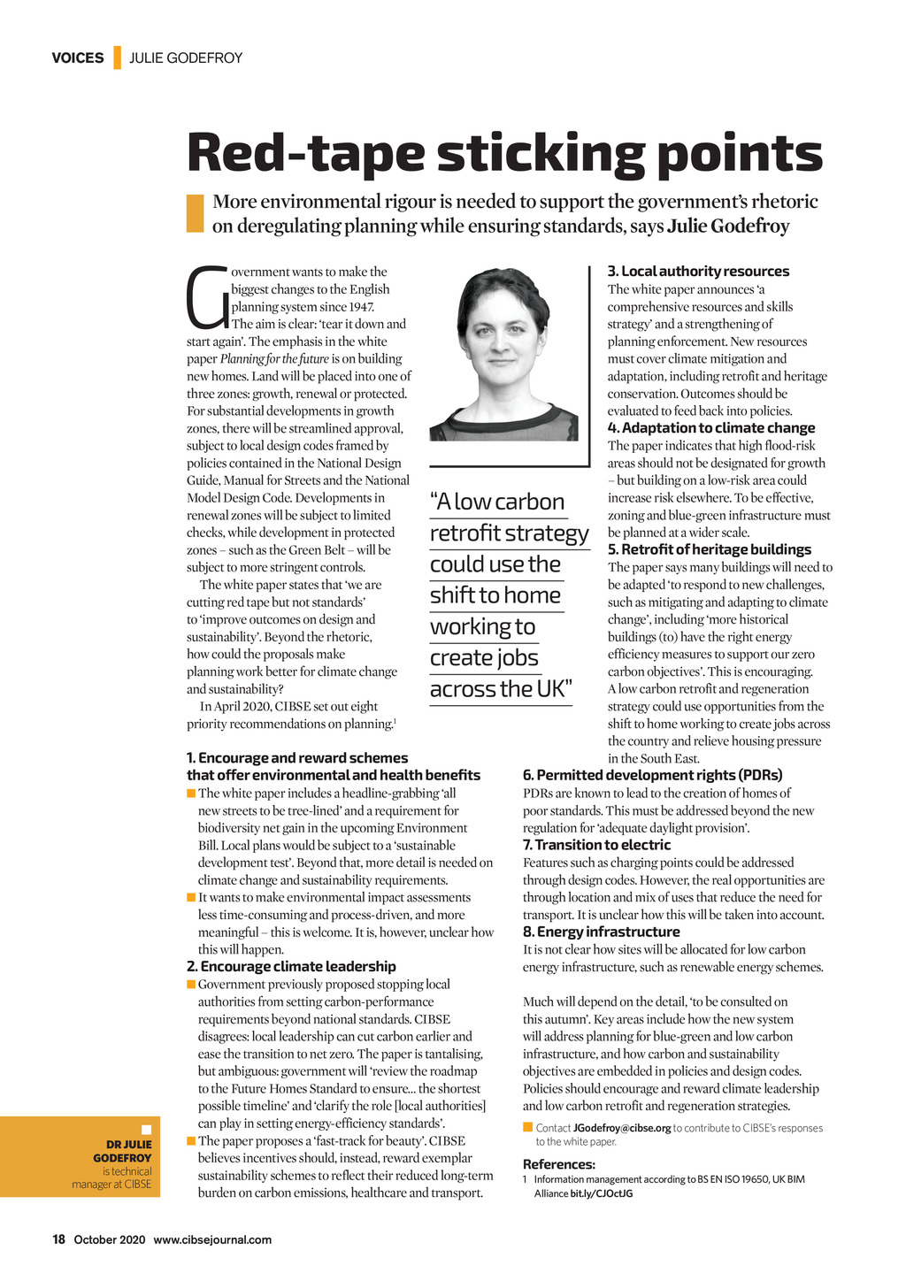 VOICES | JULIE GODEFROY Red-tape sticking points More environmental rigour is needed to support the governments rhetoric on deregulating planning while ensuring standards, says Julie Godefroy G overnment wants to make the biggest changes to the English planning system since 1947. The aim is clear: tear it down and start again. The emphasis in the white paper Planning for the future is on building new homes. Land will be placed into one of three zones: growth, renewal or protected. For substantial developments in growth zones, there will be streamlined approval, subject to local design codes framed by policies contained in the National Design Guide, Manual for Streets and the National Model Design Code. Developments in renewal zones will be subject to limited checks, while development in protected zones such as the Green Belt will be subject to more stringent controls. The white paper states that we are cutting red tape but not standards to improve outcomes on design and sustainability. Beyond the rhetoric, how could the proposals make planning work better for climate change and sustainability? In April 2020, CIBSE set out eight priority recommendations on planning.1 3. Local authority resources The white paper announces a comprehensive resources and skills strategy and a strengthening of planning enforcement. New resources must cover climate mitigation and adaptation, including retrofit and heritage conservation. Outcomes should be evaluated to feed back into policies. 4. Adaptation to climate change A low carbon retrofit strategy could use the shift to home working to create jobs across the UK 1. Encourage and reward schemes that offer environmental and health benefits The white paper includes a headline-grabbing all new streets to be tree-lined and a requirement for biodiversity net gain in the upcoming Environment Bill. Local plans would be subject to a sustainable development test. Beyond that, more detail is needed on climate change and sustainability requirements. It wants to make environmental impact assessments less time-consuming and process-driven, and more meaningful this is welcome. It is, however, unclear how this will happen. 2. Encourage climate leadership The paper indicates that high flood-risk areas should not be designated for growth but building on a low-risk area could increase risk elsewhere. To be effective, zoning and blue-green infrastructure must be planned at a wider scale. 5. Retrofit of heritage buildings The paper says many buildings will need to be adapted to respond to new challenges, such as mitigating and adapting to climate change, including more historical buildings (to) have the right energy efficiency measures to support our zero carbon objectives. This is encouraging. A low carbon retrofit and regeneration strategy could use opportunities from the shift to home working to create jobs across the country and relieve housing pressure in the South East. 6. Permitted development rights (PDRs) PDRs are known to lead to the creation of homes of poor standards. This must be addressed beyond the new regulation for adequate daylight provision. 7. Transition to electric Features such as charging points could be addressed through design codes. However, the real opportunities are through location and mix of uses that reduce the need for transport. It is unclear how this will be taken into account. 8. Energy infrastructure It is not clear how sites will be allocated for low carbon energy infrastructure, such as renewable energy schemes. Government previously proposed stopping local DR JULIE GODEFROY is technical manager at CIBSE authorities from setting carbon-performance requirements beyond national standards. CIBSE disagrees: local leadership can cut carbon earlier and ease the transition to net zero. The paper is tantalising, but ambiguous: government will review the roadmap to the Future Homes Standard to ensure the shortest possible timeline and clarify the role [local authorities] can play in setting energy-efficiency standards. The paper proposes a fast-track for beauty. CIBSE believes incentives should, instead, reward exemplar sustainability schemes to reflect their reduced long-term burden on carbon emissions, healthcare and transport. Much will depend on the detail, to be consulted on this autumn. Key areas include how the new system will address planning for blue-green and low carbon infrastructure, and how carbon and sustainability objectives are embedded in policies and design codes. Policies should encourage and reward climate leadership and low carbon retrofit and regeneration strategies. Contact JGodefroy@cibse.org to contribute to CIBSEs responses to the white paper. References: 1 Information management according to BS EN ISO 19650, UK BIM Alliance bit.ly/CJOctJG 18 October 2020 www.cibsejournal.com CIBSE Oct20 pp18 Julie Godefroy.indd 18 25/09/2020 14:26