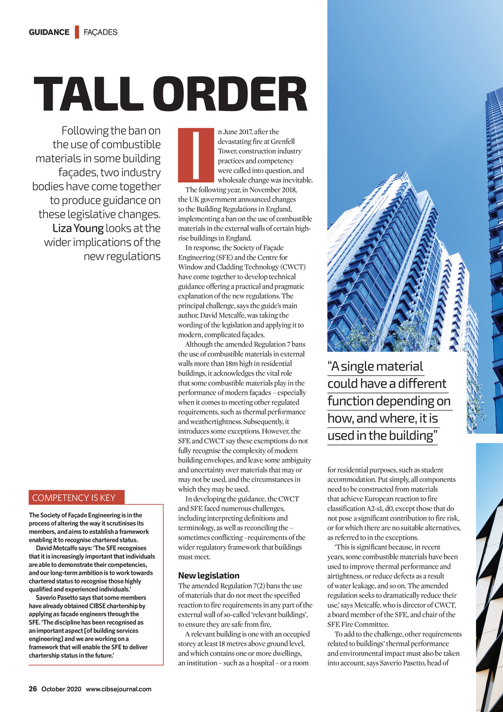 GUIDANCE | FAADES TALL ORDER Following the ban on the use of combustible materials in some building faades, two industry bodies have come together to produce guidance on these legislative changes. Liza Young looks at the wider implications of the new regulations COMPETENCY IS KEY The Society of Faade Engineering is in the process of altering the way it scrutinises its members, and aims to establish a framework enabling it to recognise chartered status. David Metcalfe says: The SFE recognises that it is increasingly important that individuals are able to demonstrate their competencies, and our long-term ambition is to work towards chartered status to recognise those highly qualified and experienced individuals. Saverio Pasetto says that some members have already obtained CIBSE chartership by applying as faade engineers through the SFE. The discipline has been recognised as an important aspect [of building services engineering] and we are working on a framework that will enable the SFE to deliver chartership status in the future. I n June 2017, after the devastating fire at Grenfell Tower, construction industry practices and competency were called into question, and wholesale change was inevitable. The following year, in November 2018, the UK government announced changes to the Building Regulations in England, implementing a ban on the use of combustible materials in the external walls of certain highrise buildings in England. In response, the Society of Faade Engineering (SFE) and the Centre for Window and Cladding Technology (CWCT) have come together to develop technical guidance offering a practical and pragmatic explanation of the new regulations. The principal challenge, says the guides main author, David Metcalfe, was taking the wording of the legislation and applying it to modern, complicated faades. Although the amended Regulation 7 bans the use of combustible materials in external walls more than 18m high in residential buildings, it acknowledges the vital role that some combustible materials play in the performance of modern faades especially when it comes to meeting other regulated requirements, such as thermal performance and weathertightness. Subsequently, it introduces some exceptions. However, the SFE and CWCT say these exemptions do not fully recognise the complexity of modern building envelopes, and leave some ambiguity and uncertainty over materials that may or may not be used, and the circumstances in which they may be used. In developing the guidance, the CWCT and SFE faced numerous challenges, including interpreting definitions and terminology, as well as reconciling the sometimes conflicting requirements of the wider regulatory framework that buildings must meet. New legislation The amended Regulation 7(2) bans the use of materials that do not meet the specified reaction to fire requirements in any part of the external wall of so-called relevant buildings, to ensure they are safe from fire. A relevant building is one with an occupied storey at least 18 metres above ground level, and which contains one or more dwellings, an institution such as a hospital or a room A single material could have a different function depending on how, and where, it is used in the building for residential purposes, such as student accommodation. Put simply, all components need to be constructed from materials that achieve European reaction to fire classification A2-s1, d0, except those that do not pose a significant contribution to fire risk, or for which there are no suitable alternatives, as referred to in the exceptions. This is significant because, in recent years, some combustible materials have been used to improve thermal performance and airtightness, or reduce defects as a result of water leakage, and so on. The amended regulation seeks to dramatically reduce their use, says Metcalfe, who is director of CWCT, a board member of the SFE, and chair of the SFE Fire Committee. To add to the challenge, other requirements related to buildings thermal performance and environmental impact must also be taken into account, says Saverio Pasetto, head of 26 October 2020 www.cibsejournal.com CIBSE Oct20 pp26-29 Facade guidance.indd 26 25/09/2020 14:43