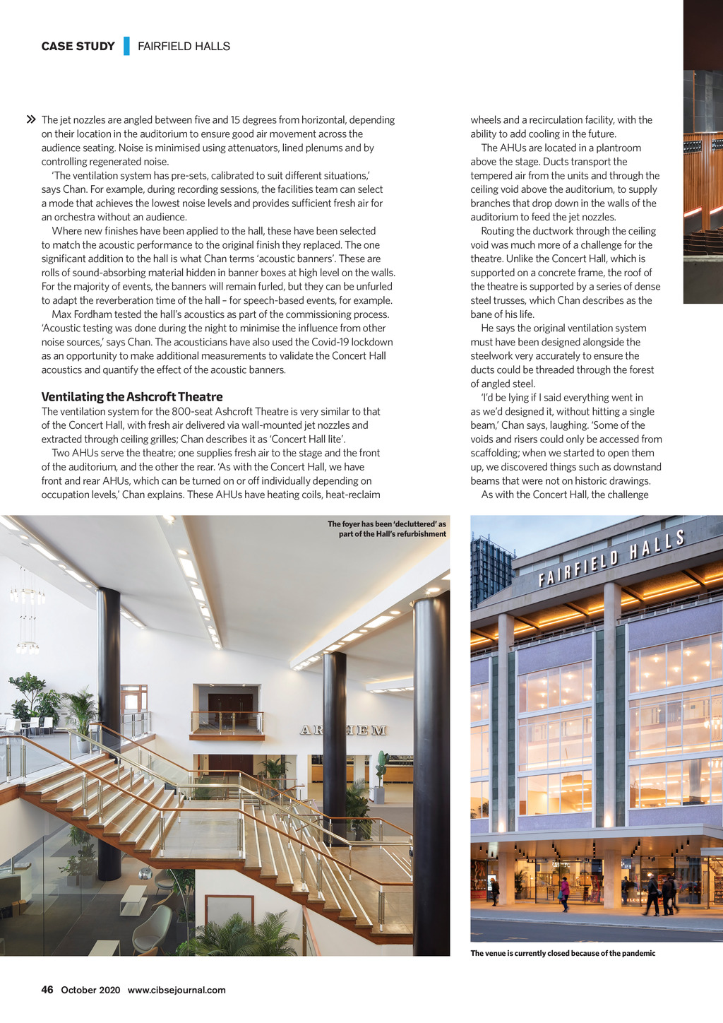 CASE STUDY | FAIRFIELD HALLS The jet nozzles are angled between five and 15 degrees from horizontal, depending on their location in the auditorium to ensure good air movement across the audience seating. Noise is minimised using attenuators, lined plenums and by controlling regenerated noise. The ventilation system has pre-sets, calibrated to suit different situations, says Chan. For example, during recording sessions, the facilities team can select a mode that achieves the lowest noise levels and provides sufficient fresh air for an orchestra without an audience. Where new finishes have been applied to the hall, these have been selected to match the acoustic performance to the original finish they replaced. The one significant addition to the hall is what Chan terms acoustic banners. These are rolls of sound-absorbing material hidden in banner boxes at high level on the walls. For the majority of events, the banners will remain furled, but they can be unfurled to adapt the reverberation time of the hall for speech-based events, for example. Max Fordham tested the halls acoustics as part of the commissioning process. Acoustic testing was done during the night to minimise the influence from other noise sources, says Chan. The acousticians have also used the Covid-19 lockdown as an opportunity to make additional measurements to validate the Concert Hall acoustics and quantify the effect of the acoustic banners. Ventilating the Ashcroft Theatre The ventilation system for the 800-seat Ashcroft Theatre is very similar to that of the Concert Hall, with fresh air delivered via wall-mounted jet nozzles and extracted through ceiling grilles; Chan describes it as Concert Hall lite. Two AHUs serve the theatre; one supplies fresh air to the stage and the front of the auditorium, and the other the rear. As with the Concert Hall, we have front and rear AHUs, which can be turned on or off individually depending on occupation levels, Chan explains. These AHUs have heating coils, heat-reclaim wheels and a recirculation facility, with the ability to add cooling in the future. The AHUs are located in a plantroom above the stage. Ducts transport the tempered air from the units and through the ceiling void above the auditorium, to supply branches that drop down in the walls of the auditorium to feed the jet nozzles. Routing the ductwork through the ceiling void was much more of a challenge for the theatre. Unlike the Concert Hall, which is supported on a concrete frame, the roof of the theatre is supported by a series of dense steel trusses, which Chan describes as the bane of his life. He says the original ventilation system must have been designed alongside the steelwork very accurately to ensure the ducts could be threaded through the forest of angled steel. Id be lying if I said everything went in as wed designed it, without hitting a single beam, Chan says, laughing. Some of the voids and risers could only be accessed from scaffolding; when we started to open them up, we discovered things such as downstand beams that were not on historic drawings. As with the Concert Hall, the challenge The foyer has been decluttered as part of the Halls refurbishment The venue is currently closed because of the pandemic 46 October 2020 www.cibsejournal.com CIBSE Oct20 pp44-47 Fairfield Halls Supp.indd 46 25/09/2020 16:43