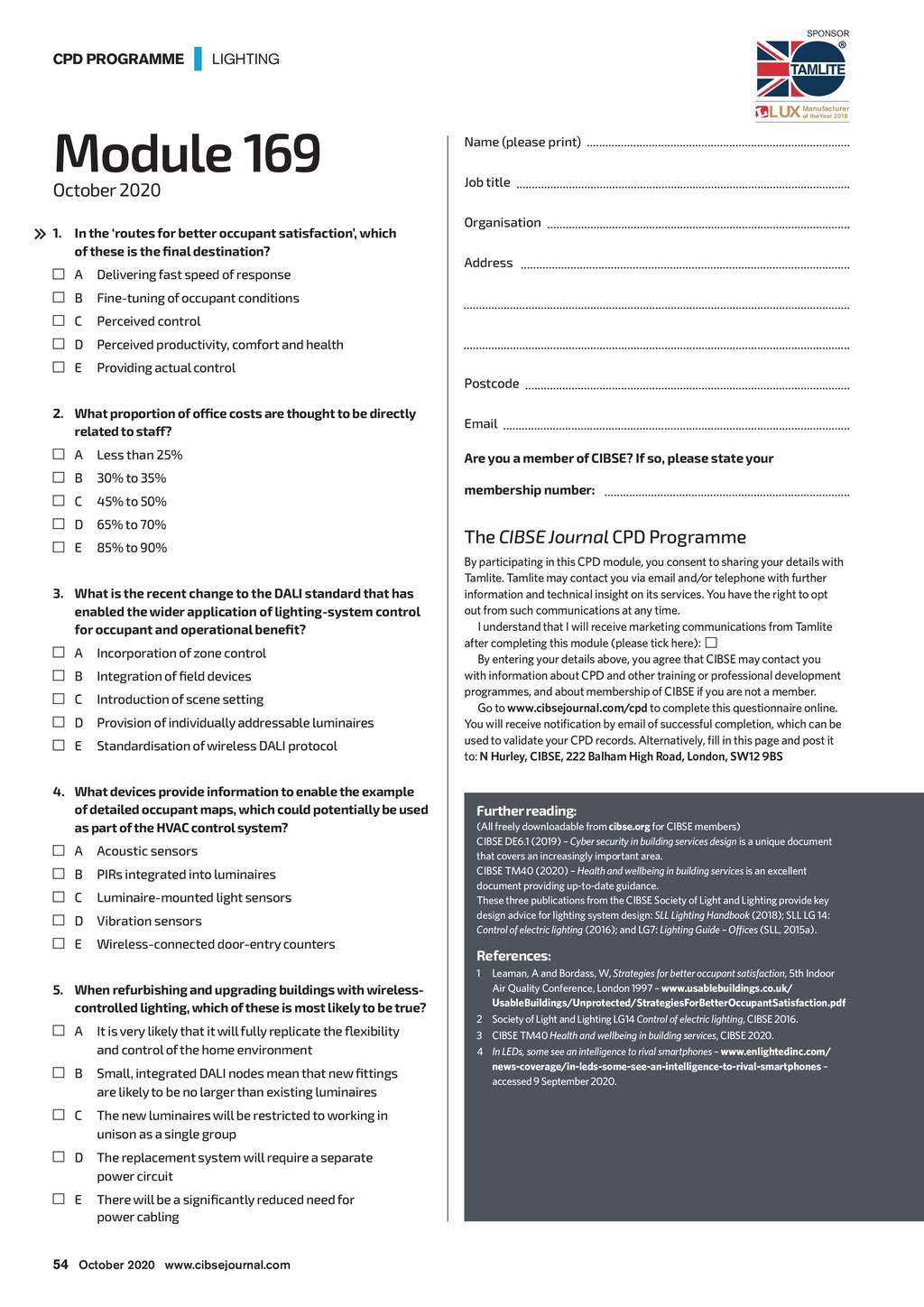 SPONSOR CPD PROGRAMME | LIGHTING Module 169 October 2020 1.In the routes for better occupant satisfaction, which of these is the final destination? A Delivering fast speed of response LUX Manufacturer of theYear 2018 Name (please print) Job title Organisation Address B Fine-tuning of occupant conditions C Perceived control D Perceived productivity, comfort and health E Providing actual control 2.What proportion of office costs are thought to be directly related to staff? A Less than 25% B 30% to 35% C 45% to 50% D 65% to 70% E 85% to 90% 3.What is the recent change to the DALI standard that has enabled the wider application of lighting-system control for occupant and operational benefit? A Incorporation of zone control B Integration of field devices C Introduction of scene setting D Provision of individually addressable luminaires E Standardisation of wireless DALI protocol 4.What devices provide information to enable the example of detailed occupant maps, which could potentially be used as part of the HVAC control system? A Acoustic sensors B PIRs integrated into luminaires C Luminaire-mounted light sensors D Vibration sensors E Wireless-connected door-entry counters Postcode Email Are you a member of CIBSE? If so, please state your membership number: The CIBSE Journal CPD Programme By participating in this CPD module, you consent to sharing your details with Tamlite. Tamlite may contact you via email and/or telephone with further information and technical insight on its services. You have the right to opt out from such communications at any time. I understand that I will receive marketing communications from Tamlite after completing this module (please tick here): By entering your details above, you agree that CIBSE may contact you with information about CPD and other training or professional development programmes, and about membership of CIBSE if you are not a member. Go to www.cibsejournal.com/cpd to complete this questionnaire online. You will receive notification by email of successful completion, which can be used to validate your CPD records. Alternatively, fill in this page and post it to: N Hurley, CIBSE, 222 Balham High Road, London, SW12 9BS Further reading: (All freely downloadable from cibse.org for CIBSE members) CIBSE DE6.1 (2019) Cyber security in building services design is a unique document that covers an increasingly important area. CIBSE TM40 (2020) Health and wellbeing in building services is an excellent document providing up-to-date guidance. These three publications from the CIBSE Society of Light and Lighting provide key design advice for lighting system design: SLL Lighting Handbook (2018); SLL LG 14: Control of electric lighting (2016); and LG7: Lighting Guide Offices (SLL, 2015a). References: 1 5.When refurbishing and upgrading buildings with wirelesscontrolled lighting, which of these is most likely to be true? A It is very likely that it will fully replicate the flexibility and control of the home environment B Small, integrated DALI nodes mean that new fittings are likely to be no larger than existing luminaires L eaman, A and Bordass, W, Strategies for better occupant satisfaction, 5th Indoor Air Quality Conference, London 1997 www.usablebuildings.co.uk/ UsableBuildings/Unprotected/StrategiesForBetterOccupantSatisfaction.pdf 2 Society of Light and Lighting LG14 Control of electric lighting, CIBSE 2016. 3 CIBSE TM40 Health and wellbeing in building services, CIBSE 2020. 4 In LEDs, some see an intelligence to rival smartphones www.enlightedinc.com/ news-coverage/in-leds-some-see-an-intelligence-to-rival-smartphones accessed 9 September 2020. C The new luminaires will be restricted to working in unison as a single group D The replacement system will require a separate power circuit E There will be a significantly reduced need for power cabling 54 October 2020 www.cibsejournal.com CIBSE Oct20 pp51-54 CPD169 Tamlite Supp v2.indd 54 25/09/2020 16:47