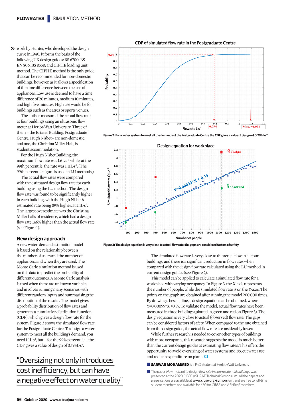 FLOWRATES | SIMULATION METHOD Probability CDF of simulated flow rate in the Postgraduate Centre Flowrate L.s-1 Figure 2: For a water system to meet all the demands of the Postgraduate Centre the CDF gives a value of design of 0.794L.s-1 Design equation for workplace Simulated flowrate Q L.s-1 work by Hunter, who developed the design curve in 1940. It forms the basis of the following UK design guides: BS 6700; BS EN 806; BS 8558; and CIPHE loading unit method. The CIPHE method is the only guide that can be recommended for non-domestic buildings, however, as it allows a specification of the time difference between the use of appliances. Low use is deemed to have a time difference of 20 minutes, medium 10 minutes, and high five minutes. High use would be for buildings such as theatres or sports venues. The author measured the actual flow rate at four buildings using an ultrasonic flow meter at Heriot-Watt University. Three of them the Estates Building, Postgraduate Centre, Hugh Nisbet are non-domestic, and one, the Christina Miller Hall, is student accommodation. For the Hugh Nisbet Building, the maximum flow rate was 1.6L.s-1, while, at the 99th percentile, the rate was 1.11L.s-1. (The 99th percentile figure is used in LU methods.) The actual flow rates were compared with the estimated design flow rate for each building using the LU method. The design flow rate was found to be significantly higher in each building, with the Hugh Nisbets estimated rate being 89% higher, at 2.1L.s-1. The largest overestimate was the Christina Miller halls of residence, which had a design flow rate 146% higher than the actual flow rate (see Figure 1). New design approach A new water-demand estimation model is based on the relationship between the number of users and the number of appliances, and when they are used. The Monte Carlo simulation method is used on this data to predict the probability of different outcomes. A Monte Carlo analysis is used when there are unknown variables and involves running many scenarios with different random inputs and summarising the distribution of the results. The model gives a probability distribution of flow rates and generates a cumulative distribution function (CDF), which gives a design flow rate for the system. Figure 2 shows the simulated flow rate for the Postgraduate Centre. To design a water system to meet all the buildings demand, you need 1.1L.s-1, but for the 99% percentile the CDF gives a value of design of 0.794L.s-1. Number of people Figure 3: The design equation is very close to actual flow rate; the gaps are considered factors of safety Oversizing not only introduces cost inefficiency, but can have a negative effect on water quality The simulated flow rate is very close to the actual flow in all four buildings, and there is a significant reduction in flow rates when compared with the design flow rate calculated using the LU method in current design guides (see Figure 2). This model can be applied to calculate a simulated flow rate for a workplace with varying occupancy. In Figure 3, the X-axis represents the number of people, while the simulated flow rate is on the Y-axis. The points on the graph are obtained after running the model 200,000 times. By drawing a best-fit line, a design equation can be obtained, where Y=0.00099*X +0.39. To validate the model, actual flow rates have been measured in three buildings (plotted in green and red on Figure 3). The design equation is very close to actual (observed) flow rate. The gaps can be considered factors of safety. When compared to the rate obtained from the design guide, the actual flow rate is considerably lower. While further research is needed to cover other types of buildings with more occupants, this research suggests the model is much better than the current design guides at estimating flow rates. This offers the opportunity to avoid oversizing of water systems and, so, cut water use and reduce expenditure on plant. CJ SARWAR MOHAMMED is a PhD student at Heriot-Watt University The paper New method to design flow rate in non-residential buildings was presented at the 2020 CIBSE ASHRAE Technical Symposium. All the papers and presentations are available at www.cibse.org/symposium, and are free to full-time student members and available for 50 for CIBSE and ASHRAE members. 56 October 2020 www.cibsejournal.com CIBSE Oct20 pp55-56 Flow rate method.indd 56 25/09/2020 16:47