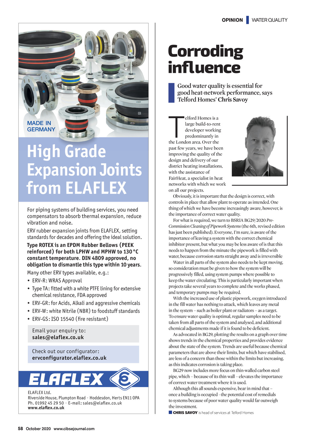 OPINION | WATER QUALITY Corroding influence Good water quality is essential for good heat-network performance, says Telford Homes Chris Savoy MADE IN GERMANY High Grade Expansion Joints from ELAFLEX For piping systems of building services, you need compensators to absorb thermal expansion, reduce vibration and noise. ERV rubber expansion joints from ELAFLEX, setting standards for decades and offering the ideal solution. Type ROTEX is an EPDM Rubber Bellows ( PEEK reinforced ) for both LPHW and MPHW to 130 C constant temperature. DIN 4809 approved, no obligation to dismantle this type within 10 years. Many other ERV types available, e.g.: ERV-R: WRAS Approval Type TA: fitted with a white PTFE lining for extensive chemical resistance, FDA approved ERV-GR: for Acids, Alkali and aggressive chemicals ERV-W: white Nitrile ( NBR ) to foodstuff standards ERV-GS: ISO 15540 ( fire resistant ) Email your enquiry to: sales@elaflex.co.uk Check out our configurator: ervconfigurator.elaflex.co.uk ELAFLEX Ltd. Riverside House, Plumpton Road Hoddesdon, Herts EN11 OPA Ph. 01992 45 29 50 E-mail: sales@elafl ex.co.uk www.elafl ex.co.uk Ad_2020_ERV_90x270_Ltd_EN.indd 1 58 October 2020 www.cibsejournal.com CIBSE Oct20 p58 Chris Savoy Telford Homes.indd 58 T elford Homes is a large build-to-rent developer working predominantly in the London area. Over the past few years, we have been improving the quality of the design and delivery of our district heating installations, with the assistance of FairHeat, a specialist in heat networks with which we work on all our projects. Obviously, it is important that the design is correct, with controls in place that allow plant to operate as intended. One thing of which we have become increasingly aware, however, is the importance of correct water quality. For what is required, we turn to BSRIA BG29/2020 PreCommission Cleaning of Pipework Systems (the 6th, revised edition has just been published). Everyone, Im sure, is aware of the importance of leaving a system with the correct chemical inhibitor present, but what you may be less aware of is that this needs to happen from the minute the pipework is filled with water, because corrosion starts straight away and is irreversible Water in all parts of the system also needs to be kept moving, so consideration must be given to how the system will be progressively filled, using system pumps where possible to keep the water circulating. This is particularly important when projects take several years to complete and the works phased, and temporary pumps may be required. With the increased use of plastic pipework, oxygen introduced in the fill water has nothing to attack, which leaves any metal in the system such as boiler plant or radiators as a target. To ensure water quality is optimal, regular samples need to be taken from all parts of the system and analysed, and additional chemical adjustments made if it is found to be deficient. As advocated in BG29, plotting the results on a graph over time shows trends in the chemical properties and provides evidence about the state of the system. Trends are useful because chemical parameters that are above their limits, but which have stabilised, are less of a concern than those within the limits but increasing, as this indicates corrosion is taking place. BG29 now includes more focus on thin-walled carbon steel pipe, which because of its thin wall elevates the importance of correct water treatment where it is used. Although this all sounds expensive, bear in mind that once a building is occupied the potential cost of remedials to systems because of poor water quality would far outweigh the investment. CHRIS SAVOY is head of services at Telford Homes 20.07.2020 10:43:40 25/09/2020 18:41