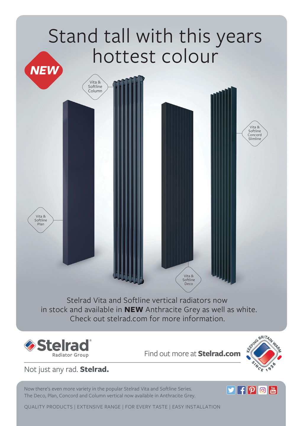 tand tall with this years hottest colour NEW Vita & Softline Column Vita & Softline Concord Slimline Vita & Softline Plan Vita & Softline Deco Stelrad Vita and Softline vertical radiators now in stock and available in NEW Anthracite Grey as well as white. Check out stelrad.com for more information. Find out more at Stelrad.com Not just any rad. Stelrad. Now theres even more variety in the popular Stelrad Vita and Softline Series. The Deco, Plan, Concord and Column vertical now available in Anthracite Grey. QUALITY PRODUCTS | EXTENSIVE RANGE | FOR EVERY TASTE | EASY INSTALLATION 6 October 2020 www.cibsejournal.com p06.CIBSEMagOct20.indd 6 22/09/2020 12:08