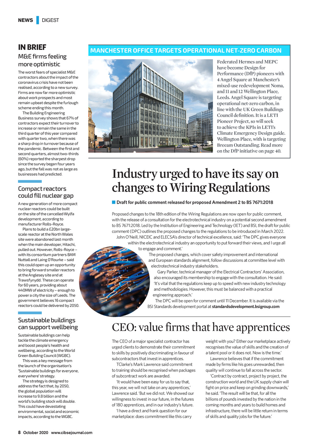 EWS | DIGEST IN BRIEF M&E firms feeling more optimistic MANCHESTER OFFICE TARGETS OPERATIONAL NET-ZERO CARBON The worst fears of specialist M&E contractors about the impact of the coronavirus crisis have not been realised, according to a new survey. Firms are now far more optimistic about work prospects and most remain upbeat despite the furlough scheme ending this month. The Building Engineering Business survey shows that 67% of contractors expect their turnover to increase or remain the same in the third quarter of this year compared with quarter two, when there was a sharp drop in turnover because of the pandemic. Between the first and second quarters, almost two-thirds (60%) reported the sharpest drop since the survey began four years ago, but the fall was not as large as businesses had predicted. Compact reactors could fill nuclear gap A new generation of more compact nuclear reactors could be built on the site of the cancelled Wylfa development, according to manufacturer Rolls-Royce. Plans to build a 20bn largescale reactor at the North Wales site were abandoned last month when the main developer, Hitachi, pulled out. However, Rolls-Royce with its consortium partners BAM Nuttall and Laing ORourke said this could open up an opportunity to bring forward smaller reactors at the Anglesey site and at Trawsfynydd. These can operate for 60 years, providing about 440MW of electricity enough to power a city the size of Leeds. The government believes 16 compact reactors could be delivered by 2050. Sustainable buildings can support wellbeing Sustainable buildings can help tackle the climate emergency and boost peoples health and wellbeing, according to the World Green Building Council (WGBC). This was a key message from the launch of the organisations Sustainable buildings for everyone, everywhere strategy. The strategy is designed to address the fact that, by 2050, the global population will increase to 9.8 billion and the worlds building stock will double. This could have devastating environmental, social and economic impacts, according to the WGBC. Federated Hermes and MEPC have become Design for Performance (DfP) pioneers with 4 Angel Square at Manchesters mixed-use redevelopment Noma, and 11 and 12 Wellington Place, Leeds. Angel Square is targeting operational net-zero carbon, in line with the UK Green Buildings Council definition. It is a LETI Pioneer Project, so will seek to achieve the KPIs in LETIs Climate Emergency Design guide. Wellington Place, with is targeting Breeam Outstanding. Read more on the DfP initiative on page 40. Industry urged to have its say on changes to Wiring Regulations Draft for public comment released for proposed Amendment 2 to BS 7671:2018 Proposed changes to the 18th edition of the Wiring Regulations are now open for public comment, with the release of a consultation for the electrotechnical industry on a potential second amendment to BS 7671:2018. Led by the Institution of Engineering and Technology (IET) and BSI, the draft for public comment (DPC) outlines the proposed changes to the regulations to be introduced in March 2022. John ONeill, NICEIC and ELECSAs director of technical excellence, said: The DPC gives everyone within the electrotechnical industry an opportunity to put forward their views, and I urge all to engage and comment. The proposed changes, which cover safety improvement and international and European standards alignment, follow discussions at committee level with electrotechnical industry stakeholders. Gary Parker, technical manager of the Electrical Contractors Association, also encouraged its membership to engage with the consultation. He said: Its vital that the regulations keep up to speed with new industry technology and methodologies. However, this must be balanced with a practical engineering approach. The DPC will be open for comment until 11 December. It is available via the BSI Standards development portal at standardsdevelopment.bsigroup.com CEO: value firms that have apprentices The CEO of a major specialist contractor has urged clients to demonstrate their commitment to skills by positively discriminating in favour of subcontractors that invest in apprentices. TClarkes Mark Lawrence said commitment to training should be recognised when packages of subcontract work are awarded. It would have been easy for us to say that, this year, we will not take on any apprentices, Lawrence said. But we did not. We showed our willingness to invest in our future, in the futures of 180 apprentices, and in our industrys future. I have a direct and frank question for our marketplace: does commitment like this carry weight with you? Either our marketplace actively recognises the value of skills and the creation of a talent pool or it does not. Now is the time. Lawrence believes that if the commitment made by firms like his goes unrewarded, then quality will continue to fall across the sector. Contract by contract, project by project, the construction world and the UK supply chain will fight on price and keep on grinding downwards, he said. The result will be that, for all the billions of pounds invested by the nation in the coming months and years to build homes and infrastructure, there will be little return in terms of skills and quality jobs for the future. 8 October 2020 www.cibsejournal.com CIBSE Oct20 pp08-09 News.indd 8 25/09/2020 14:20