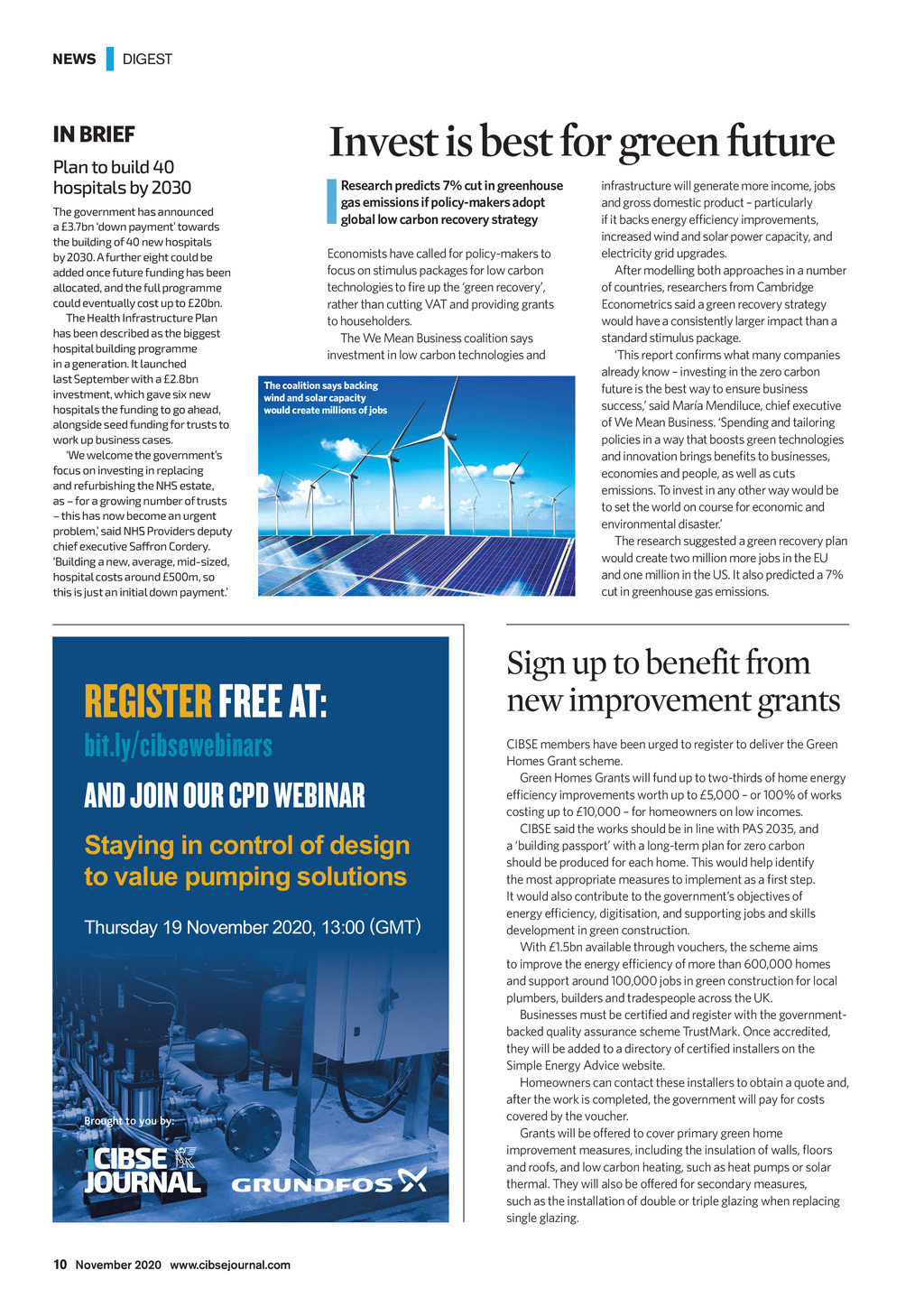 NEWS | DIGEST Invest is best for green future IN BRIEF Plan to build 40 hospitals by 2030 The government has announced a 3.7bn down payment towards the building of 40 new hospitals by 2030. A further eight could be added once future funding has been allocated, and the full programme could eventually cost up to 20bn. The Health Infrastructure Plan has been described as the biggest hospital building programme in a generation. It launched last September with a 2.8bn investment, which gave six new hospitals the funding to go ahead, alongside seed funding for trusts to work up business cases. We welcome the governments focus on investing in replacing and refurbishing the NHS estate, as for a growing number of trusts this has now become an urgent problem, said NHS Providers deputy chief executive Saffron Cordery. Building a new, average, mid-sized, hospital costs around 500m, so this is just an initial down payment. Research predicts 7% cut in greenhouse gas emissions if policy-makers adopt global low carbon recovery strategy Economists have called for policy-makers to focus on stimulus packages for low carbon technologies to re up the green recovery, rather than cutting VAT and providing grants to householders. The We Mean Business coalition says investment in low carbon technologies and The coalition says backing wind and solar capacity would create millions of jobs REGISTER FREE AT: bit.ly/cibsewebinars AND JOIN OUR CPD WEBINAR Staying in control of design to value pumping solutions Thursday 19 November 2020, 13:00 (GMT) Brought to you by: infrastructure will generate more income, jobs and gross domestic product particularly if it backs energy efciency improvements, increased wind and solar power capacity, and electricity grid upgrades. After modelling both approaches in a number of countries, researchers from Cambridge Econometrics said a green recovery strategy would have a consistently larger impact than a standard stimulus package. This report conrms what many companies already know investing in the zero carbon future is the best way to ensure business success, said Mara Mendiluce, chief executive of We Mean Business. Spending and tailoring policies in a way that boosts green technologies and innovation brings benets to businesses, economies and people, as well as cuts emissions. To invest in any other way would be to set the world on course for economic and environmental disaster. The research suggested a green recovery plan would create two million more jobs in the EU and one million in the US. It also predicted a 7% cut in greenhouse gas emissions. Sign up to benefit from new improvement grants CIBSE members have been urged to register to deliver the Green Homes Grant scheme. Green Homes Grants will fund up to two-thirds of home energy efciency improvements worth up to 5,000 or 100% of works costing up to 10,000 for homeowners on low incomes. CIBSE said the works should be in line with PAS 2035, and a building passport with a long-term plan for zero carbon should be produced for each home. This would help identify the most appropriate measures to implement as a rst step. It would also contribute to the governments objectives of energy efciency, digitisation, and supporting jobs and skills development in green construction. With 1.5bn available through vouchers, the scheme aims to improve the energy efciency of more than 600,000 homes and support around 100,000 jobs in green construction for local plumbers, builders and tradespeople across the UK. Businesses must be certied and register with the governmentbacked quality assurance scheme TrustMark. Once accredited, they will be added to a directory of certied installers on the Simple Energy Advice website. Homeowners can contact these installers to obtain a quote and, after the work is completed, the government will pay for costs covered by the voucher. Grants will be offered to cover primary green home improvement measures, including the insulation of walls, oors and roofs, and low carbon heating, such as heat pumps or solar thermal. They will also be offered for secondary measures, such as the installation of double or triple glazing when replacing single glazing. 10 November 2020 www.cibsejournal.com CIBSE Nov 2020 pp10 News.indd 10 23/10/2020 15:35