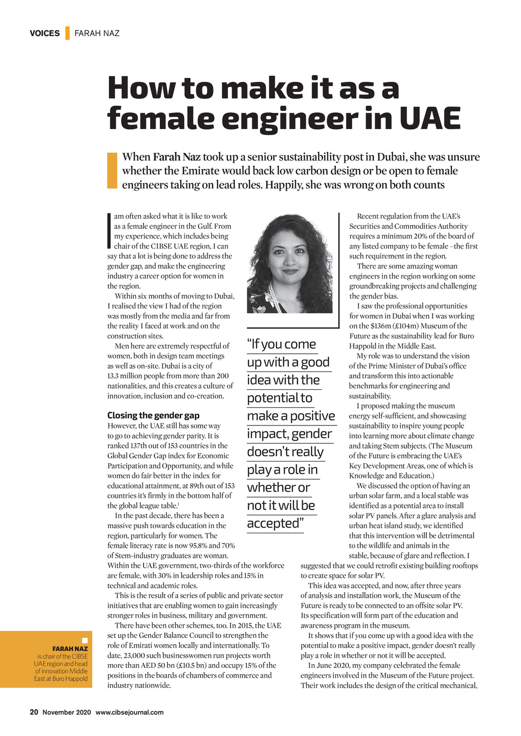 VOICES | FARAH NAZ How to make it as a female engineer in UAE When Farah Naz took up a senior sustainability post in Dubai, she was unsure whether the Emirate would back low carbon design or be open to female engineers taking on lead roles. Happily, she was wrong on both counts I am often asked what it is like to work as a female engineer in the Gulf. From my experience, which includes being chair of the CIBSE UAE region, I can say that a lot is being done to address the gender gap, and make the engineering industry a career option for women in the region. Within six months of moving to Dubai, I realised the view I had of the region was mostly from the media and far from the reality I faced at work and on the construction sites. Men here are extremely respectful of women, both in design team meetings as well as on-site. Dubai is a city of 13.3 million people from more than 200 nationalities, and this creates a culture of innovation, inclusion and co-creation. Closing the gender gap FARAH NAZ is chair of the CIBSE UAE region and head of innovation Middle East at Buro Happold Recent regulation from the UAEs Securities and Commodities Authority requires a minimum 20% of the board of any listed company to be female the first such requirement in the region. There are some amazing woman engineers in the region working on some groundbreaking projects and challenging the gender bias. I saw the professional opportunities for women in Dubai when I was working on the $136m (104m) Museum of the Future as the sustainability lead for Buro Happold in the Middle East. My role was to understand the vision of the Prime Minister of Dubais office and transform this into actionable benchmarks for engineering and sustainability. I proposed making the museum energy self-sufficient, and showcasing sustainability to inspire young people into learning more about climate change and taking Stem subjects. (The Museum of the Future is embracing the UAEs Key Development Areas, one of which is Knowledge and Education.) We discussed the option of having an urban solar farm, and a local stable was identified as a potential area to install solar PV panels. After a glare analysis and urban heat island study, we identified that this intervention will be detrimental to the wildlife and animals in the stable, because of glare and reflection. I suggested that we could retrofit existing building rooftops to create space for solar PV. This idea was accepted, and now, after three years of analysis and installation work, the Museum of the Future is ready to be connected to an offsite solar PV. Its specification will form part of the education and awareness program in the museum. It shows that if you come up with a good idea with the potential to make a positive impact, gender doesnt really play a role in whether or not it will be accepted. In June 2020, my company celebrated the female engineers involved in the Museum of the Future project. Their work includes the design of the critical mechanical, If you come up with a good idea with the potential to make a positive impact, gender doesnt really play a role in whether or not it will be accepted However, the UAE still has some way to go to achieving gender parity. It is ranked 137th out of 153 countries in the Global Gender Gap index for Economic Participation and Opportunity, and while women do fair better in the index for educational attainment, at 89th out of 153 countries its firmly in the bottom half of the global league table.1 In the past decade, there has been a massive push towards education in the region, particularly for women. The female literacy rate is now 95.8% and 70% of Stem-industry graduates are woman. Within the UAE government, two-thirds of the workforce are female, with 30% in leadership roles and 15% in technical and academic roles. This is the result of a series of public and private sector initiatives that are enabling women to gain increasingly stronger roles in business, military and government. There have been other schemes, too. In 2015, the UAE set up the Gender Balance Council to strengthen the role of Emirati women locally and internationally. To date, 23,000 such businesswomen run projects worth more than AED 50 bn (10.5 bn) and occupy 15% of the positions in the boards of chambers of commerce and industry nationwide. 20 November 2020 www.cibsejournal.com CIBSE Nov 20 pp20- 21 Farah Naz.indd 20 23/10/2020 18:11