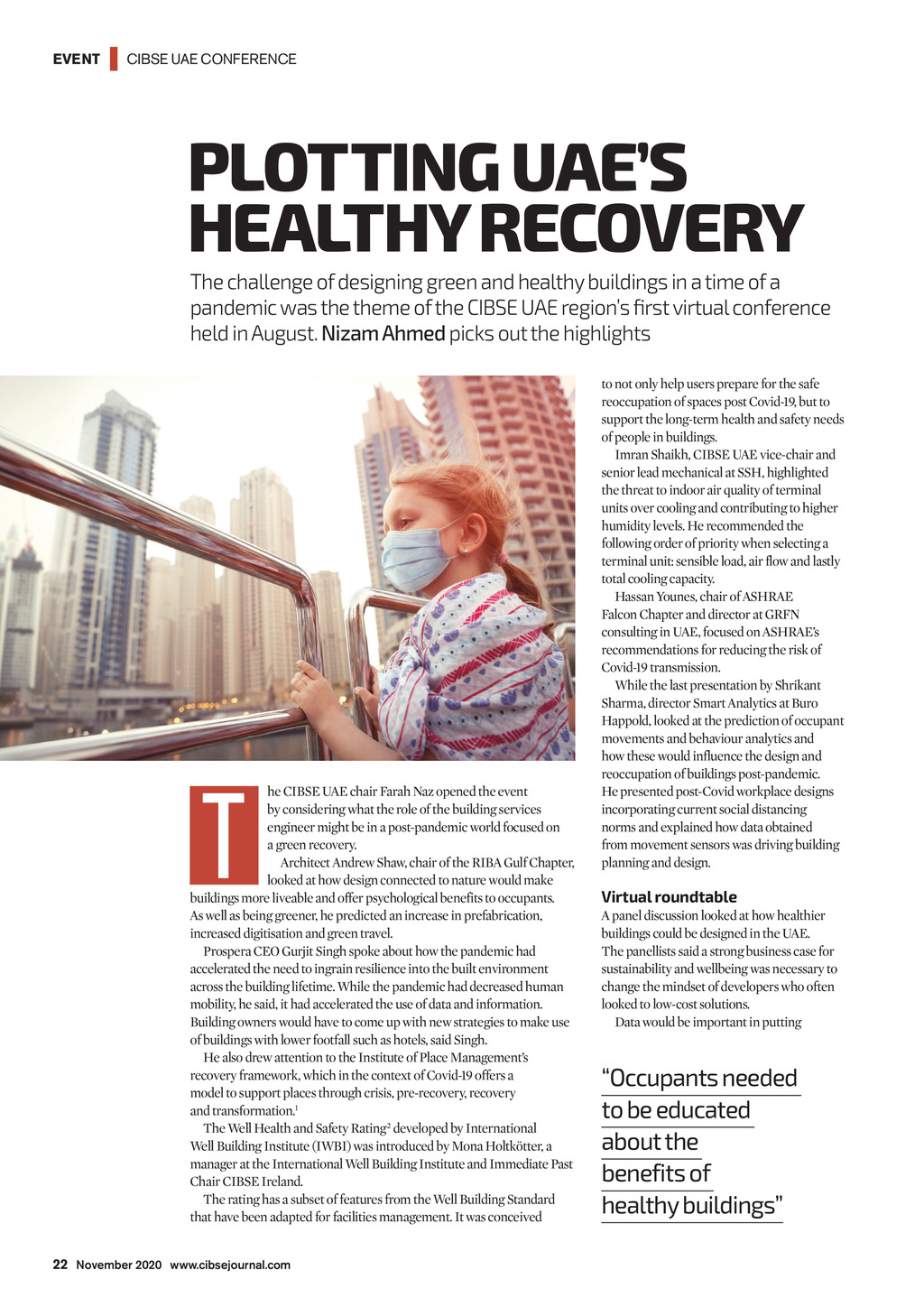 EVENT | CIBSE UAE CONFERENCE PLOTTING UAES HEALTHY RECOVERY The challenge of designing green and healthy buildings in a time of a pandemic was the theme of the CIBSE UAE regions first virtual conference held in August. Nizam Ahmed picks out the highlights T he CIBSE UAE chair Farah Naz opened the event by considering what the role of the building services engineer might be in a post-pandemic world focused on a green recovery. Architect Andrew Shaw, chair of the RIBA Gulf Chapter, looked at how design connected to nature would make buildings more liveable and offer psychological benefits to occupants. As well as being greener, he predicted an increase in prefabrication, increased digitisation and green travel. Prospera CEO Gurjit Singh spoke about how the pandemic had accelerated the need to ingrain resilience into the built environment across the building lifetime. While the pandemic had decreased human mobility, he said, it had accelerated the use of data and information. Building owners would have to come up with new strategies to make use of buildings with lower footfall such as hotels, said Singh. He also drew attention to the Institute of Place Managements recovery framework, which in the context of Covid-19 offers a model to support places through crisis, pre-recovery, recovery and transformation.1 The Well Health and Safety Rating 2 developed by International Well Building Institute (IWBI) was introduced by Mona Holtktter, a manager at the International Well Building Institute and Immediate Past Chair CIBSE Ireland. The rating has a subset of features from the Well Building Standard that have been adapted for facilities management. It was conceived to not only help users prepare for the safe reoccupation of spaces post Covid-19, but to support the long-term health and safety needs of people in buildings. Imran Shaikh, CIBSE UAE vice-chair and senior lead mechanical at SSH, highlighted the threat to indoor air quality of terminal units over cooling and contributing to higher humidity levels. He recommended the following order of priority when selecting a terminal unit: sensible load, air flow and lastly total cooling capacity. Hassan Younes, chair of ASHRAE Falcon Chapter and director at GRFN consulting in UAE, focused on ASHRAEs recommendations for reducing the risk of Covid-19 transmission. While the last presentation by Shrikant Sharma, director Smart Analytics at Buro Happold, looked at the prediction of occupant movements and behaviour analytics and how these would influence the design and reoccupation of buildings post-pandemic. He presented post-Covid workplace designs incorporating current social distancing norms and explained how data obtained from movement sensors was driving building planning and design. Virtual roundtable A panel discussion looked at how healthier buildings could be designed in the UAE. The panellists said a strong business case for sustainability and wellbeing was necessary to change the mindset of developers who often looked to low-cost solutions. Data would be important in putting Occupants needed to be educated about the benefits of healthy buildings 22 November 2020 www.cibsejournal.com CIBSE Oct 20 pp22-23 CIBSE Dubai UAE.indd 22 23/10/2020 15:44
