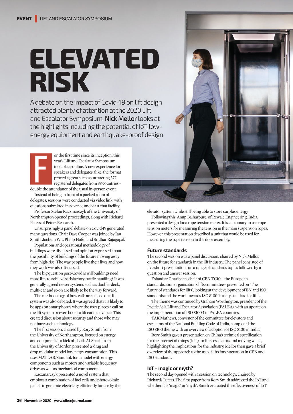 EVENT | LIFT AND ESCALATOR SYMPOSIUM ELEVATED RISK A debate on the impact of Covid-19 on lift design attracted plenty of attention at the 2020 Lift and Escalator Symposium. Nick Mellor looks at the highlights including the potential of IoT, lowenergy equipment and earthquake-proof design F or the first time since its inception, this years Lift and Escalator Symposium took place online. A new experience for speakers and delegates alike, the format proved a great success, attracting 377 registered delegates from 38 countries double the attendance of the usual in-person event. Instead of being in front of a packed room of delegates, sessions were conducted via video link, with questions submitted in advance and via a chat facility. Professor Stefan Kaczmarczyk of the University of Northampton opened proceedings, along with Richard Peters of Peters Research. Unsurprisingly, a panel debate on Covid-19 generated many questions. Chair Dave Cooper was joined by Ian Smith, Jochem Wit, Philip Hofer and Sridhar Rajagopal. Populations and operational methodology of buildings were discussed and opinion expressed about the possibility of buildings of the future moving away from high-rise. The way people live their lives and how they work was also discussed. The big question post-Covid is will buildings need more lifts to achieve satisfactory traffic handling? It was generally agreed newer systems such as double-deck, multi-car and so on are likely to be the way forward. The methodology of how calls are placed on a lift system was also debated. It was agreed that it is likely to be apps on smartphones where the user places a call on the lift system or even books a lift car in advance. This created discussion about security and those who may not have such technology. The first session, chaired by Rory Smith from the University of Northampton, focused on energy and equipment. To kick off, Lutfi Al-Sharif from the University of Jordon presented a drag and drop modular model for energy consumption. This uses MATLAB/Simulink for a model with energy components such as motors and variable frequency drives as well as mechanical components. Kaczmarczyk presented a novel system that employs a combination of fuel cells and photovoltaic panels to generate electricity efficiently for use by the elevator system while still being able to store surplus energy. Following this, Anup Balharpure, of Rewale Engineering, India, presented a design for a rope tension meter. It is customary to use rope tension meters for measuring the tension in the main suspension ropes. However, this presentation described a unit that would be used for measuring the rope tension in the door assembly. Future standards The second session was a panel discussion, chaired by Nick Mellor, on the future for standards in the lift industry. The panel consisted of five short presentations on a range of standards topics followed by a question and answer session. Esfandiar Gharibaan, chair of CEN TC10 the European standardisation organisations lifts committee presented on The future of standards for lifts, looking at the development of EN and ISO standards and the work towards ISO 8100-1 safety standard for lifts. The theme was continued by Graham Worthington, president of the Pacific Asia Lift and Escalator Association (PALEA), with an update on the implementation of ISO 8100-1 in PALEA countries. TAK Mathews, convenor of the committee for elevators and escalators of the National Building Code of India, completed the ISO 8100 theme with an overview of adoption of ISO 8100 in India. Rory Smith gave a presentation on Chinas technical specification for the internet of things (IoT) for lifts, escalators and moving walks, highlighting the implications for the industry. Mellor then gave a brief overview of the approach to the use of lifts for evacuation in CEN and ISO standards. IoT magic or myth? The second day opened with a session on technology, chaired by Richards Peters. The first paper from Rory Smith addressed the IoT and whether it is magic or myth. Smith evaluated the effectiveness of IoT 36 November 2020 www.cibsejournal.com CIBSE Nov20 pp36-37 Lift symposium.indd 36 23/10/2020 16:25