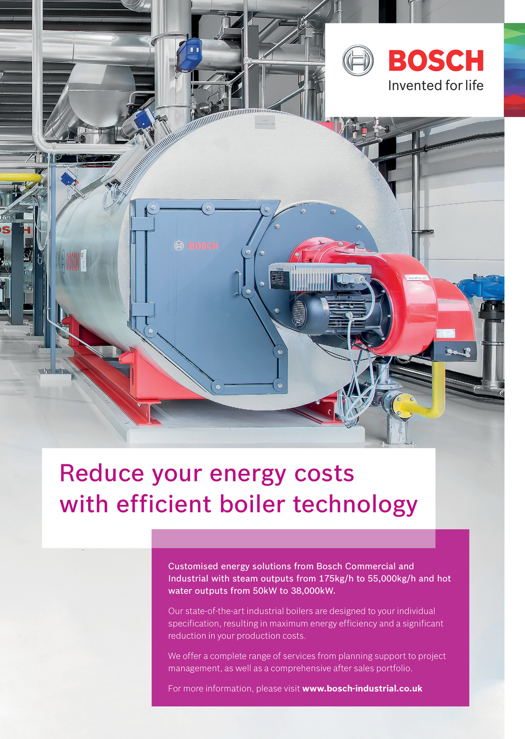 Reduce your energy costs with efficient boiler technology Customised energy solutions from Bosch Commercial and Industrial with steam outputs from 175kg/h to 55,000kg/h and hot water outputs from 50kW to 38,000kW. Our state-of-the-art industrial boilers are designed to your individual specification, resulting in maximum energy efficiency and a significant reduction in your production costs. We offer a complete range of services from planning support to project management, as well as a comprehensive after sales portfolio. For more information, please visit www.bosch-industrial.co.uk 44 November 2020 www.cibsejournal.com p44.CIBSEMagNov20.indd 44 20/10/2020 12:33