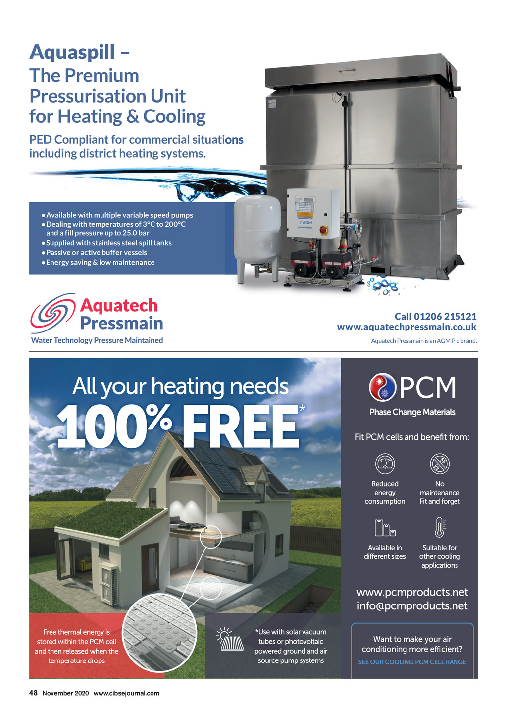 Aquaspill The Premium Pressurisation Unit for Heating & Cooling PED Compliant for commercial situations including district heating systems. Available with multiple variable speed pumps Dealing with temperatures of 3C to 200C and a fill pressure up to 25.0 bar Supplied with stainless steel spill tanks Passive or active buffer vessels Energy saving & low maintenance Call 01206 215121 www.aquatechpressmain.co.uk Aquatech Pressmain is an AGM Plc brand. 48 November 2020 www.cibsejournal.com p48.CIBSEMagNov20.indd 48 20/10/2020 12:39