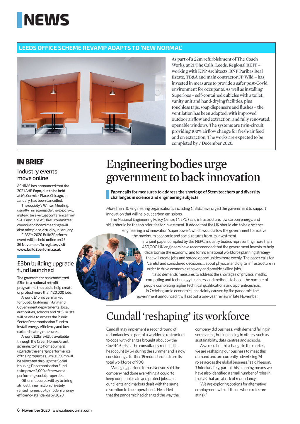 EWS LEEDS OFFICE SCHEME REVAMP ADAPTS TO NEW NORMAL As part of a 2m refurbishment of The Coach Works, at 21 The Calls, Leeds, Regional REIT working with KPP Architects, BNP Paribas Real Estate, TB&A and main contractor JP Wild has invested in measures to provide a safer post-Covid environment for occupants. As well as installing Superloos self-contained cubicles with a toilet, vanity unit and hand-drying facilities, plus touchless taps, soap dispensers and flushes the ventilation has been adapted, with improved outdoor airflow and extraction, and fully renovated, openable windows. The systems are twin-circuit, providing 100% airflow change for fresh-air feed and on extraction. The works are expected to be completed by 7 December 2020. IN BRIEF Industry events move online ASHRAE has announced that the 2021 AHR Expo, due to be held at McCormick Place, Chicago, in January, has been cancelled. The societys Winter Meeting, usually run alongside the expo, will instead be a virtual conference from 9-11 February. ASHRAE committee, council and board meetings will also take place virtually, in January. CIBSEs 2020 Build2Perform event will be held online on 2326 November. To register, visit www.build2perform.co.uk 3bn building upgrade fund launched The government has committed 3bn to a national retrofit programme that could help create or protect more than 120,000 jobs. Around 1bn is earmarked for public buildings in England. Government departments, local authorities, schools and NHS Trusts will be able to access the Public Sector Decarbonisation Fund to install energy efficiency and low carbon heating measures. Around 2bn will be available through the Green Homes Grant scheme, to help homeowners upgrade the energy performance of their properties, while 50m will be allocated through the Social Housing Decarbonisation Fund to improve 2,000 of the worstperforming social properties. Other measures will try to bring almost three million privately rented homes up to modern energy efficiency standards by 2028. Engineering bodies urge government to back innovation Paper calls for measures to address the shortage of Stem teachers and diversity challenges in science and engineering subjects More than 40 engineering organisations, including CIBSE, have urged the government to support innovation that will help cut carbon emissions. The National Engineering Policy Centre (NEPC) said infrastructure, low carbon energy, and skills should be the top priorities for investment. It added that the UK should aim to be a science, engineering and innovation superpower, which would allow the government to receive the maximum economic and social returns from its investment. In a joint paper compiled by the NEPC, industry bodies representing more than 450,000 UK engineers have recommended that the government invests to help decarbonise the economy, and forms a national workforce planning strategy that will create jobs and spread opportunities more evenly. The paper calls for careful and considered decisions about physical and digital infrastructure in order to drive economic recovery and provide skilled jobs. It also demands measures to address the shortages of physics, maths, computing and technology teachers, and methods to boost the number of people completing higher technical qualifications and apprenticeships. In October, amid economic uncertainty caused by the pandemic, the government announced it will set out a one-year review in late November. Cundall reshaping its workforce Cundall may implement a second round of redundancies as part of a workforce restructure to cope with changes brought about by the Covid-19 crisis. The consultancy reduced its headcount by 54 during the summer and is now considering a further 15 redundancies from its total workforce of 900. Managing partner Toms Neeson said the company had done everything it could to keep our people safe and protect jobs as our clients and markets dealt with the same disruption to their operations. He added that the pandemic had changed the way the company did business, with demand falling in some areas, but increasing in others, such as sustainability, data centres and schools. As a result of this change in the market, we are reshaping our business to meet this demand and are currently advertising 74 roles across the global business, said Neeson. Unfortunately, part of this planning means we have also identified a small number of roles in the UK that are at risk of redundancy. We are exploring options for alternative employment with all those whose roles are at risk. 6 November 2020 www.cibsejournal.com CIBSE Nov 2020 pp06-07 News.indd 6 23/10/2020 15:27