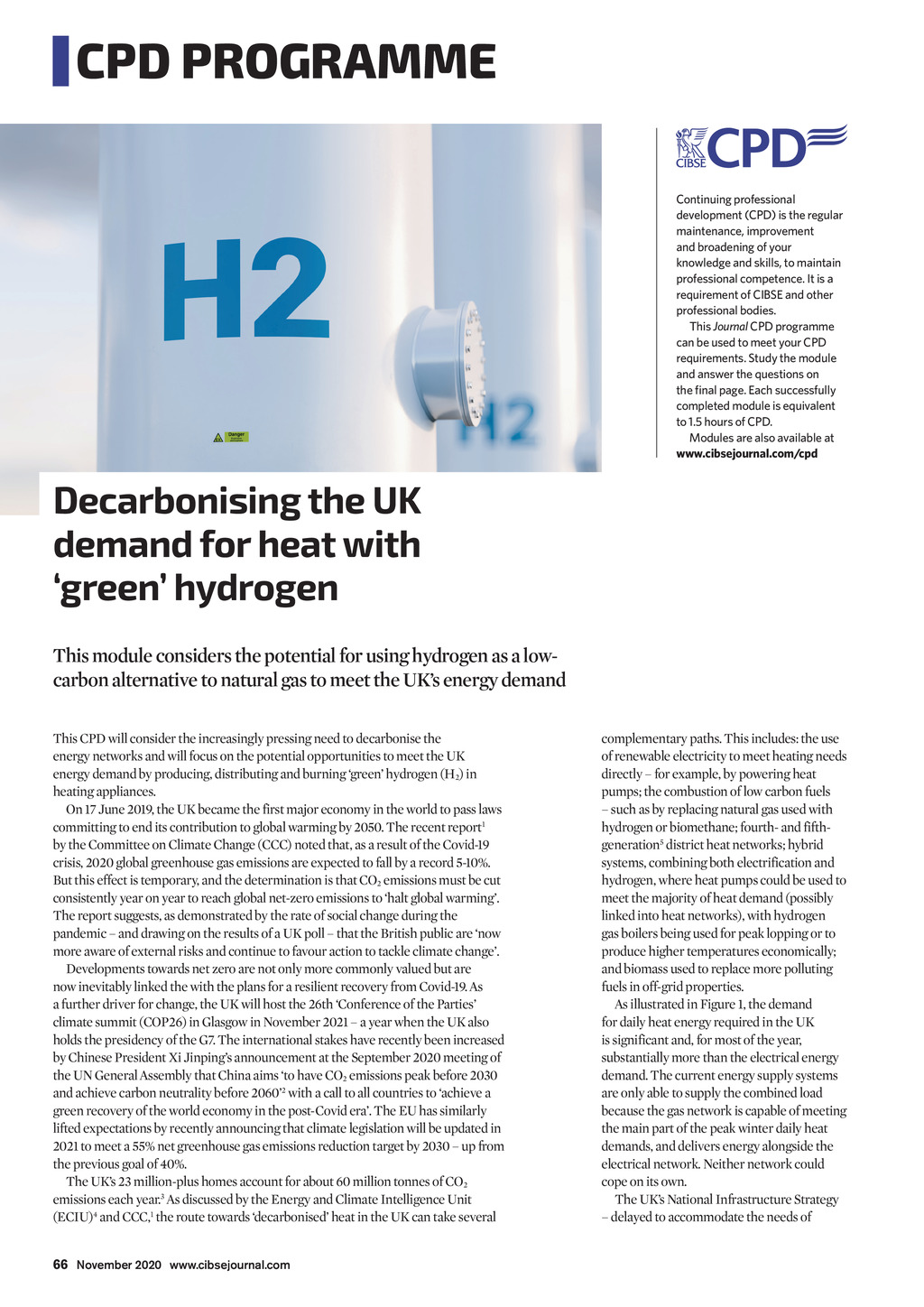 CPD PROGRAMME Continuing professional development (CPD) is the regular maintenance, improvement and broadening of your knowledge and skills, to maintain professional competence. It is a requirement of CIBSE and other professional bodies. This Journal CPD programme can be used to meet your CPD requirements. Study the module and answer the questions on the final page. Each successfully completed module is equivalent to 1.5 hours of CPD. Modules are also available at www.cibsejournal.com/cpd Decarbonising the UK demand for heat with green hydrogen This module considers the potential for using hydrogen as a lowcarbon alternative to natural gas to meet the UKs energy demand This CPD will consider the increasingly pressing need to decarbonise the energy networks and will focus on the potential opportunities to meet the UK energy demand by producing, distributing and burning green hydrogen (H2) in heating appliances. On 17 June 2019, the UK became the first major economy in the world to pass laws committing to end its contribution to global warming by 2050. The recent report1 by the Committee on Climate Change (CCC) noted that, as a result of the Covid-19 crisis, 2020 global greenhouse gas emissions are expected to fall by a record 5-10%. But this effect is temporary, and the determination is that CO2 emissions must be cut consistently year on year to reach global net-zero emissions to halt global warming. The report suggests, as demonstrated by the rate of social change during the pandemic and drawing on the results of a UK poll that the British public are now more aware of external risks and continue to favour action to tackle climate change. Developments towards net zero are not only more commonly valued but are now inevitably linked the with the plans for a resilient recovery from Covid-19. As a further driver for change, the UK will host the 26th Conference of the Parties climate summit (COP26) in Glasgow in November 2021 a year when the UK also holds the presidency of the G7. The international stakes have recently been increased by Chinese President Xi Jinpings announcement at the September 2020 meeting of the UN General Assembly that China aims to have CO2 emissions peak before 2030 and achieve carbon neutrality before 20602 with a call to all countries to achieve a green recovery of the world economy in the post-Covid era. The EU has similarly lifted expectations by recently announcing that climate legislation will be updated in 2021 to meet a 55% net greenhouse gas emissions reduction target by 2030 up from the previous goal of 40%. The UKs 23 million-plus homes account for about 60 million tonnes of CO2 emissions each year.3 As discussed by the Energy and Climate Intelligence Unit (ECIU)4 and CCC,1 the route towards decarbonised heat in the UK can take several complementary paths. This includes: the use of renewable electricity to meet heating needs directly for example, by powering heat pumps; the combustion of low carbon fuels such as by replacing natural gas used with hydrogen or biomethane; fourth- and fifthgeneration5 district heat networks; hybrid systems, combining both electrification and hydrogen, where heat pumps could be used to meet the majority of heat demand (possibly linked into heat networks), with hydrogen gas boilers being used for peak lopping or to produce higher temperatures economically; and biomass used to replace more polluting fuels in off-grid properties. As illustrated in Figure 1, the demand for daily heat energy required in the UK is significant and, for most of the year, substantially more than the electrical energy demand. The current energy supply systems are only able to supply the combined load because the gas network is capable of meeting the main part of the peak winter daily heat demands, and delivers energy alongside the electrical network. Neither network could cope on its own. The UKs National Infrastructure Strategy delayed to accommodate the needs of 66 November 2020 www.cibsejournal.com CIBSE Nov20 pp66-69 CPD 170 Baxi v2.indd 66 23/10/2020 16:42