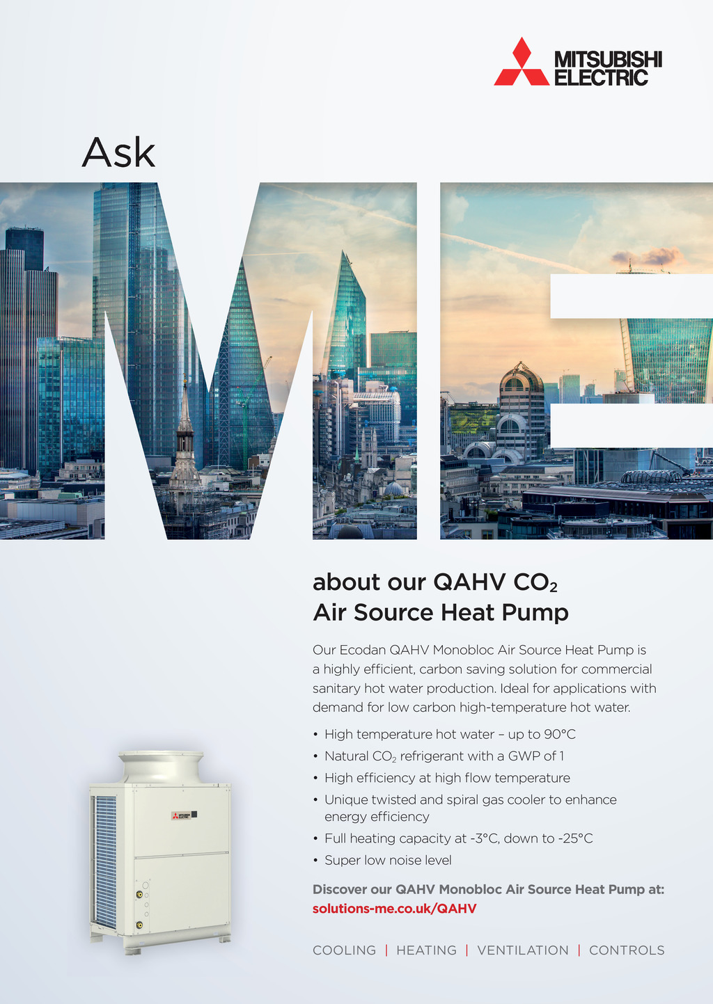 about our QAHV CO2 Air Source Heat Pump Ou Ecodan QAHV Monobloc Air Source Heat Pump is Our a high hly efficient, carbon saving solution for commercial sanitary hot ot water production. Ideal for applications wi with th demand for low carrbo bon n high-temperature hot water. High temperature hot water up to 90C Natural CO2 refrigerant with a GWP of 1 High efficiency at high ow temperature Unique twisted and spiral gas cooler to enhance energy efficiency Full heating capacity at -3C, down to -25C Super low noise level Discover our QAHV Monobloc Air Source Heat Pump at: solutions-me.co.uk/QAHV COOLING | HEATING | VENTILATION | CONTROLS 84 November 2020 www.cibsejournal.com p84.CIBSEMagNov20.indd 84 20/10/2020 13:05