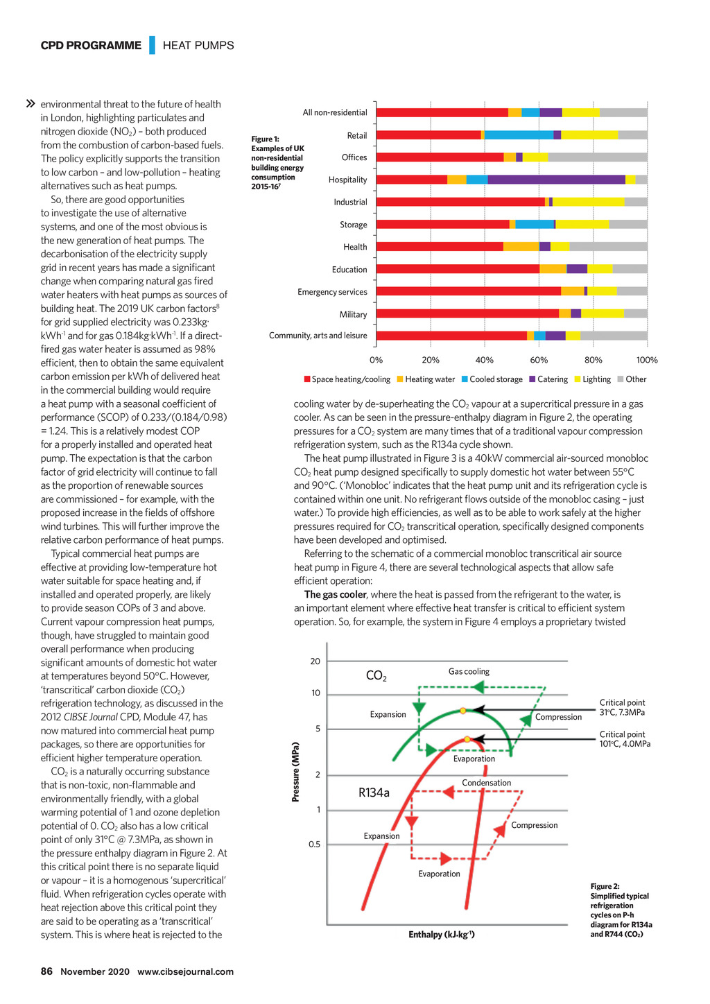 | HEAT PUMPS environmental threat to the future of health in London, highlighting particulates and nitrogen dioxide (NO2) both produced from the combustion of carbon-based fuels. The policy explicitly supports the transition to low carbon and low-pollution heating alternatives such as heat pumps. So, there are good opportunities to investigate the use of alternative systems, and one of the most obvious is the new generation of heat pumps. The decarbonisation of the electricity supply grid in recent years has made a significant change when comparing natural gas fired water heaters with heat pumps as sources of building heat. The 2019 UK carbon factors8 for grid supplied electricity was 0.233kg. kWh-1 and for gas 0.184kg.kWh-1. If a directfired gas water heater is assumed as 98% efficient, then to obtain the same equivalent carbon emission per kWh of delivered heat in the commercial building would require a heat pump with a seasonal coefficient of performance (SCOP) of 0.233/(0.184/0.98) = 1.24. This is a relatively modest COP for a properly installed and operated heat pump. The expectation is that the carbon factor of grid electricity will continue to fall as the proportion of renewable sources are commissioned for example, with the proposed increase in the fields of offshore wind turbines. This will further improve the relative carbon performance of heat pumps. Typical commercial heat pumps are effective at providing low-temperature hot water suitable for space heating and, if installed and operated properly, are likely to provide season COPs of 3 and above. Current vapour compression heat pumps, though, have struggled to maintain good overall performance when producing significant amounts of domestic hot water at temperatures beyond 50C. However, transcritical carbon dioxide (CO2) refrigeration technology, as discussed in the 2012 CIBSE Journal CPD, Module 47, has now matured into commercial heat pump packages, so there are opportunities for efficient higher temperature operation. CO2 is a naturally occurring substance that is non-toxic, non-flammable and environmentally friendly, with a global warming potential of 1 and ozone depletion potential of 0. CO2 also has a low critical point of only 31C @ 7.3MPa, as shown in the pressure enthalpy diagram in Figure 2. At this critical point there is no separate liquid or vapour it is a homogenous supercritical fluid. When refrigeration cycles operate with heat rejection above this critical point they are said to be operating as a transcritical system. This is where heat is rejected to the All non-residential Retail Figure 1: Examples of UK non-residential building energy consumption 2015-167 Offices Hospitality Industrial Storage Health Education Emergency services Military Community, arts and leisure 0% 20% 40% 60% 80% 100% Space heating/cooling Heating water Cooled storage Catering Lighting Other cooling water by de-superheating the CO2 vapour at a supercritical pressure in a gas cooler. As can be seen in the pressure-enthalpy diagram in Figure 2, the operating pressures for a CO2 system are many times that of a traditional vapour compression refrigeration system, such as the R134a cycle shown. The heat pump illustrated in Figure 3 is a 40kW commercial air-sourced monobloc CO2 heat pump designed specifically to supply domestic hot water between 55C and 90C. (Monobloc indicates that the heat pump unit and its refrigeration cycle is contained within one unit. No refrigerant flows outside of the monobloc casing just water.) To provide high efficiencies, as well as to be able to work safely at the higher pressures required for CO2 transcritical operation, specifically designed components have been developed and optimised. Referring to the schematic of a commercial monobloc transcritical air source heat pump in Figure 4, there are several technological aspects that allow safe efficient operation: The gas cooler, where the heat is passed from the refrigerant to the water, is an important element where effective heat transfer is critical to efficient system operation. So, for example, the system in Figure 4 employs a proprietary twisted 20 CO2 Gas cooling 10 Expansion Compression 5 Pressure (MPa) CPD PROGRAMME Critical point 31oC, 7.3MPa Critical point 101oC, 4.0MPa Evaporation 2 Condensation R134a 1 0.5 Compression Expansion Evaporation Enthalpy (kJ.kg-1) Figure 2: Simplified typical refrigeration cycles on P-h diagram for R134a and R744 (CO2) 86 November 2020 www.cibsejournal.com CIBSE Nov 2020 pp85-88 CPD Mitsubishi 171.indd 86 23/10/2020 16:49