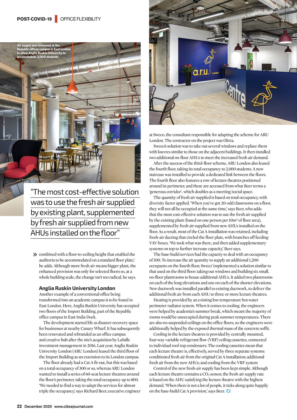 POST-COVID-19 | OFFICE FLEXIBILITY Air supply was increased at the Republic ofces campus in East London to allow Anglia Ruskin University to accommodate 2,000 students The most cost-effective solution was to use the fresh air supplied by existing plant, supplemented by fresh air supplied from new AHUs installed on the floor combined with a floor-to-ceiling height that enabled the auditoria to be accommodated on a standard floor plate, he adds. Although more fresh air means bigger plant, the enhanced provision was only for selected floors so, at a whole building scale, the change isnt too radical, he says. Anglia Ruskin University London Another example of a conventional office being transformed into an academic campus is to be found in East London. Here, Anglia Ruskin University has occupied two floors of the Import Building, part of the Republic office campus in East India Dock. The development started life as disaster-recovery space for businesses at nearby Canary Wharf. It has subsequently been renovated and rebranded as an office campus and creative hub after the sites acquisition by LaSalle investment management in 2016. Last year, Anglia Ruskin University London (ARU London) leased the third floor of the Import Building as an extension to its London campus. The floor already had a Cat A fit-out, but this was based on a total occupancy of 300 or so, whereas ARU London wanted to install a series of 60-seat lecture theatres around the floors perimeter, taking the total occupancy up to 800. We needed to find a way to adapt the services for almost triple the occupancy, says Richard Beer, executive engineer at Sweco, the consultant responsible for adapting the scheme for ARU London. The contractor on the project was Oktra. Swecos solution was to take out several windows and replace them with louvres similar to those on the adjacent buildings. It then installed two additional on-floor AHUs to meet the increased fresh air demand. After the success of the third-floor scheme, ARU London also leased the fourth floor, taking its total occupancy to 2,000 students. A new staircase was installed to provide a dedicated link between the floors. The fourth floor also features a row of lecture theatres positioned around its perimeter, and these are accessed from what Beer terms a generous corridor, which doubles as a meeting/social space. The quantity of fresh air supplied is based on total occupancy, with diversity factor applied. When youve got 20-odd classrooms on a floor, they will not all be occupied at the same time, says Beer, who adds that the most cost-effective solution was to use the fresh air supplied by the existing plant (based on one person per 10m2 of floor area), supplemented by fresh air supplied from new AHUs installed on the floor. As a result, most of the Cat A installation was retained, including fresh-air ducting that circled the floor plate, with branches off feeding VAV boxes. We took what was there, and then added supplementary systems on top to further increase capacity, Beer says. The base-build services had the capacity to deal with an occupancy of 300. To increase the air quantity to supply an additional 1,200 occupants on the fourth floor, Sweco implemented a solution similar to that used on the third floor: taking out windows and building six small, on-floor plantrooms to house additional AHUs. It added two plantrooms on each of the long elevations and one on each of the shorter elevations. New ductwork was installed parallel to existing ductwork, to deliver the additional fresh air from each AHU to three or more lecture theatres. Heating is provided by an existing low temperature hot water perimeter radiator system. When it comes to cooling, the engineers were helped by academias summer break, which meant the majority of rooms would be unoccupied during peak summer temperatures. There are also no suspended ceilings on the office floors, so the engineers were additionally helped by the exposed thermal mass of the concrete soffit. Cooling in the lecture theatres is provided by centrally mounted, four-way variable refrigerant flow (VRF) ceiling cassettes, connected to individual roof-top condensers. The cooling cassettes mean that each lecture theatre is, effectively, served by three separate systems: conditioned fresh air from the original Cat A installation; additional fresh air from the new AHUs; and cooling from the VRF system Control of the new fresh-air supply has been kept simple. Although each lecture theatre contains a CO2 sensor, the fresh-air supply rate is based on the AHU satisfying the lecture theatre with the highest demand. When there is not a lot of people, it ticks along quite happily on the base-build Cat A provision, says Beer. CJ 22 December 2020 www.cibsejournal.com CIBSE Dec20 pp20-22 Covid office flexibility .indd 22 20/11/2020 14:57