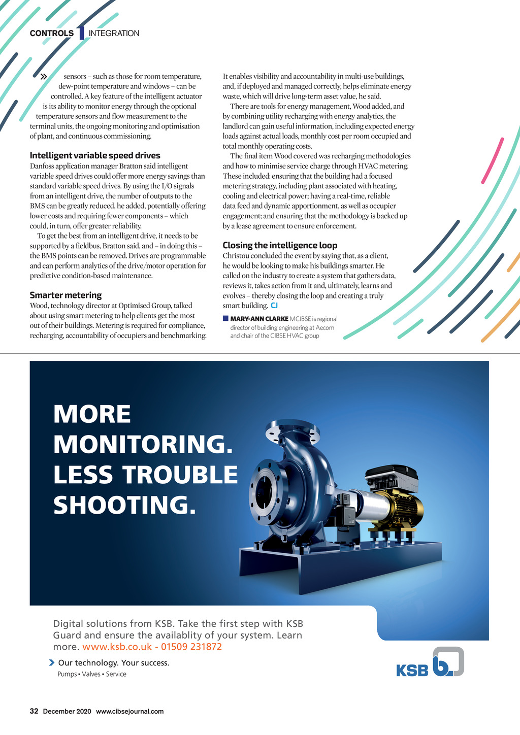 CONTROLS | INTEGRATION sensors such as those for room temperature, dew-point temperature and windows can be controlled. A key feature of the intelligent actuator is its ability to monitor energy through the optional temperature sensors and flow measurement to the terminal units, the ongoing monitoring and optimisation of plant, and continuous commissioning. Intelligent variable speed drives Danfoss application manager Bratton said intelligent variable speed drives could offer more energy savings than standard variable speed drives. By using the I/O signals from an intelligent drive, the number of outputs to the BMS can be greatly reduced, he added, potentially offering lower costs and requiring fewer components which could, in turn, offer greater reliability. To get the best from an intelligent drive, it needs to be supported by a fieldbus, Bratton said, and in doing this the BMS points can be removed. Drives are programmable and can perform analytics of the drive/motor operation for predictive condition-based maintenance. Smarter metering Wood, technology director at Optimised Group, talked about using smart metering to help clients get the most out of their buildings. Metering is required for compliance, recharging, accountability of occupiers and benchmarking. It enables visibility and accountability in multi-use buildings, and, if deployed and managed correctly, helps eliminate energy waste, which will drive long-term asset value, he said. There are tools for energy management, Wood added, and by combining utility recharging with energy analytics, the landlord can gain useful information, including expected energy loads against actual loads, monthly cost per room occupied and total monthly operating costs. The final item Wood covered was recharging methodologies and how to minimise service charge through HVAC metering. These included: ensuring that the building had a focused metering strategy, including plant associated with heating, cooling and electrical power; having a real-time, reliable data feed and dynamic apportionment, as well as occupier engagement; and ensuring that the methodology is backed up by a lease agreement to ensure enforcement. Closing the intelligence loop Christou concluded the event by saying that, as a client, he would be looking to make his buildings smarter. He called on the industry to create a system that gathers data, reviews it, takes action from it and, ultimately, learns and evolves thereby closing the loop and creating a truly smart building. CJ MARY-ANN CLARKE MCIBSE is regional director of building engineering at Aecom and chair of the CIBSE HVAC group , MORE MONITORING. LESS TROUBLE SHOOTING. Digital solutions from KSB. Take the first step with KSB Guard and ensure the availablity of your system. Learn more. www.ksb.co.uk - 01509 231872 Pumps Valves Service 32 December 2020 www.cibsejournal.com CIBSE Dec20 pp30-32 Smart HVAC systems.indd 32 20/11/2020 15:59