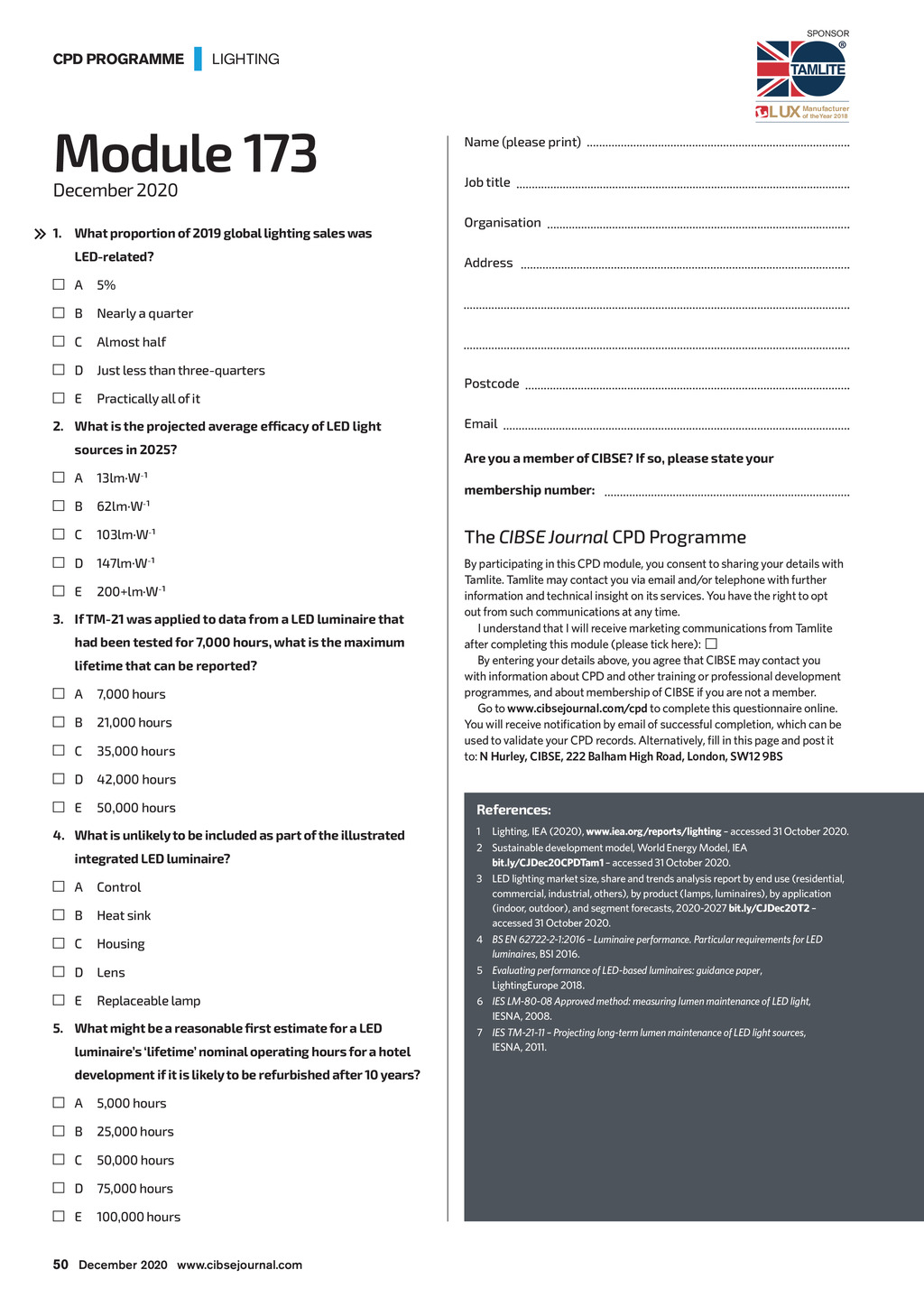 SPONSOR CPD PROGRAMME | LIGHTING LUX Manufacturer of theYear 2018 Module 173 December 2020 1. What proportion of 2019 global lighting sales was LED-related? A 5% B Nearly a quarter C Almost half D Just less than three-quarters E Practically all of it 2. What is the projected average efficacy of LED light sources in 2025? Name (please print) Job title Organisation Address Postcode Email Are you a member of CIBSE? If so, please state your A 13lm.W- B 62lm.W- C 103lm.W- The CIBSE Journal CPD Programme D 147lm.W- E 200+lm.W- By participating in this CPD module, you consent to sharing your details with Tamlite. Tamlite may contact you via email and/or telephone with further information and technical insight on its services. You have the right to opt out from such communications at any time. I understand that I will receive marketing communications from Tamlite after completing this module (please tick here): By entering your details above, you agree that CIBSE may contact you with information about CPD and other training or professional development programmes, and about membership of CIBSE if you are not a member. Go to www.cibsejournal.com/cpd to complete this questionnaire online. You will receive notification by email of successful completion, which can be used to validate your CPD records. Alternatively, fill in this page and post it to: N Hurley, CIBSE, 222 Balham High Road, London, SW12 9BS 3. If TM-21 was applied to data from a LED luminaire that had been tested for 7,000 hours, what is the maximum lifetime that can be reported? A 7,000 hours B 21,000 hours C 35,000 hours D 42,000 hours E 50,000 hours 4. What is unlikely to be included as part of the illustrated integrated LED luminaire? A Control B Heat sink C Housing D Lens E Replaceable lamp 5. What might be a reasonable first estimate for a LED luminaires lifetime nominal operating hours for a hotel membership number: References: 1 Lighting, IEA (2020), www.iea.org/reports/lighting accessed 31 October 2020. 2 Sustainable development model, World Energy Model, IEA bit.ly/CJDec20CPDTam1 accessed 31 October 2020. 3 LED lighting market size, share and trends analysis report by end use (residential, commercial, industrial, others), by product (lamps, luminaires), by application (indoor, outdoor), and segment forecasts, 2020-2027 bit.ly/CJDec20T2 accessed 31 October 2020. 4 BS EN 62722-2-1:2016 Luminaire performance. Particular requirements for LED luminaires, BSI 2016. 5 Evaluating performance of LED-based luminaires: guidance paper, LightingEurope 2018. 6 IES LM-80-08 Approved method: measuring lumen maintenance of LED light, IESNA, 2008. 7 IES TM-21-11 Projecting long-term lumen maintenance of LED light sources, IESNA, 2011. development if it is likely to be refurbished after 10 years? A 5,000 hours B 25,000 hours C 50,000 hours D 75,000 hours E 100,000 hours 50 December 2020 www.cibsejournal.com CIBSE DEC20 pp47-50 Supp CPD173 Tamlite v3.indd 50 20/11/2020 16:26