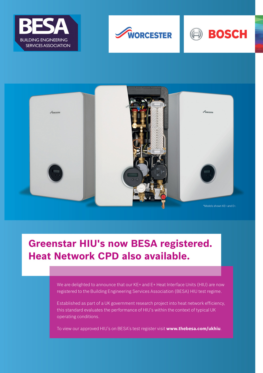 Models shown KE+ and E+. Greenstar HIU s now BESA registered. Heat Network CPD also available. We are delighted to announce that our KE+ and E+ Heat Interface Units (HIU) are now registered to the Building Engineering Services Association (BESA) HIU test regime. Established as part of a UK government research project into heat network efficiency, this standard evaluates the performance of HIUs within the context of typical UK operating conditions. To view our approved HIUs on BESAs test register visit www.thebesa.com/ukhiu. 6 December 2020 www.cibsejournal.com p06.CIBSEMagDec20.indd 6 16/11/2020 12:16