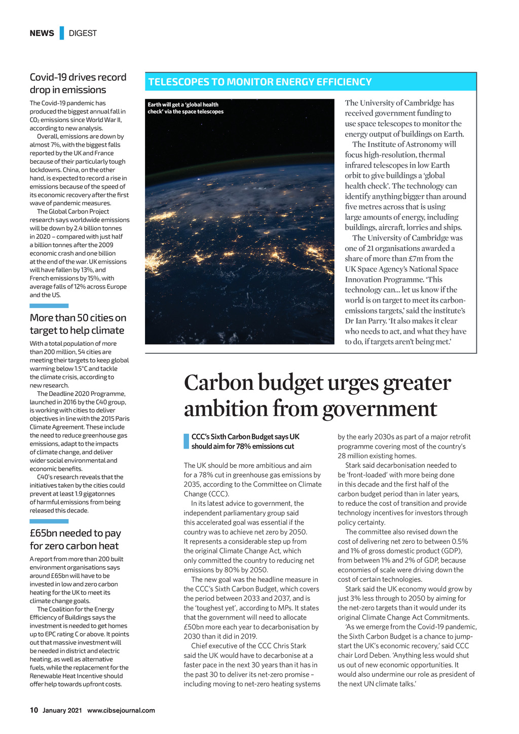 NEWS | DIGEST Covid-19 drives record drop in emissions The Covid-19 pandemic has produced the biggest annual fall in CO2 emissions since World War II, according to new analysis. Overall, emissions are down by almost 7%, with the biggest falls reported by the UK and France because of their particularly tough lockdowns. China, on the other hand, is expected to record a rise in emissions because of the speed of its economic recovery after the first wave of pandemic measures. The Global Carbon Project research says worldwide emissions will be down by 2.4 billion tonnes in 2020 compared with just half a billion tonnes after the 2009 economic crash and one billion at the end of the war. UK emissions will have fallen by 13%, and French emissions by 15%, with average falls of 12% across Europe and the US. TELESCOPES TO MONITOR ENERGY EFFICIENCY Earth will get a global health check via the space telescopes More than 50 cities on target to help climate With a total population of more than 200 million, 54 cities are meeting their targets to keep global warming below 1.5C and tackle the climate crisis, according to new research. The Deadline 2020 Programme, launched in 2016 by the C40 group, is working with cities to deliver objectives in line with the 2015 Paris Climate Agreement. These include the need to reduce greenhouse gas emissions, adapt to the impacts of climate change, and deliver wider social environmental and economic benefits. C40s research reveals that the initiatives taken by the cities could prevent at least 1.9 gigatonnes of harmful emissions from being released this decade. 65bn needed to pay for zero carbon heat A report from more than 200 built environment organisations says around 65bn will have to be invested in low and zero carbon heating for the UK to meet its climate change goals. The Coalition for the Energy Efficiency of Buildings says the investment is needed to get homes up to EPC rating C or above. It points out that massive investment will be needed in district and electric heating, as well as alternative fuels, while the replacement for the Renewable Heat Incentive should offer help towards upfront costs. The University of Cambridge has received government funding to use space telescopes to monitor the energy output of buildings on Earth. The Institute of Astronomy will focus high-resolution, thermal infrared telescopes in low Earth orbit to give buildings a global health check. The technology can identify anything bigger than around five metres across that is using large amounts of energy, including buildings, aircraft, lorries and ships. The University of Cambridge was one of 21 organisations awarded a share of more than 7m from the UK Space Agencys National Space Innovation Programme. This technology can let us know if the world is on target to meet its carbonemissions targets, said the institutes Dr Ian Parry. It also makes it clear who needs to act, and what they have to do, if targets arent being met. Carbon budget urges greater ambition from government CCCs Sixth Carbon Budget says UK should aim for 78% emissions cut The UK should be more ambitious and aim for a 78% cut in greenhouse gas emissions by 2035, according to the Committee on Climate Change (CCC). In its latest advice to government, the independent parliamentary group said this accelerated goal was essential if the country was to achieve net zero by 2050. It represents a considerable step up from the original Climate Change Act, which only committed the country to reducing net emissions by 80% by 2050. The new goal was the headline measure in the CCCs Sixth Carbon Budget, which covers the period between 2033 and 2037, and is the toughest yet, according to MPs. It states that the government will need to allocate 50bn more each year to decarbonisation by 2030 than it did in 2019. Chief executive of the CCC Chris Stark said the UK would have to decarbonise at a faster pace in the next 30 years than it has in the past 30 to deliver its net-zero promise including moving to net-zero heating systems by the early 2030s as part of a major retrofit programme covering most of the countrys 28 million existing homes. Stark said decarbonisation needed to be front-loaded with more being done in this decade and the first half of the carbon budget period than in later years, to reduce the cost of transition and provide technology incentives for investors through policy certainty. The committee also revised down the cost of delivering net zero to between 0.5% and 1% of gross domestic product (GDP), from between 1% and 2% of GDP, because economies of scale were driving down the cost of certain technologies. Stark said the UK economy would grow by just 3% less through to 2050 by aiming for the net-zero targets than it would under its original Climate Change Act Commitments. As we emerge from the Covid-19 pandemic, the Sixth Carbon Budget is a chance to jumpstart the UKs economic recovery, said CCC chair Lord Deben. Anything less would shut us out of new economic opportunities. It would also undermine our role as president of the next UN climate talks. 10 January 2021 www.cibsejournal.com CIBSE Jan21 pp10 News.indd 10 18/12/2020 14:16