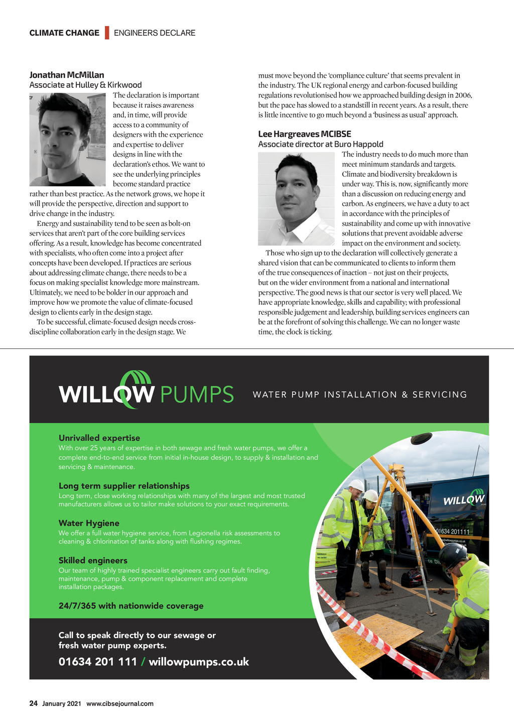 CLIMATE CHANGE | ENGINEERS DECLARE Jonathan McMillan Associate at Hulley & Kirkwood The declaration is important because it raises awareness and, in time, will provide access to a community of designers with the experience and expertise to deliver designs in line with the declarations ethos. We want to see the underlying principles become standard practice rather than best practice. As the network grows, we hope it will provide the perspective, direction and support to drive change in the industry. Energy and sustainability tend to be seen as bolt-on services that arent part of the core building services offering. As a result, knowledge has become concentrated with specialists, who often come into a project after concepts have been developed. If practices are serious about addressing climate change, there needs to be a focus on making specialist knowledge more mainstream. Ultimately, we need to be bolder in our approach and improve how we promote the value of climate-focused design to clients early in the design stage. To be successful, climate-focused design needs crossdiscipline collaboration early in the design stage. We must move beyond the compliance culture that seems prevalent in the industry. The UK regional energy and carbon-focused building regulations revolutionised how we approached building design in 2006, but the pace has slowed to a standstill in recent years. As a result, there is little incentive to go much beyond a business as usual approach. Lee Hargreaves MCIBSE Associate director at Buro Happold The industry needs to do much more than meet minimum standards and targets. Climate and biodiversity breakdown is under way. This is, now, significantly more than a discussion on reducing energy and carbon. As engineers, we have a duty to act in accordance with the principles of sustainability and come up with innovative solutions that prevent avoidable adverse impact on the environment and society. Those who sign up to the declaration will collectively generate a shared vision that can be communicated to clients to inform them of the true consequences of inaction not just on their projects, but on the wider environment from a national and international perspective. The good news is that our sector is very well placed. We have appropriate knowledge, skills and capability; with professional responsible judgement and leadership, building services engineers can be at the forefront of solving this challenge. We can no longer waste time, the clock is ticking. W AT E R P U M P I N S TA L L AT I O N & S E R V I C I N G Unrivalled expertise With over 25 years of expertise in both sewage and fresh water pumps, we offer a complete end-to-end service from initial in-house design, to supply & installation and servicing & maintenance. Long term supplier relationships Long term, close working relationships with many of the largest and most trusted manufacturers allows us to tailor make solutions to your exact requirements. Water Hygiene We offer a full water hygiene service, from Legionella risk assessments to cleaning & chlorination of tanks along with flushing regimes. Skilled engineers Our team of highly trained specialist engineers carry out fault finding, maintenance, pump & component replacement and complete installation packages. 24/7/365 with nationwide coverage Call to speak directly to our sewage or fresh water pump experts. 01634 201 111 / willowpumps.co.uk 24 January 2021 www.cibsejournal.com CIBSE Jan21 pp22-24 Building Services Declare.indd 24 18/12/2020 14:29