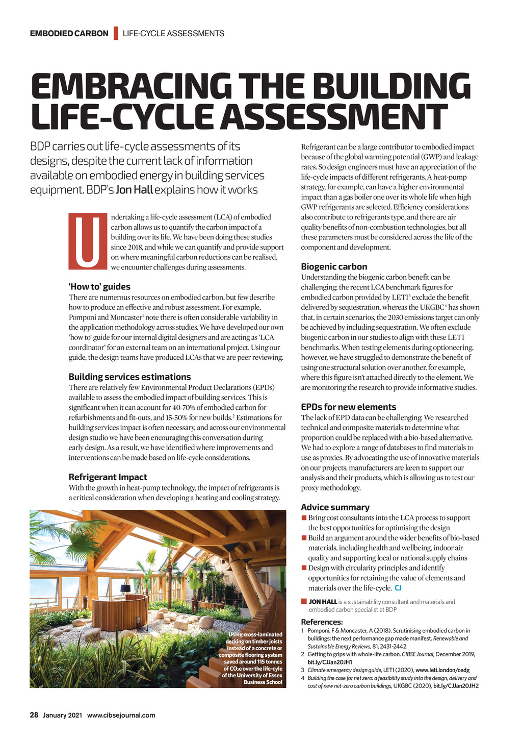 EMBODIED CARBON | LIFE-CYCLE ASSESSMENTS EMBRACING THE BUILDING LIFE-CYCLE ASSESSMENT BDP carries out life-cycle assessments of its designs, despite the current lack of information available on embodied energy in building services equipment. BDPs Jon Hall explains how it works U ndertaking a life-cycle assessment (LCA) of embodied carbon allows us to quantify the carbon impact of a building over its life. We have been doing these studies since 2018, and while we can quantify and provide support on where meaningful carbon reductions can be realised, we encounter challenges during assessments. How to guides There are numerous resources on embodied carbon, but few describe how to produce an effective and robust assessment. For example, Pomponi and Moncaster1 note there is often considerable variability in the application methodology across studies. We have developed our own how to guide for our internal digital designers and are acting as LCA coordinator for an external team on an international project. Using our guide, the design teams have produced LCAs that we are peer reviewing. Building services estimations There are relatively few Environmental Product Declarations (EPDs) available to assess the embodied impact of building services. This is significant when it can account for 40-70% of embodied carbon for refurbishments and fit-outs, and 15-50% for new builds.2 Estimations for building services impact is often necessary, and across our environmental design studio we have been encouraging this conversation during early design. As a result, we have identified where improvements and interventions can be made based on life-cycle considerations. Refrigerant Impact With the growth in heat-pump technology, the impact of refrigerants is a critical consideration when developing a heating and cooling strategy. Refrigerant can be a large contributor to embodied impact because of the global warming potential (GWP) and leakage rates. So design engineers must have an appreciation of the life-cycle impacts of different refrigerants. A heat-pump strategy, for example, can have a higher environmental impact than a gas boiler one over its whole life when high GWP refrigerants are selected. Efficiency considerations also contribute to refrigerants type, and there are air quality benefits of non-combustion technologies, but all these parameters must be considered across the life of the component and development. Biogenic carbon Understanding the biogenic carbon benefit can be challenging; the recent LCA benchmark figures for embodied carbon provided by LETI3 exclude the benefit delivered by sequestration, whereas the UKGBC4 has shown that, in certain scenarios, the 2030 emissions target can only be achieved by including sequestration. We often exclude biogenic carbon in our studies to align with these LETI benchmarks. When testing elements during optioneering, however, we have struggled to demonstrate the benefit of using one structural solution over another, for example, where this figure isnt attached directly to the element. We are monitoring the research to provide informative studies. EPDs for new elements The lack of EPD data can be challenging. We researched technical and composite materials to determine what proportion could be replaced with a bio-based alternative. We had to explore a range of databases to find materials to use as proxies. By advocating the use of innovative materials on our projects, manufacturers are keen to support our analysis and their products, which is allowing us to test our proxy methodology. Advice summary n Bring cost consultants into the LCA process to support the best opportunities for optimising the design n Build an argument around the wider benefits of bio-based materials, including health and wellbeing, indoor air quality and supporting local or national supply chains n Design with circularity principles and identify opportunities for retaining the value of elements and materials over the life-cycle. CJ J ON HALL is a sustainability consultant and materials and embodied carbon specialist at BDP References: Using cross-laminated decking on timber joists instead of a concrete or composite flooring system saved around 115 tonnes of CO2e over the life-cyle of the University of Essex Business School 1 P omponi, F & Moncaster, A (2018). Scrutinising embodied carbon in buildings: the next performance gap made manifest. Renewable and Sustainable Energy Reviews, 81, 2431-2442. 2 Getting to grips with whole-life carbon, CIBSE Journal, December 2019, bit.ly/CJJan20JH1 3 Climate emergency design guide, LETI (2020), www.leti.london/cedg 4 Building the case for net zero: a feasibility study into the design, delivery and cost of new net-zero carbon buildings, UKGBC (2020), bit.ly/CJJan20JH2 28 January 2021 www.cibsejournal.com CIBSE Jan21 pp28 BDP embodied carbon.indd 28 18/12/2020 14:36