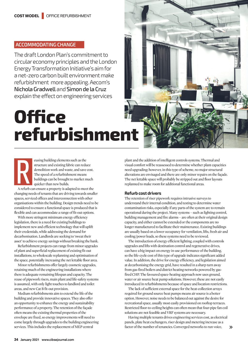 COST MODEL | OFFICE REFURBISHMENT ACCOMMODATING CHANGE The draft London Plans commitment to circular economy principles and the London Energy Transformation Initiatives aim for a net-zero carbon built environment make refurbishment more appealing. Aecoms Nichola Gradwell and Simon de la Cruz explain the effect on engineering services Office refurbishment R eusing building elements such as the structure and existing fabric can reduce demolition work and waste, and save cost. The speed of a refurbishment means buildings can be brought to market much quicker than new builds. A refurb can ensure a property is adapted to meet the changing needs of tenants that are driving towards smaller spaces, serviced offices and interconnection with other organisations within the building. Design trends need to be considered to ensure a functional space is produced that is flexible and can accommodate a range of fit-out options. With more stringent minimum energy efficiency legislation, there is a need for existing buildings to implement new and efficient technology that will uplift their credentials, while addressing the demand for decarbonisation. Landlords are seeking to sweat their asset to achieve energy savings without breaking the bank. Refurbishment projects can range from minor upgrades of plant and superficial replacement of existing fit-out installations, to wholescale replanning and optimisation of the space, potentially increasing the net lettable floor area. Minor refurbishments offer largely cosmetic upgrades, retaining much of the engineering installations where there is adequate remaining lifespan and capacity. The reuse of pipework risers, main plant and life-safety systems is assumed, with only light touches to landlord and toilet areas, and new Cat B fit-out provision. Medium refurbishments aim to extend the life of the building and provide innovative spaces. They also offer an opportunity to enhance the energy and sustainability performance of a property. The retention of the faade often means the existing thermal properties of the envelope are fixed, so energy improvements will need to come largely through upgrades to the building engineering services. This includes the replacement of MEP central plant and the addition of intelligent controls systems. Thermal and visual comfort will be reassessed to determine whether plant capacities need upgrading; however, in this type of scheme, no major structural alterations are envisaged and there are only minor repairs on the faade. The net lettable space will probably be stripped out and floor layouts replanned to make room for additional functional areas. Refurb cost drivers The retention of riser pipework requires intrusive surveys to understand their internal condition, and testing to determine water contamination risks, especially if any parts of the system are to remain operational during the project. Many systems such as lighting control, building management and fire alarms are often at their original design capacity, and either cannot be extended or the components are no longer manufactured to facilitate their maintenance. Existing buildings are usually based on a lower occupancy for ventilation, lifts, fresh air and cooling/power loads, so these systems need to be reviewed. The introduction of energy efficient lighting, coupled with controls upgrades and lifts with destination control and regenerative drives, can have a big impact on energy in-use performance of the building, so the life-cycle cost of this type of upgrade indicates significant added value. In addition, the drive for energy efficiency, and legislation aimed at decarbonising the energy grid, have resulted in a sharp turn away from gas-fired boilers and district heating networks powered by gasfired CHP. The favoured space-heating approach now uses ground, water or air source heat pump solutions. However, these are not easily introduced in refurbishments because of space and location restrictions. The lack of sufficient external space for the heat-collection arrays required for ground source heat pumps means air source is a better option. However, noise needs to be balanced out against the desire for recreational space, usually most easily provisioned on rooftop terraces. Restricted floor-to-ceiling heights can often mean that four-pipe fan coil solutions are not feasible and VRF systems are necessary. Having multiple tenants drives engineering services cost, as electrical panels, plate heat exchangers, riser design and metering increase as a factor of the number of tenancies. Converged networks to run voice, 34 January 2021 www.cibsejournal.com CIBSE Jan21 pp34-36 Cost model.indd 34 18/12/2020 14:52