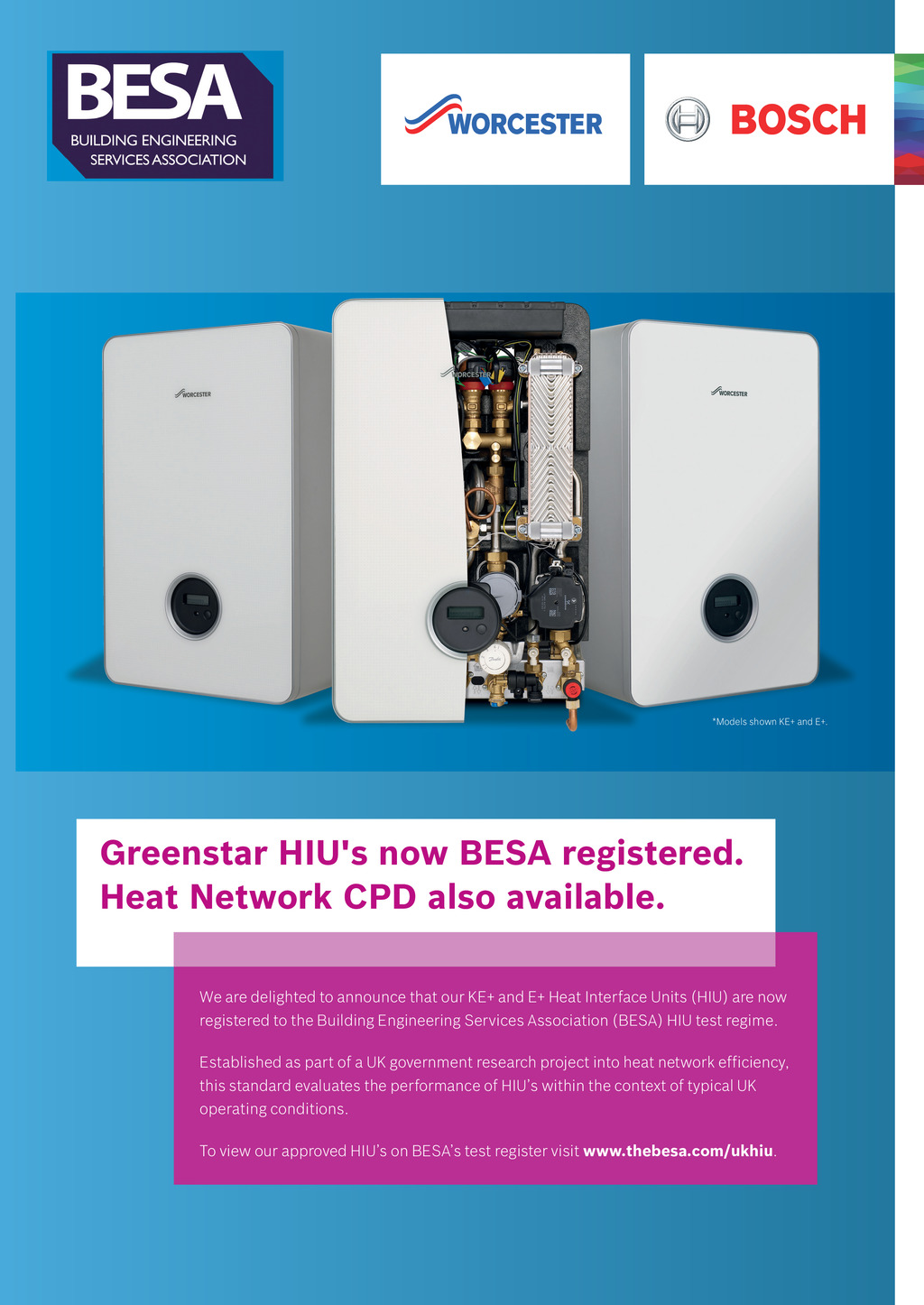 *Models shown KE+ and E+. Greenstar HIU s now BESA registered. Heat Network CPD also available. We are delighted to announce that our KE+ and E+ Heat Interface Units (HIU) are now registered to the Building Engineering Services Association (BESA) HIU test regime. Established as part of a UK government research project into heat network efficiency, this standard evaluates the performance of HIUs within the context of typical UK operating conditions. To view our approved HIUs on BESAs test register visit www.thebesa.com/ukhiu. 4 January 2021 www.cibsejournal.com p04.CIBSEMagJan21.indd 4 15/12/2020 16:40