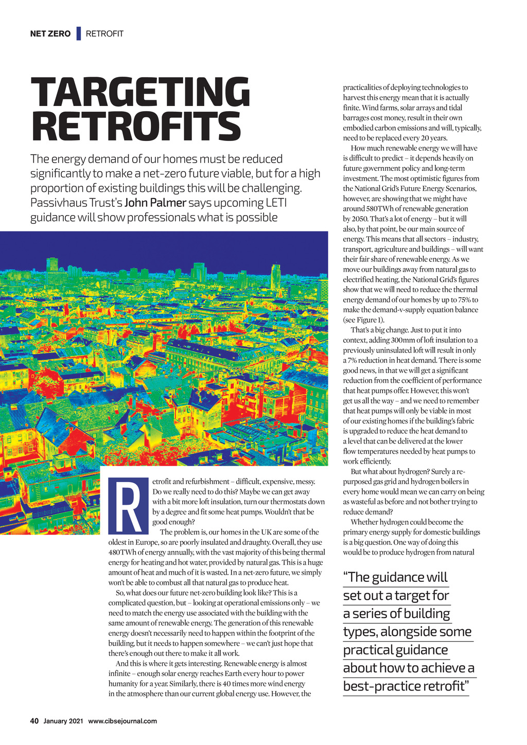 NET ZERO | RETROFIT TARGETING RETROFITS The energy demand of our homes must be reduced significantly to make a net-zero future viable, but for a high proportion of existing buildings this will be challenging. Passivhaus Trusts John Palmer says upcoming LETI guidance will show professionals what is possible R etrofit and refurbishment difficult, expensive, messy. Do we really need to do this? Maybe we can get away with a bit more loft insulation, turn our thermostats down by a degree and fit some heat pumps. Wouldnt that be good enough? The problem is, our homes in the UK are some of the oldest in Europe, so are poorly insulated and draughty. Overall, they use 480TWh of energy annually, with the vast majority of this being thermal energy for heating and hot water, provided by natural gas. This is a huge amount of heat and much of it is wasted. In a net-zero future, we simply wont be able to combust all that natural gas to produce heat. So, what does our future net-zero building look like? This is a complicated question, but looking at operational emissions only we need to match the energy use associated with the building with the same amount of renewable energy. The generation of this renewable energy doesnt necessarily need to happen within the footprint of the building, but it needs to happen somewhere we cant just hope that theres enough out there to make it all work. And this is where it gets interesting. Renewable energy is almost infinite enough solar energy reaches Earth every hour to power humanity for a year. Similarly, there is 40 times more wind energy in the atmosphere than our current global energy use. However, the practicalities of deploying technologies to harvest this energy mean that it is actually finite. Wind farms, solar arrays and tidal barrages cost money, result in their own embodied carbon emissions and will, typically, need to be replaced every 20 years. How much renewable energy we will have is difficult to predict it depends heavily on future government policy and long-term investment. The most optimistic figures from the National Grids Future Energy Scenarios, however, are showing that we might have around 580TWh of renewable generation by 2050. Thats a lot of energy but it will also, by that point, be our main source of energy. This means that all sectors industry, transport, agriculture and buildings will want their fair share of renewable energy. As we move our buildings away from natural gas to electrified heating, the National Grids figures show that we will need to reduce the thermal energy demand of our homes by up to 75% to make the demand-v-supply equation balance (see Figure 1). Thats a big change. Just to put it into context, adding 300mm of loft insulation to a previously uninsulated loft will result in only a 7% reduction in heat demand. There is some good news, in that we will get a significant reduction from the coefficient of performance that heat pumps offer. However, this wont get us all the way and we need to remember that heat pumps will only be viable in most of our existing homes if the buildings fabric is upgraded to reduce the heat demand to a level that can be delivered at the lower flow temperatures needed by heat pumps to work efficiently. But what about hydrogen? Surely a repurposed gas grid and hydrogen boilers in every home would mean we can carry on being as wasteful as before and not bother trying to reduce demand? Whether hydrogen could become the primary energy supply for domestic buildings is a big question. One way of doing this would be to produce hydrogen from natural The guidance will set out a target for a series of building types, alongside some practical guidance about how to achieve a best-practice retrofit 40 January 2021 www.cibsejournal.com CIBSE Jan21 pp40-41 LETI retrofit.indd 40 18/12/2020 17:08