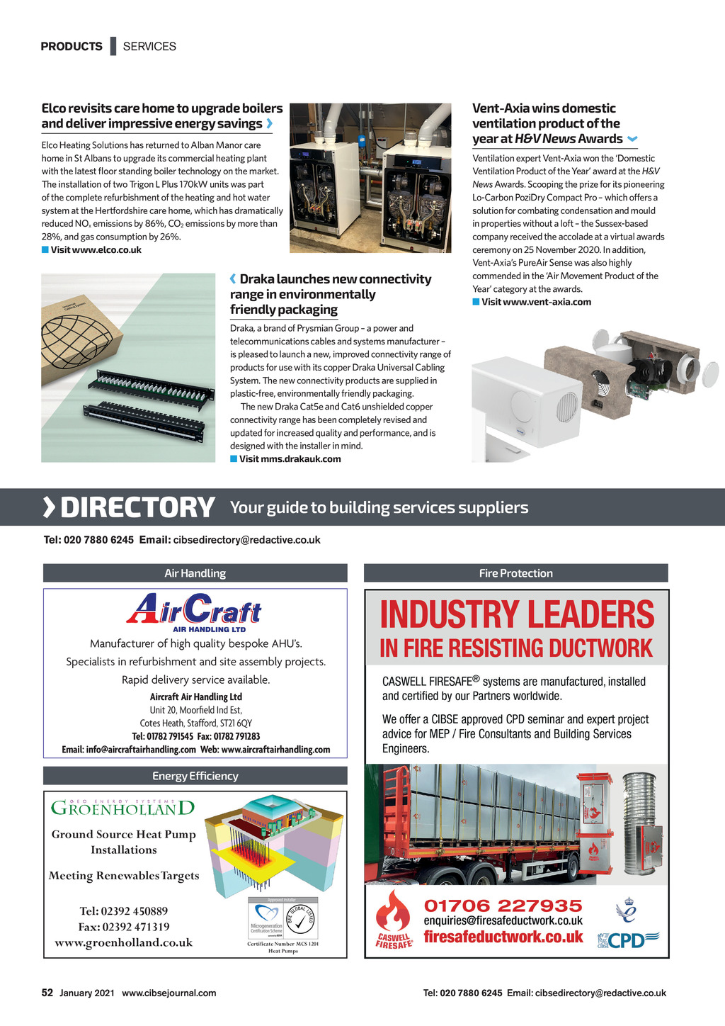 PRODUCTS | SERVICES Vent-Axia wins domestic ventilation product of the year at H&V News Awards Elco revisits care home to upgrade boilers and deliver impressive energy savings Elco Heating Solutions has returned to Alban Manor care home in St Albans to upgrade its commercial heating plant with the latest floor standing boiler technology on the market. The installation of two Trigon L Plus 170kW units was part of the complete refurbishment of the heating and hot water system at the Hertfordshire care home, which has dramatically reduced NOx emissions by 86%, CO2 emissions by more than 28%, and gas consumption by 26%. Visit www.elco.co.uk Draka launches new connectivity range in environmentally friendly packaging Ventilation expert Vent-Axia won the Domestic Ventilation Product of the Year award at the H&V News Awards. Scooping the prize for its pioneering Lo-Carbon PoziDry Compact Pro which offers a solution for combating condensation and mould in properties without a loft the Sussex-based company received the accolade at a virtual awards ceremony on 25 November 2020. In addition, Vent-Axias PureAir Sense was also highly commended in the Air Movement Product of the Year category at the awards. Visit www.vent-axia.com Draka, a brand of Prysmian Group a power and telecommunications cables and systems manufacturer is pleased to launch a new, improved connectivity range of products for use with its copper Draka Universal Cabling System. The new connectivity products are supplied in plastic-free, environmentally friendly packaging. The new Draka Cat5e and Cat6 unshielded copper connectivity range has been completely revised and updated for increased quality and performance, and is designed with the installer in mind. Visit mms.drakauk.com DIRECTORY Your guide suppliers guideto tobuilding buildingservices services suppliers Tel: 020 020 7880 78806245 6245 Email: Email:cibsedirectory@redactive.co.uk cibsedirectory@redactive.co.uk Air Handling Fire Protection Manufacturer of high quality bespoke AHUs. Specialists in refurbishment and site assembly projects. Rapid delivery service available. Aircraft Air Handling Ltd Unit 20, Mooreld Ind Est, Cotes Heath, Stafford, ST21 6QY Tel: 01782 791545 Fax: 01782 791283 Email: info@aircraftairhandling.com Web: www.aircraftairhandling.com Energy Efficiency Ground Source Heat Pump Installations Meeting Renewables Targets Tel: 02392 450889 Fax: 02392 471319 www.groenholland.co.uk 1 January 52 January2021 2021 www.cibsejournal.com www.cibsejournal.com Groenholland 5x2.indd 1 CIBSEJan21 Directory Jan 2021.indd 1 CIBSE pp49-52 Products.indd 52 Certificate Number MCS 1201 Heat Pumps 27/1/09 09:40:29 Tel: 020 7880 6245 Email: cibsedirectory@redactive.co.uk 11/12/2020 15:15 08:59 18/12/2020