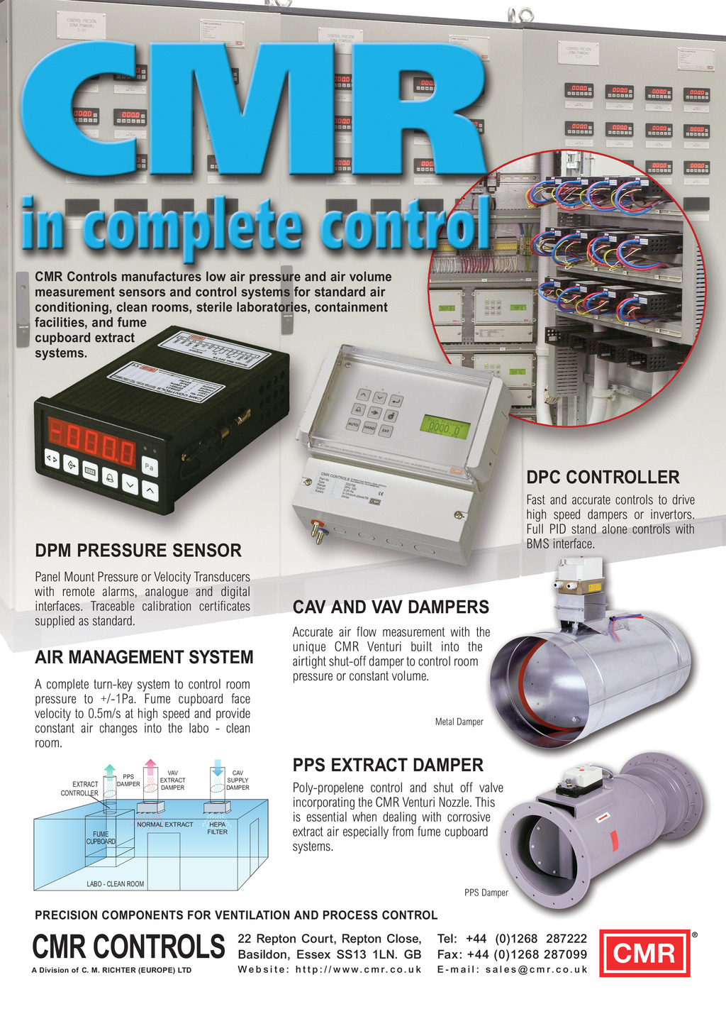CMR Controls manufactures low air pressure and air volume measurement sensors and control systems for standard air conditioning, clean rooms, sterile laboratories, containment facilities, and fume cupboard extract systems. DPC CONTROLLER Fast and accurate controls to drive high speed dampers or invertors. Full PID stand alone controls with BMS interface. DPM PRESSURE SENSOR Panel Mount Pressure or Velocity Transducers with remote alarms, analogue and digital interfaces. Traceable calibration certificates supplied as standard. AIR MANAGEMENT SYSTEM A complete turn-key system to control room pressure to +/-1Pa. Fume cupboard face velocity to 0.5m/s at high speed and provide constant air changes into the labo - clean room. EXTRACT CONTROLLER PPS DAMPER VAV EXTRACT DAMPER NORMAL EXTRACT FUME CUPBOARD CAV SUPPLY DAMPER HEPA FILTER CAV AND VAV DAMPERS Accurate air flow measurement with the unique CMR Venturi built into the airtight shut-off damper to control room pressure or constant volume. Metal Damper PPS EXTRACT DAMPER Poly-propelene control and shut off valve incorporating the CMR Venturi Nozzle. This is essential when dealing with corrosive extract air especially from fume cupboard systems. LABO - CLEAN ROOM PPS Damper PRECISION COMPONENTS FOR VENTILATION AND PROCESS CONTROL CMR CONTROLS 22 Repton Court, Repton Close, Basildon, Essex SS13 1LN. GB Tel: +44 (0)1268 287222 Fax: +44 (0)1268 287099 A Division of C. M. RICHTER (EUROPE) LTD W e b s i t e : h t t p : / / w w w. c m r . c o . u k E - m a i l : s a l e s @ c m r. c o. u k 56 January 2021 www.cibsejournal.com p56.CIBSEMagJan21.indd 56 15/12/2020 16:54